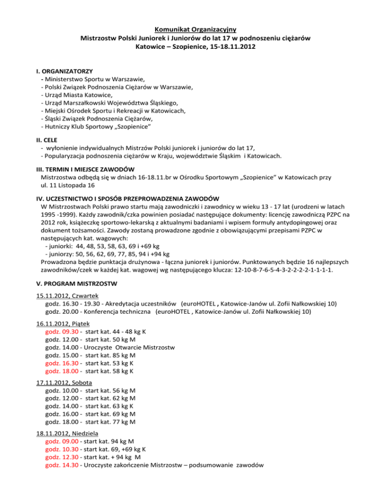 Komunikat Organizacyjny Mistrzostw Polski Juniorek i Juniorów do lat 17 w podnoszeniu ciężarów Katowice – Szopienice, 15-18.11.2012 I. ORGANIZATORZY - Ministerstwo Sportu w Warszawie, - Polski Związek Podnoszenia Ciężarów w Warszawie, - Urząd Miasta Katowice, - Urząd Marszałkowski Województwa Śląskiego, - Miejski Ośrodek Sportu i Rekreacji w Katowicach, - Śląski Związek Podnoszenia Ciężarów, - Hutniczy Klub Sportowy „Szopienice” II. CELE - wyłonienie indywidualnych Mistrzów Polski juniorek i juniorów do lat 17, - Popularyzacja podnoszenia ciężarów w Kraju, województwie Śląskim i Katowicach. III. TERMIN I MIEJSCE ZAWODÓW Mistrzostwa odbędą się w dniach 16-18.11.br w Ośrodku Sportowym „Szopienice” w Katowicach przy ul. 11 Listopada 16 IV. UCZESTNICTWO I SPOSÓB PRZEPROWADZENIA ZAWODÓW W Mistrzostwach Polski prawo startu mają zawodniczki i zawodnicy w wieku 13 - 17 lat (urodzeni w latach 1995 -1999). Każdy zawodnik/czka powinien posiadać następujące dokumenty: licencję zawodniczą PZPC na 2012 rok, książeczkę sportowo-lekarską z aktualnymi badaniami i wpisem formuły antydopingowej oraz dokument tożsamości. Zawody zostaną prowadzone zgodnie z obowiązującymi przepisami PZPC w następujących kat. wagowych: - juniorki: 44, 48, 53, 58, 63, 69 i +69 kg - juniorzy: 50, 56, 62, 69, 77, 85, 94 i +94 kg Prowadzona będzie punktacja drużynowa - łączna juniorek i juniorów. Punktowanych będzie 16 najlepszych zawodników/czek w każdej kat. wagowej wg następującego klucza: 12-10-8-7-6-5-4-3-2-2-2-2-1-1-1-1. V. PROGRAM MISTRZOSTW 15.11.2012, Czwartek godz. 16.30 - 19.30 - Akredytacja uczestników (euroHOTEL , Katowice-Janów ul. Zofii Nałkowskiej 10) godz. 20.00 - Konferencja techniczna (euroHOTEL , Katowice-Janów ul. Zofii Nałkowskiej 10) 16.11.2012, Piątek godz. 09.30 - start kat. 44 - 48 kg K godz. 12.00 - start kat. 50 kg M godz. 14.00 - Uroczyste Otwarcie Mistrzostw godz. 15.00 - start kat. 85 kg M godz. 16.30 - start kat. 53 kg K godz. 18.00 - start kat. 58 kg K 17.11.2012, Sobota godz. 10.00 - start kat. 56 kg M godz. 12.00 - start kat. 62 kg M godz. 14.00 - start kat. 63 kg K godz. 16.00 - start kat. 69 kg M godz. 18.00 - start kat. 77 kg M 18.11.2012, Niedziela godz. 09.00 - start kat. 94 kg M godz. 10.30 - start kat. 69, +69 kg K godz. 12.30 - start kat. + 94 kg M godz. 14.30 - Uroczyste zakończenie Mistrzostw – podsumowanie zawodów Przypominamy, że ważenie poszczególnych kategorii wagowych odbywa się na 2 godziny przed planowanym startem w Ośrodku Sportowym „Szopienice” w Katowicach, ul. 11 Listopada 16. Program minutowy może ulec zmianie po weryfikacji list startowych na konferencji technicznej. VI. ZAKWATEROWANIE I WYŻYWIENIA Cena osobodnia: 100 zł (nocleg - 45 zł, obiad - 25 zł, kolacja - 15 zł, śniadanie - 15 zł). Zakwaterowanie: - Eurohotel i Hotel Jantor - Katowice-Janów ul. Zofii Nałkowskiej 10 (ok. 3 km od hali zawodów) - euroHOTEL Sosnowiec ul. Broniewskiego (około 12 km ) Ilość miejsc w poszczególnych hotelach ograniczona – decyduje kolejność składania zamówień. VII. ZGŁOSZENIE DO UDZIAŁU W ZAWODACH Zgłoszenia imienne zawodników oraz rezerwację noclegów i wyżywienia prosimy dokonać najpóźniej do dnia 06.11.2012r. drogą mailową: [email protected] wyłącznie na załączonym druku. Prosimy również o podanie danych płatnika do faktury, co ułatwi i przyspieszy akredytację. VIII. STARTOWE Od każdej zawodniczki i zawodnika oraz osób towarzyszących będzie pobierane startowe – 30 zł zgodnie z regulaminem PZPC w biurze zawodów - miejscu akredytacji. IX. NAGRODY Za zajęcie miejsca 1-3 w każdej kategorii wagowej wręczone zostaną medale dla zawodniczek i zawodników oraz dla ich trenerów. Za zajęcie miejsc 1-6 dyplomy. Pula nagród zgodnie ze założoną ofertą na organizację Mistrzostw Polski do lat 17. Zasady podziału nagród organizator poda na konferencji technicznej. W punktacji klubowej i wojewódzkiej wręczone zostaną puchary 1-3 i dyplomy 1-6. X. OBSŁUGA SĘDZIOWSKA Obsługę sędziowską zabezpiecza PZPC w Warszawie i Śląski Związek Podnoszenia Ciężarów w Tarnowskich Górach. XI. FINANSOWANIE Organizator pokrywa koszty organizacji zawodów. Koszty noclegów, wyżywienia, startowego uczestników pokrywają jednostki delegujące. Za zamówione i niewykorzystane miejsca noclegowe i wyżywienie będą obciążone jednostki zamawiające. XII. POSTANOWIENIE KOŃCOWE Uczestnicy powinni być ubezpieczeni od NW i OC. Organizator nie ponosi odpowiedzialności z tytułu ubezpieczenia zawodników, kradzieży, uszkodzenia bądź zagubienia sprzętu przez uczestników. Organizator zastrzega sobie prawo interpretacji w przypadku nieokreślonych w niniejszym regulaminie. Za ewentualne szkody przez uczestników zawodów, płatność na miejscu gotówką przez kierownika ekipy lub trenera. Osoby odpowiedzialne za Kontakt: Ginter PŁAZA - Prezes HKS „Szopienice” tel.606-800-900 , 792951805 Jerzy PLUTECKI - V-ce Prezes HKS „Szopienice” tel.664-763-739 Dionizy RUTKOWSKI- Trener tel.503-976-330 ORGANIZATOR