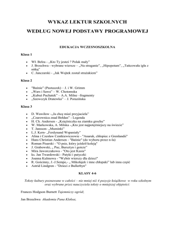 WYKAZ LEKTUR SZKOLNYCH WEDŁUG NOWEJ PODSTAWY PROGRAMOWEJ EDUKACJA WCZESNOSZKOLNA Klasa 1 Wł. Bełza - ,,Kto Ty jesteś ? Polak mały” J. Brzechwa - wybrane wiersze – ,,Na straganie”, ,,Hipopotam”, ,,Tańcowała igła z nitką” C. Janczarski - „Jak Wojtek został strażakiem” Klasa 2 "Baśnie” (Pastuszek) – J. i W. Grimm „Wars i Sawa” – W. Chotomska „Kubuś Puchatek” – A.A. Milne –fragmenty „Szewczyk Dratewka” – J. Porazińska Klasa 3 D. Wawiłow -„Ja chcę mieć przyjaciela” „Czarownica znad Bełdan” - Legenda H. Ch. Andersen - „Księżniczka na ziarnku grochu” W. Markowska, A. Milska -„Kto jest najpotężniejszy na świecie” T. Jansson- „Muminki” L.J. Kern- „Ferdynand Wspaniały” Alina i Czesław Centkiewiczowie - "Anaruk, chłopiec z Grenlandii" Hans Christian Andersen - "Baśnie" (do wyboru przez n-la) Roman Pisarski - "O psie, który jeździł koleją" J. Grabowski, „ Puc, Bursztyn i goście” Mira Jaworczakowa - "Oto jest Kasia" ks. Jan Twardowski - Patyki i patyczki Joanna Kulmowa - "Wybór wierszy dla dzieci" R. Gościnny, J.-J.Sempe,- „ Mikołajek i inne chłopaki” lub inna część Astrid Lindgren - "Dzieci z Bullerbyn" KLASY 4-6 Teksty kultury poznawane w całości – nie mniej niż 4 pozycje książkowe w roku szkolnym oraz wybrane przez nauczyciela teksty o mniejszej objętości: Frances Hodgson Burnett Tajemniczy ogród; Jan Brzechwa Akademia Pana Kleksa; Carlo Collodi Pinokio; Roald Dahl Charlie i fabryka czekolady; Antonina Domańska Historia żółtej ciżemki; Irena Jurgielewiczowa Ten obcy; Stanisław Lem Bajki robotów; Clive Staples Lewis Lew, Czarownica i stara szafa; Astrid Lindgren Bracia Lwie Serce; Kornel Makuszyński Szatan z siódmej klasy; Aleksander Minkowski Dolina Światła; Ferenc Molnár Chłopcy z Placu Broni; Lucy Maud Montgomery Ania z Zielonego Wzgórza; Edmund Niziurski – wybrana powieść (np. Niewiarygodne przygody Marka Piegusa, Sposób na Alcybiadesa); Joanna Olech Dynastia Miziołków; Joanna Onichimowska – wybrana powieść(np. Duch starej kamienicy, Daleki rejs); René Goscinny, Jean-Jacques Sempé Mikołajek (wybór opowiadań z dowolnego tomu); Henryk Sienkiewicz W pustyni i w puszczy; Alfred Szklarski – wybrana powieść (np. Tomek w krainie kangurów); Dorota Terakowska Władca Lewawu; Mark Twain Przygody Tomka Sawyera; John Ronald Reuel Tolkien Hobbit, czyli tam i z powrotem; Juliusz Verne W 80 dni dookoła świata; Moony Witcher Dziewczynka z szóstego księżyca; Wybór mitów greckich, baśni i legend; wybór kolęd; wybór pieśni patriotycznych; wybór poezji, w tym utwory dla dzieci i młodzieży; film i widowisko teatralne z repertuaru dziecięcego; wybrane programy telewizyjne.