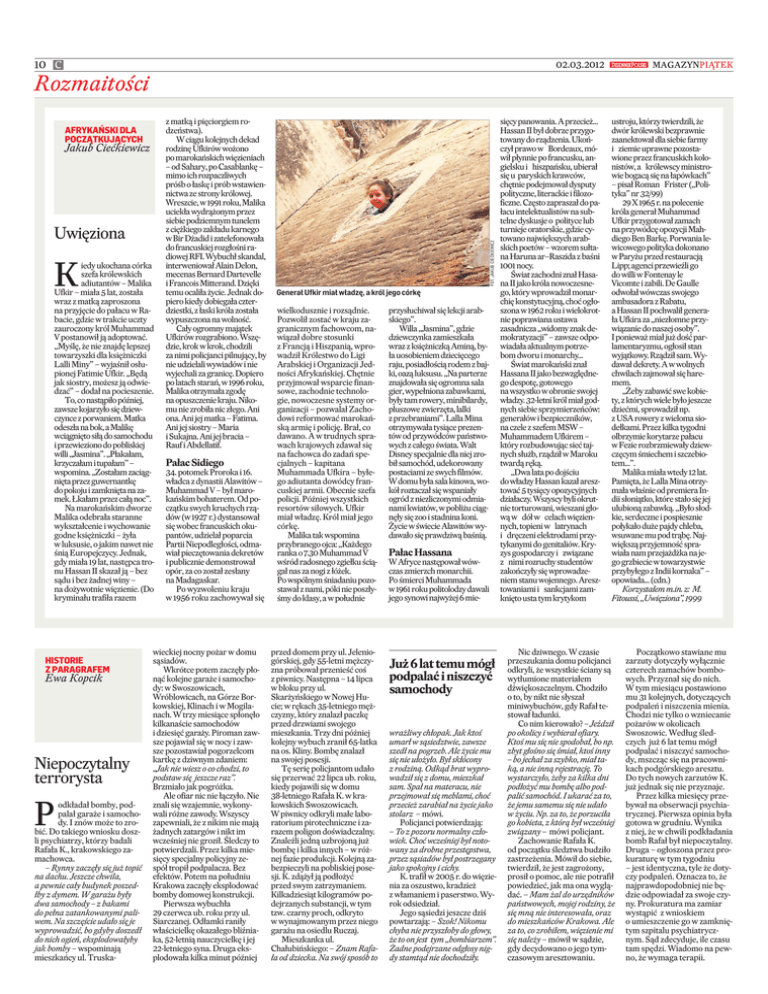 10 C 02.03.2012 AFRYKAŃSKI DLA POCZĄTKUJĄCYCH Jakub Ciećkiewicz Uwięziona K iedy ukochana córka szefa królewskich adiutantów – Malika Ufkir – miała 5 lat, została wraz z matką zaproszona na przyjęcie do pałacu w Rabacie, gdzie w trakcie uczty zauroczony król Muhammad V postanowił ją adoptować. „Myślę, że nie znajdę lepszej towarzyszki dla księżniczki Lalli Miny” – wyjaśnił osłupionej Fatimie Ufkir. „Będą jak siostry, możesz ją odwiedzać” – dodał na pocieszenie. To, co nastąpiło później, zawsze kojarzyło się dziewczynce z porwaniem. Matka odeszła na bok, a Malikę wciągnięto siłą do samochodu iprzewieziono do pobliskiej willi „Jasmina”. „Płakałam, krzyczałam itupałam” – wspomina. „Zostałam zaciągnięta przez guwernantkę dopokoju i zamknięta na zamek. Łkałam przez całą noc”. Na marokańskim dworze Malika odebrała staranne wykształcenie i wychowanie godne księżniczki – żyła w luksusie, o jakim nawet nie śnią Europejczycy. Jednak, gdy miała 19 lat, następca tronu Hassan II skazał ją – bez sądu i bez żadnej winy – na dożywotnie więzienie. (Do kryminału trafiła razem HISTORIE Z PARAGRAFEM Ewa Kopcik Niepoczytalny terrorysta P odkładał bomby, podpalał garaże i samochody. I znów może to zrobić. Do takiego wniosku doszli psychiatrzy, którzy badali Rafała K., krakowskiego zamachowca. – Rynny zaczęły się już topić na dachu. Jeszcze chwila, a pewnie cały budynek poszedłby z dymem. W garażu były dwa samochody – z bakami do pełna zatankowanymi paliwem. Na szczęście udało się je wyprowadzić, bo gdyby doszedł do nich ogień, eksplodowałyby jak bomby – wspominają mieszkańcy ul. Truska- z matką i pięciorgiem rodzeństwa). W ciągu kolejnych dekad rodzinę Ufkirów wożono po marokańskich więzieniach – od Sahary, po Casablankę – mimo ich rozpaczliwych próśb o łaskę i prób wstawiennictwa ze strony królowej. Wreszcie, w 1991 roku, Malika uciekła wydrążonym przez siebie podziemnym tunelem z ciężkiego zakładu karnego w Bir Dżadid i zatelefonowała do francuskiej rozgłośni radiowej RFI. Wybuchł skandal, interweniował Alain Delon, mecenas Bernard Dartevelle i Francois Mitterand. Dzięki temu ocaliła życie. Jednak dopiero kiedy dobiegała czterdziestki, z łaski króla została wypuszczona na wolność. Cały ogromny majątek Ufkirów rozgrabiono. Wszędzie, krok w krok, chodzili za nimi policjanci pilnujący, by nie udzielali wywiadów i nie wyjechali za granicę. Dopiero po latach starań, w 1996 roku, Malika otrzymała zgodę na opuszczenie kraju. Nikomu nie zrobiła nic złego. Ani ona. Ani jej matka – Fatima. Ani jej siostry – Maria i Sukajna. Ani jej bracia – Rauf i Abdellatif. Pałac Sidiego 34. potomek Proroka i 16. władca z dynastii Alawitów – Muhammad V – był marokańskim bohaterem. Od początku swych kruchych rządów (w 1927 r.) dystansował się wobec francuskich okupantów, udzielał poparcia Partii Niepodległości, odmawiał pieczętowania dekretów i publicznie demonstrował opór, za co został zesłany na Madagaskar. Po wyzwoleniu kraju w 1956 roku zachowywał się wieckiej nocny pożar w domu sąsiadów. Wkrótce potem zaczęły płonąć kolejne garaże i samochody: w Swoszowicach, Wróblowicach, na Górze Borkowskiej, Klinach i w Mogilanach. W trzy miesiące spłonęło kilkanaście samochodów i dziesięć garaży. Piroman zawsze pojawiał się w nocy i zawsze pozostawiał pogorzelcom kartkę z dziwnym zdaniem: „Jak nie wiesz o co chodzi, to podstaw się jeszcze raz”. Brzmiało jak pogróżka. Ale ofiar nic nie łączyło. Nie znali się wzajemnie, wykonywali różne zawody. Wszyscy zapewniali, że z nikim nie mają żadnych zatargów i nikt im wcześniej nie groził. Śledczy to potwierdzali. Przez kilka miesięcy specjalny policyjny zespół tropił podpalacza. Bez efektów. Potem na południu Krakowa zaczęły eksplodować bomby domowej konstrukcji. Pierwsza wybuchła 29 czerwca ub. roku przy ul. Siarczanej. Odłamki raniły właścicielkę okazałego bliźniaka, 52-letnią nauczycielkę i jej 22-letniego syna. Druga eksplodowała kilka minut później FOT. JAKUB CIEĆKIEWICZ Rozmaitości Generał Ufkir miał władzę, a król jego córkę wielkodusznie i rozsądnie. Pozwolił zostać w kraju zagranicznym fachowcom, nawiązał dobre stosunki z Francją i Hiszpanią, wprowadził Królestwo do Ligi Arabskiej i Organizacji Jedności Afrykańskiej. Chętnie przyjmował wsparcie finansowe, zachodnie technologie, nowoczesne systemy organizacji – pozwalał Zachodowi reformować marokańską armię i policję. Brał, co dawano. A w trudnych sprawach krajowych zdawał się na fachowca do zadań specjalnych – kapitana Muhammada Ufkira – byłego adiutanta dowódcy francuskiej armii. Obecnie szefa policji. Później wszystkich resortów siłowych. Ufkir miał władzę. Król miał jego córkę. Malika tak wspomina przybranego ojca: „Każdego ranka o 7.30 Muhammad V wśród radosnego zgiełku ściągał nas za nogi z łóżek. Po wspólnym śniadaniu pozostawał z nami, póki nie poszłyśmy do klasy, a w południe przed domem przy ul. Jeleniogórskiej, gdy 55-letni mężczyzna próbował przenieść coś z piwnicy. Następna – 14 lipca w bloku przy ul. Skarżyńskiego w Nowej Hucie; w rękach 35-letniego mężczyzny, który znalazł paczkę przed drzwiami swojego mieszkania. Trzy dni później kolejny wybuch zranił 65-latka na os. Kliny. Bombę znalazł na swojej posesji. Tę serię policjantom udało się przerwać 22 lipca ub. roku, kiedy pojawili się w domu 38-letniego Rafała K. w krakowskich Swoszowicach. W piwnicy odkryli małe laboratorium pirotechniczne i zarazem poligon doświadczalny. Znaleźli jedną uzbrojoną już bombę i kilka innych – w różnej fazie produkcji. Kolejną zabezpieczyli na pobliskiej posesji. K. zdążył ją podłożyć przed swym zatrzymaniem. Kilkadziesiąt kilogramó
