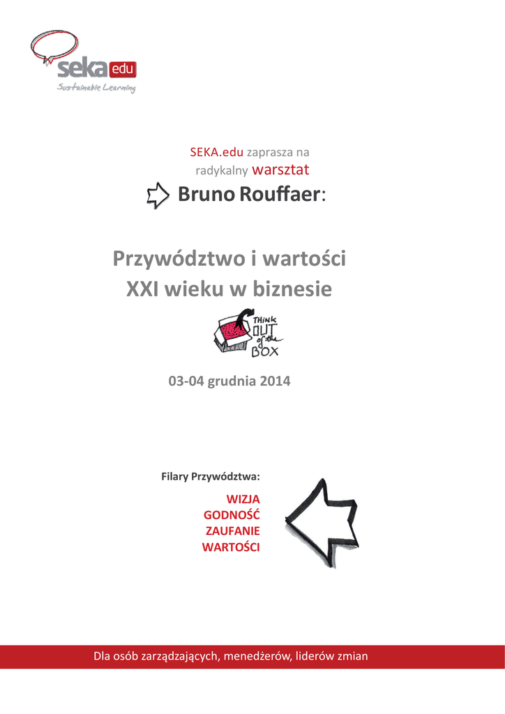 SEKA.edu zaprasza na radykalny warsztat Bruno Rouffaer: Przywództwo i wartości XXI wieku w biznesie 03-04 grudnia 2014 Filary Przywództwa: WIZJA GODNOŚĆ ZAUFANIE WARTOŚCI Dla osób zarządzających, menedżerów, liderów zmian Big Bad Boss Era is Over! W swojej właśnie wydanej książce Bruno Rouffaer pisze: „Chcę Cię zaprosić do rozważenia całkowitej zmiany w przywództwie. Dlaczego? Ponieważ dotychczasowy styl przywódczy niszczy ludzi. Balans między naszymi systemami (ekonomicznym, społecznym i kulturalnym) jest zaburzony. Już czas – dla dobra naszego i przyszłych pokoleń – poważnie pomyśleć, jak możemy działać inaczej – mając na uwadze długoterminowy zrównoważony rozwój. „To zadziwiające na ile sposobów przywódcy mogą się przyczynić do poprawy sytuacji na świecie” Moim zdaniem główne źródło problemów i nieodpowiedzialnych zachowań można przypisać 3 cechom - to chciwość, pycha i narcyzm. Trzy charakterystyki, które manifestują się przez całą historię ludzkości. Sprawiają, że ludzie w dużo większym stopniu, niż jakiekolwiek inne istoty na ziemi, mają negatywny wpływ na środowisko oraz na innych ludzi (...) – pisze Bruno Rouffaer w książce „No Way” komentując „The EnRich List” i pyta: Ale jest też nadzieja. Ziarno zmiany jest już widoczne. Jako przeciwwaga do egoistycznej, niszczycielskiej ekonomii przeszłości pojawia się nowa ekonomia - zrównoważona, zielona. Mówi się o niej czasami ekonomia „peer to peer”. „Na której liście chciałbyś być? * „Forbes TOP 100” ** czy „The EnRich List”? Mamy coraz więcej firm, w których ludzie pracują tak ciężko, jak dotychczas, a równocześnie możliwa jest dobra zabawa. W takich organizacjach pracownicy są traktowani przede wszystkim jak ludzie, nie jak jednostki produkcyjne. Menedżerowie nie mają już swoich oddzielnych gabinetów, pracownicy zarządzają sobą w samoregulujących się zespołach, a HR Manager jest znany jako Chief Happiness Officer. Oczywiście, że dla takiego rozwoju potrzebny jest odpowiedni kontekst. Ważne, że pierwsze sygnały postępu są wyraźnie zauważalne. Procesu przejścia od pychy, chciwości i narcyzmu w stronę altruizmu, skromności i balansu nie da się zanegować ani zatrzymać. Pytanie tylko, czy stare sposoby i nowe sposoby mogą stopniowo ewaluować tak, żeby Produkt Krajowy Brutto stał się z czasem Szczęściem Krajowym Brutto? Czy to możliwe, żeby wziąć, co najlepsze ze starego i z nowego systemu i stworzyć zrównoważoną koncepcję przyszłości? I czy możemy sobie pozwolić, by czekać jeszcze dłużej?” *Forbes TOP 100 – lista najbogatszych osób na świecie **The EnRich List – lista osób, które w największym stopniu przyczyniły się do poprawy sytuacji na świecie by Frédéric Williquet 1 Misja Bruno Rouffar Prywatnie razem z przyjaciółmi wspiera fundację Tomorrow4Isibani www.tomorrow4isibani.be, która zajmuje się głównie problemem AIDS w RPA. Wsparcie polega między innymi na organizacji eventów charytatywnych w Belgii oraz projekcie „5 euro na miesiąc”. Kwota w całości jest przekazywana na działalność fundacji. Bruno jest również partnerem farmy ekologicznej Nguni Boerdery, RPA. Bruno Rouffaer to wyjątkowa osobowość. Człowiek z pasją. Pełen kontrastów, jak Afryka, która jest jego drugim domem. Twardo stąpający po ziemi przedsiębiorca. Wrażliwy, godny zaufania partner biznesowy. Charyzmatyczny mówca. Wsłuchany w drugą osobę coach. Nieustępliwy negocjator. Aktywny filantrop. Inspirujący człowiek. Od ponad 20 lat aktywnie realizuje swoją misję BIG BAD BOSS ERA IS OVER: wspiera organizacje i liderów w wydobywaniu z ludzi tego, co w nich najlepsze. Pracuje z wyższą kadrą menedżerską jako consultant, coach, trener. Właśnie wydał książkę, w której porusza największe problemy współczesnego przywództwa: pychę, chciwość, narcyzm – i proponuje nowy model przywództwa oparty na wartościach. by Frédéric Williquet Istota przywództwa „Wyobraź sobie, że dzisiejszej nocy podczas snu Twoje serce przestanie bić... Jaka będzie reakcja Twoich pracowników? Czy będzie to dla nich wielka strata? Czy też powód do radości?” by Frédéric Williquet Bruno Rouffaer tak wyjaśnia istotę przywództwa: „Od dobrego przywódcy emanuje godność, zaufanie, wizja, wartości. Przewodzi raczej razem ze swoimi ludźmi niż nad nimi góruje. Dzięki takiemu podejściu sprawia, że zarówno sam, jak i jego zespół – są silniejsi. Dobry lider nie ma nic przeciwko, gdy ktoś z zespołu posiada wiedzę, której on nie ma. Wprost przeciwnie. Dobry lider wywołuje dyskusje, motywuje ludzi, by dzielili się swoimi pomysłami, by cała wiedza, którą ma zespół na dany temat mogła być wyartykułowana przed podjęciem decyzji. Dobry lider zachęca do otwartej komunikacji, tworzy atmosferę zaufania, w której każdy może się swobodnie wypowiedzieć. Słucha ludzi, uwzględnia ich opinie i na tej podstawie oraz własnej wiedzy podejmuje decyzje. Bo ostatecznie rolą lidera jest sztuka podejmowania właściwych decyzji.” 2 Profil uczestnika Warsztat skierowany jest do wyższej kadry zarządzającej: • osób zarządzających: prezesów, dyrektorów, członków zarządów, właścicieli firm • menedżerów odpowiedzialnych za formułowanie lub wdrażanie strategii firmy • liderów zmian by Frédéric Williquet Korzyści • dowiesz się, które z globalnych trendów najbardziej wpłyną na sposób prowadzenia biznesu i zarządzania ludźmi „Bądź zmianą, którą chcesz widzieć w świecie” • poznasz różnicę między klasycznym liderem (którego autorytet oparty jest na strukturze hierarchii i władzy), a inspirującym liderem przyszłości (który opiera swój sposób współpracy z ludźmi na dialogu, szacunku i inspiracji) Gandhi • odpowiesz na pytanie, jak zintegrować nowy model przywództwa ze s