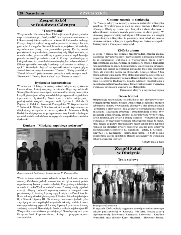 28 Nasze Jutro Z ¯YCIA SZKÓ£ Zespó³ Szkó³ w Bukówcu Górnym "Fredryma³ki" W styczniu br. Narodowy Teatr Edukacji zaprosi³ gimnazjalistów na przedstawienie pt. ,,Fredryma³ki". Jest to przeniesienie na scenê kilkunastu najciekawszych scen z komedii Aleksandra hrabiego Fredry. Artyci wybrali oryginalne postacie tworz¹ce barwn¹ galeriê ludzkich typów: Sarmaci, lichwiarze, wojskowi, lekkoduchy, wyrachowane damy i sentymentalne panny. Ka¿d¹ postaæ potraktowali indywidualnie, jako osobn¹ rolê. B³yskawicznie, na oczach widza, przeistaczali siê w grane postacie, wydobywaj¹c ponadczasowoæ przes³ania sztuk A. Fredry i podkrelaj¹c na ka¿dym kroku, ¿e ,,to nie ludzie nami rz¹dz¹, lecz w³asne s³aboci". Klimat spektaklu tworzy³y kostiumy stylizowane na ubiory ,,z epoki". Warto by³o obejrzeæ ten spektakl tak¿e i z tego wzglêdu, ¿e obok bardzo znanych utworów: "Zemsta", "luby panieñskie", "Pawe³ i Gawe³", pokazano nam postacie z ma³o znanych sztuk: "Rewolwer", "Nowy Don Kichot" czy "Pierwsza lepsza". Dyskoteka karnawa³owa W czwartek 15 lutego w naszej szkole odby³a siê dyskoteka karnawa³owa, której wszyscy uczniowie d³ugo wyczekiwali. Szczególne s³owa uznania i podziêkowania kierujemy do uczniów klasy II gimnazjum, którzy samodzielnie przygotowali nag³onienie i prowadzili dyskotekê. Sami wyszli z tak¹ inicjatyw¹ i profesjonalnie wszystko zorganizowali. Byli to: £. Maka³a, D. Zap³ata, K. Ka³ek i J. Sworacki. Pomagali im: W. Wojciechowski, T. Sobecki, £. Walter, T. Stachowski, A. £uczak. Wychowawcom dziêkujemy za opiekê w czasie dyskoteki. Mamom z Rady Rodziców dziêkujemy za przygotowane losy loterii z drobnymi upominkami dla maluchów oraz napoje dla wszystkich uczestników dyskoteki. Konkurs "M³odzie¿ zapobiega po¿arom" Gminne zawody w siatkówkê Dn. 7 lutego odby³y siê zawody gminne w siatkówkê w Krzycku Wielkim. Rywalizowa³o w nich a¿ szeæ dru¿yn z Bukówca Górnego, D³u¿yny, Jezierzyc, Krzycka i dwie dru¿yny z W³oszakowic. Zespo³y zosta³y podzielone na dwie grupy. W pierwszej grupie zwyciê¿y³a dru¿yna z W³oszakowic, a w drugiej grupie dru¿yna z Krzycka i to pomiêdzy nimi odby³ siê mecz o pierwsze miejsce, w którym wygra³o Krzycko. Bukówiec zagra³ z Jezierzycami o V miejsce i zwyciê¿y³. Zbiórka z³omu W rodê 7 marca nasi rodzice przeprowadzili zbiórkê z³omu. Wczeniej przygotowalimy i rozwiesilimy og³oszenia z prob¹ do mieszkañców Bukówca o wystawienie przed domy niepotrzebnego z³omu. Rodzice spotkali siê w rodê o dziewi¹tej rano i zabrali siê do pracy, bo mieszkañcy jak co roku nie zawiedli. Spotka³a nas jednak niefortunna przygoda: kto nam podbiera³ z³om, ale wszystko dobrze siê skoñczy³o. Rodzice zebrali 5 ton z³omu i dziêki temu mamy 3060 z³otych na klasow¹ wycieczkê do Krakowa, któr¹ planujemy w maju. Bardzo dziêkujemy rodzicom, panu Telesforowi Dudzikowi, ksiêdzu Markowi Kanteckiemu i mieszkañcom Bukówca Górnego. Umo¿liwilicie nam wyjazd na wspania³¹ trzydniow¹ wyprawê do Ma³opolski. Uczniowie klasy V z wychowawczyni¹ Dzieñ Kobiet Mi³¹ tradycj¹ naszej szko³y jest od kilku lat apel przygotowywany wy³¹cznie przez panów z okazji Dnia Kobiet. Mog³ymy obejrzeæ kabaretowe numery w wykonaniu ch³opców z klas gimnazjalnych i debiutanta z klasy szóstej. Sala co chwilê wybucha³a miechem i oklaskami. Muzyczne przeboje i przedstawione scenki by³y doskonale dopracowane, p³ynne, niestremowane wypowiedzi, stroje, muzyka, gra wiate³ i dymne wstawki - wszystko ze sob¹ wspó³gra³o, by raczyæ nas wspania³¹ zabaw¹ przez ponad 40 minut. Fina³ nale¿a³ do panów pracuj¹cych w naszej szkole. Dwa zupe³nie ró¿ni¹ce siê klimatem utwory zapiewali dla nas przy w³asnym akompaniamencie panowie: D. Wandolski - gitara, T. Kiciñski skrzypce i £. Konieczny - harmonijka ustna. To by³o piêkne uwieñczenie ca³ego spektaklu. Bardzo dziêkujemy za wspania³¹ zabawê, ¿yczenia i kwiaty. Kobiety ma³e i du¿e Zespó³ Szkó³ w D³u¿ynie Tenis sto³owy Reprezentanci Bukówca z instruktorem K. Poprawskim Wiele lat temu szko³a nasza odnosi³a w tym konkursie znacz¹ce sukcesy. Od dawna jednak konkurs ten nie by³ w naszej gminie organizowany. I oto w tym roku odby³ siê. Etap gminny mia³ miejsce w szkole Krzycku Wielkim w dniu 2 marca. Z naszej szko³y pojechali czterej ch³opcy i odnieli ogromny sukces: w kategorii szkó³ podstawowych Andrzej Lipowy zaj¹³ I miejsce, a Pawe³ Koschel II, za w kategorii szkó³ gimnazjalnych Mariusz Lórych zaj¹³ miejsce II, a S³awek Lipowy III. Na zawody powiatowe jechali tylko zwyciêzcy w poszczególnyh kategoriach, tak wiêc w dniu 9 marca na etap powiatowy pojecha³ Andrzej Lipowy. I tym razem Andrzej zab³ysn¹³ - zakwalifikowa³ siê do fina³u, a w finale zaj¹³ miejsce III. Wszystkim zawodnikom gratulujemy! Gratulujemy te¿ panu Krzysztofowi Poprawskiemu, który przygotowywa³ zawodników. Zwyciêskie dziewczêta 31 stycznia 2007 r. odby³y siê gminne zawody w tenisa sto³owego szko³y podstawowej w Krzycku Wielkim. Nasz¹ szko³ê reprezentowa³y dziewczêta Katarzyna Rakowska i Karolina Poznaniak oraz ch³opcy Karol Migda³ek i S³awomir Sterna.