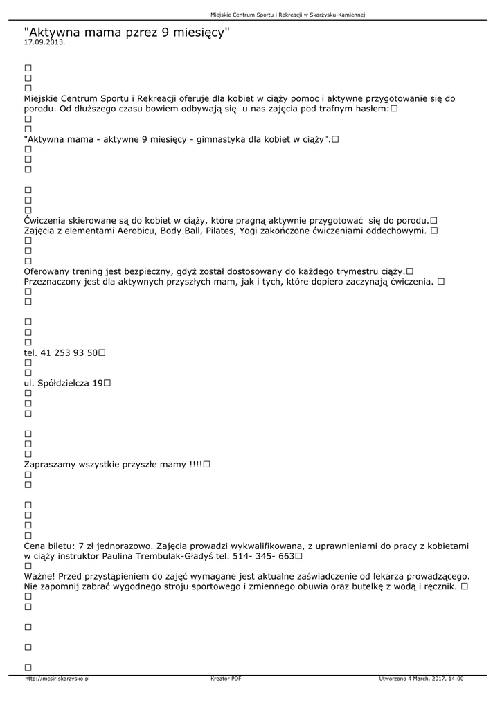 Miejskie Centrum Sportu i Rekreacji w Skarżysku-Kamiennej "Aktywna mama pzrez 9 miesięcy" 17.09.2013. Miejskie Centrum Sportu i Rekreacji oferuje dla kobiet w ciąży pomoc i aktywne przygotowanie się do porodu. Od dłuższego czasu bowiem odbywają się u nas zajęcia pod trafnym hasłem: "Aktywna mama - aktywne 9 miesięcy - gimnastyka dla kobiet w ciąży". Ćwiczenia skierowane są do kobiet w ciąży, które pragną aktywnie przygotować się do porodu. Zajęcia z elementami Aerobicu, Body Ball, Pilates, Yogi zakończone ćwiczeniami oddechowymi. Oferowany trening jest bezpieczny, gdyż został dostosowany do każdego trymestru ciąży. Przeznaczony jest dla aktywnych przyszłych mam, jak i tych, które dopiero zaczynają ćwiczenia. tel. 41 253 93 50 ul. Spółdzielcza 19 Zapraszamy wszystkie przyszłe mamy !!!! Cena biletu: 7 zł jednorazowo. Zajęcia prowadzi wykwalifikowana, z uprawnieniami do pracy z kobietami w ciąży instruktor Paulina Trembulak-Gładyś tel. 514- 345- 663 Ważne! Przed przystąpieniem do zajęć wymagane jest aktualne zaświadczenie od lekarza prowadzącego. Nie zapomnij zabrać wygodnego stroju sportowego i zmiennego obuwia oraz butelkę z wodą i ręcznik. http://mcsir.skarzysko.pl Kreator PDF Utworzono 4 March, 2017, 14:00 Miejskie Centrum Sportu i Rekreacji w Skarżysku-Kamiennej http://mcsir.skarzysko.pl Kreator PDF Utworzono 4 March, 2017, 14:00