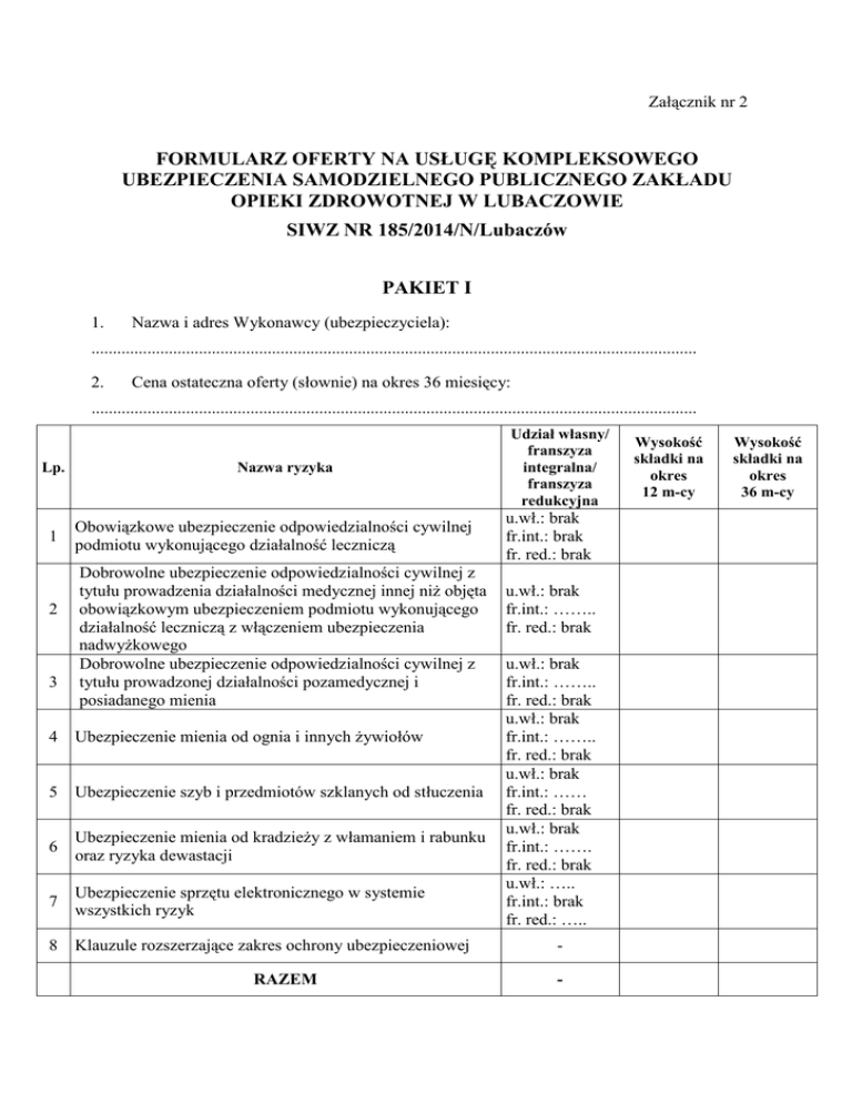 Załącznik nr 2 FORMULARZ OFERTY NA USŁUGĘ KOMPLEKSOWEGO UBEZPIECZENIA SAMODZIELNEGO PUBLICZNEGO ZAKŁADU OPIEKI ZDROWOTNEJ W LUBACZOWIE SIWZ NR 185/2014/N/Lubaczów PAKIET I 1. Nazwa i adres Wykonawcy (ubezpieczyciela): ............................................................................................................................................. 2. Cena ostateczna oferty (słownie) na okres 36 miesięcy: ............................................................................................................................................. Lp. 1 2 3 Nazwa ryzyka Obowiązkowe ubezpieczenie odpowiedzialności cywilnej podmiotu wykonującego działalność leczniczą Dobrowolne ubezpieczenie odpowiedzialności cywilnej z tytułu prowadzenia działalności medycznej innej niŜ objęta obowiązkowym ubezpieczeniem podmiotu wykonującego działalność leczniczą z włączeniem ubezpieczenia nadwyŜkowego Dobrowolne ubezpieczenie odpowiedzialności cywilnej z tytułu prowadzonej działalności pozamedycznej i posiadanego mienia 4 Ubezpieczenie mienia od ognia i innych Ŝywiołów 5 Ubezpieczenie szyb i przedmiotów szklanych od stłuczenia 6 Ubezpieczenie mienia od kradzieŜy z włamaniem i rabunku oraz ryzyka dewastacji 7 Ubezpieczenie sprzętu elektronicznego w systemie wszystkich ryzyk 8 Klauzule rozszerzające zakres ochrony ubezpieczeniowej RAZEM Udział własny/ franszyza integralna/ franszyza redukcyjna u.wł.: brak fr.int.: brak fr. red.: brak u.wł.: brak fr.int.: …….. fr. red.: brak u.wł.: brak fr.int.: …….. fr. red.: brak u.wł.: brak fr.int.: …….. fr. red.: brak u.wł.: brak fr.int.: …… fr. red.: brak u.wł.: brak fr.int.: ……. fr. red.: brak u.wł.: ….. fr.int.: brak fr. red.: ….. - Wysokość składki na okres 12 m-cy Wysokość składki na okres 36 m-cy 3. Sumy gwarancyjne, sumy ubezpieczenia oraz limity zgodnie z SIWZ 4. Ubezpieczenie mienia od ognia i innych Ŝywiołów Oświadczam, iŜ w ubezpieczeniu nieruchomości zastosowano stawkę …………………… Oświadczam, iŜ w ubezpieczeniu ruchomości zastosowano stawkę ………………………. (w %): (w %): 5. Ubezpieczenie sprzętu elektronicznego w systemie wszystkich ryzyk Sprzęt medyczny Oświadczam, iŜ w ubezpieczeniu sprzętu przenośnego zastosowano stawkę (w %): …..………… KLAUZULE ROZSZERZAJĄCE ZAKRES OCHRONY UBEZPIECZENIOWEJ Nazwa klauzuli 1. Klauzula przepięć 2. Klauzula reprezentantów 3. Klauzula automatycznego pokrycia 4. Klauzula stempla bankowego 5. Klauzula ograniczenia zasady proporcji 6. Klauzula Leeway’a Liczba pkt przypisana klauzuli Obligatoryjna Obligatoryjna Obligatoryjna Obligatoryjna Obligatoryjna Obligatoryjna 7. Klauzula podatku VAT Obligatoryjna 8. Klauzula dewastacji 9. Klauzula 10. 11. 12. 13. rozliczenia składki Klauzula wartości księgowej brutto Klauzula ubezpieczenia przezornej sumy ubezpieczenia Klauzula automatycznego pokrycia majątku nabytego po zebraniu danych do SIWZ Klauzula samolikwidacji małych szkód Obligatoryjna Obligatoryjna Obligatoryjna Obligatoryjna Obligatoryjna Obligatoryjna Składka za 12 m-cy Składka za Przyjęta 36 m-cy TAK/NIE Nazwa klauzuli 14. Klauzula płatności rat 15. Klauzula zniesienia 16. 17. 18. 19. 20. 21. zasady proporcji Klauzula zabezpieczeń przeciwpoŜarowych Klauzula zabezpieczeń przeciwkradzieŜowych Klauzula uderzenia pojazdu własnego Klauzula likwidacyjna w sprzęcie elektronicznym Klauzula niezawiadomienia w terminie o szkodzie Klauzula szybkiej likwidacji szkód 22. Klauzula jurysdykcji Liczba pkt przypisana klauzuli Składka za 12 m-cy Składka za Przyjęta 36 m-cy TAK/NIE 5 20 5 10 5 10 10 20 5 23. Klauzula zniszczenia przez obiekty sąsiadujące RAZEM 20 - - 6. Składka za ubezpieczenie zostanie rozłoŜona na 4 raty w kaŜdym okresie polisowania. 7. Wykonawca oświadcza, Ŝe zapoznał się z warunkami przetargu, uzyskał wszystkie informacje niezbędne do oszacowania ryzyka, przygotowania oferty i właściwego wykonania zamówienia oraz, Ŝe nie wnosi Ŝadnych zastrzeŜeń do Specyfikacji Istotnych Warunków Zamówienia. Wykonawca oświadcza równieŜ, Ŝe zapoznał się z zapisami Umowy Generalnej i w pełni akceptuje jej treść. 8. Wykonawca oświadcza, Ŝe jest związany niniejszą ofertą przez okres 30 dni od upływu terminu składania ofert. 9. Wykonawcza oświadcza, Ŝe do oferty mają zastosowanie następujące Ogólne Warunki Ubezpieczenia: 1. Dobrowolne ubezpieczenie odpowiedzialności cywilnej z tytułu prowadzenia działalności medycznej innej niŜ objęta obowiązkowym ubezpieczeniem podmiotu wykonującego działalność leczniczą z włączeniem ubezpieczenia nadwyŜkowego Obowiązujące OWU:……………………………………………………………, 2. Dobrowolne ubezpieczenie odpowiedzialności działalności pozamedycznej i posiadanego mienia cywilnej z tytułu prowadzonej Obowiązujące OWU:……………………………………………………………., 3. Ubezpieczenie mienia od ognia i innych Ŝywiołów Obowiązujące OWU:……………………………………………………………, 4. Ubezpieczenie szyb i przedmiotów szklanych od stłuczenia Obowiązujące OWU:……………………………………………………………, 5. Ubezpieczenie mienia od kradzieŜy z włamaniem i rabunku oraz ryzyka dewastacji Obowiązujące OWU:……………………………………………………………, 6. Ubezpieczenie sprzętu elektronicznego w systemie wszystkich ryzyk Obowiązujące OWU:……………………………………………………………., …....................................., …......................... …...................................................... Data Podpis i pieczęć Wykonawcy Miejscowość Załącznik Nr 3 FORMULARZ OFERTY NA USŁUGĘ KOMPLEKSOWEGO UBEZPIECZENIA SAMODZIELNEGO PUBLICZNEGO ZAKŁADU OPIEKI ZDROWOTNEJ W LUBACZOWIE SIWZ NR 185/2014/N/Lubaczów PAKIET II 1. Nazwa i