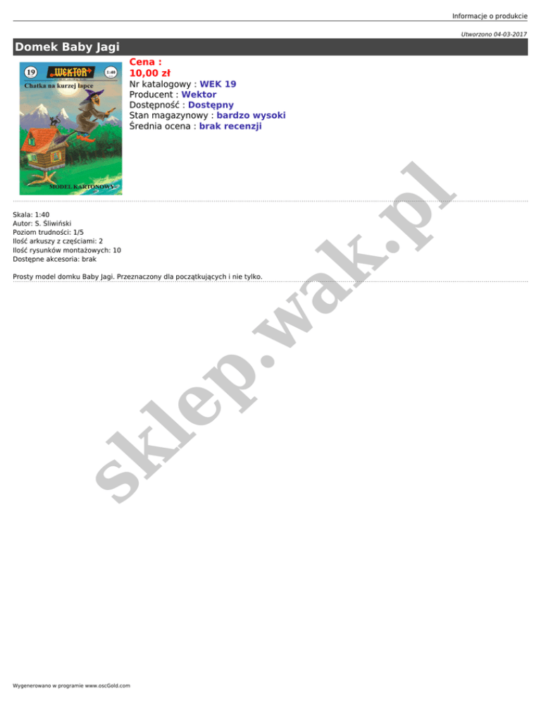 Informacje o produkcie Utworzono 04-03-2017 Domek Baby Jagi Cena : 10,00 zł pl Nr katalogowy : WEK 19 Producent : Wektor Dostępność : Dostępny Stan magazynowy : bardzo wysoki Średnia ocena : brak recenzji w ak . Skala: 1:40 Autor: S. Śliwiński Poziom trudności: 1/5 Ilość arkuszy z częściami: 2 Ilość rysunków montażowych: 10 Dostępne akcesoria: brak sk le p. Prosty model domku Baby Jagi. Przeznaczony dla początkujących i nie tylko. Wygenerowano w programie www.oscGold.com