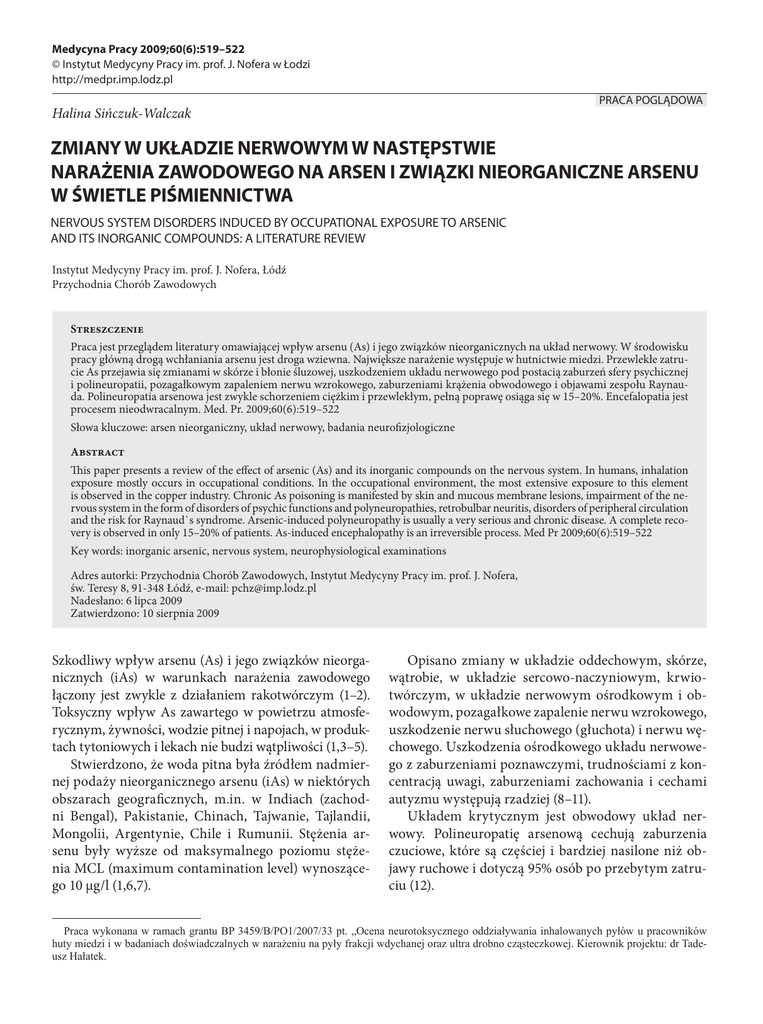 Medycyna Pracy 2009;60(6):519–522 © Instytut Medycyny Pracy im. prof. J. Nofera w Łodzi http://medpr.imp.lodz.pl PRACA POGLĄDOWA Halina Sińczuk-Walczak ZMIANY W UKŁADZIE NERWOWYM W NASTĘPSTWIE NARAŻENIA ZAWODOWEGO NA ARSEN I ZWIĄZKI NIEORGANICZNE ARSENU W ŚWIETLE PIŚMIENNICTWA NERVOUS SYSTEM DISORDERS INDUCED BY OCCUPATIONAL EXPOSURE TO ARSENIC AND ITS INORGANIC COMPOUNDS: A LITERATURE REVIEW Instytut Medycyny Pracy im. prof. J. Nofera, Łódź Przychodnia Chorób Zawodowych Streszczenie Praca jest przeglądem literatury omawiającej wpływ arsenu (As) i jego związków nieorganicznych na układ nerwowy. W środowisku pracy główną drogą wchłaniania arsenu jest droga wziewna. Największe narażenie występuje w hutnictwie miedzi. Przewlekłe zatrucie As przejawia się zmianami w skórze i błonie śluzowej, uszkodzeniem układu nerwowego pod postacią zaburzeń sfery psychicznej i polineuropatii, pozagałkowym zapaleniem nerwu wzrokowego, zaburzeniami krążenia obwodowego i objawami zespołu Raynauda. Polineuropatia arsenowa jest zwykle schorzeniem ciężkim i przewlekłym, pełną poprawę osiąga się w 15–20%. Encefalopatia jest procesem nieodwracalnym. Med. Pr. 2009;60(6):519–522 Słowa kluczowe: arsen nieorganiczny, układ nerwowy, badania neurofizjologiczne Abstract This paper presents a review of the effect of arsenic (As) and its inorganic compounds on the nervous system. In humans, inhalation exposure mostly occurs in occupational conditions. In the occupational environment, the most extensive exposure to this element is observed in the copper industry. Chronic As poisoning is manifested by skin and mucous membrane lesions, impairment of the nervous system in the form of disorders of psychic functions and polyneuropathies, retrobulbar neuritis, disorders of peripheral circulation and the risk for Raynaud`s syndrome. Arsenic-induced polyneuropathy is usually a very serious and chronic disease. A complete recovery is observed in only 15–20% of patients. As-induced encephalopathy is an irreversible process. Med Pr 2009;60(6):519–522 Key words: inorganic arsenic, nervous system, neurophysiological examinations Adres autorki: Przychodnia Chorób Zawodowych, Instytut Medycyny Pracy im. prof. J. Nofera, św. Teresy 8, 91-348 Łódź, e-mail: [email protected] Nadesłano: 6 lipca 2009 Zatwierdzono: 10 sierpnia 2009 Szkodliwy wpływ arsenu (As) i jego związków nieorganicznych (iAs) w warunkach narażenia zawodowego łączony jest zwykle z działaniem rakotwórczym (1–2). Toksyczny wpływ As zawartego w powietrzu atmosferycznym, żywności, wodzie pitnej i napojach, w produktach tytoniowych i lekach nie budzi wątpliwości (1,3–5). Stwierdzono, że woda pitna była źródłem nadmiernej podaży nieorganicznego arsenu (iAs) w niektórych obszarach geograficznych, m.in. w Indiach (zachodni Bengal), Pakistanie, Chinach, Tajwanie, Tajlandii, Mongolii, Argentynie, Chile i Rumunii. Stężenia arsenu były wyższe od maksymalnego poziomu stężenia MCL (maximum contamination level) wynoszącego 10 µg/l (1,6,7). Opisano zmiany w układzie oddechowym, skórze, wątrobie, w układzie sercowo-naczyniowym, krwiotwórczym, w układzie nerwowym ośrodkowym i obwodowym, pozagałkowe zapalenie nerwu wzrokowego, uszkodzenie nerwu słuchowego (głuchota) i nerwu węchowego. Uszkodzenia ośrodkowego układu nerwowego z zaburzeniami poznawczymi, trudnościami z koncentracją uwagi, zaburzeniami zachowania i cechami autyzmu występują rzadziej (8–11). Układem krytycznym jest obwodowy układ nerwowy. Polineuropatię arsenową cechują zaburzenia czuciowe, które są częściej i bardziej nasilone niż objawy ruchowe i dotyczą 95% osób po przebytym zatruciu (12). Praca wykonana w ramach grantu BP 3459/B/PO1/2007/33 pt. „Ocena neurotoksycznego oddziaływania inhalowanych pyłów u pracowników huty miedzi i w badaniach doświadczalnych w narażeniu na pyły frakcji wdychanej oraz ultra drobno cząsteczkowej. Kierownik projektu: dr Tadeusz Hałatek. 520 H. Sińczuk-Walczak Mechanizm toksycznego działania arsenu polega prawdopodobnie na hamowaniu aktywności enzymów mitochondrialnych, zaburzeniach procesów fosforylacji oksydacyjnej i zaburzeniach procesów metylacji (8,9). Nieliczne są badania ukierunkowane na ocenę skutków neurologicznych przewlekłego narażenia zawodowego. Narażenie zawodowe na arsen występuje w hutnictwie miedzi, ołowiu i cynku, w elektrowniach spalających węgiel o wysokiej zawartości As, w przemyśle chemicznym, włókienniczym, szklarskim i ceramicznym. Wśród innych grup zawodowych wymienić należy pracowników zatrudnionych przy produkcji niektórych środków ochrony roślin, w leśnictwie i przemyśle farmaceutycznym. Głównymi drogami wchłaniania są układ oddechowy i pokarmowy. Narażenie inhalacyjne następuje poprzez wdychanie stałych cząstek zawierających nieorganiczny arsen trój- lub pięciowartościowy. Wchłanianie As z przewodu pokarmowego odbywa się w następstwie spożycia żywności, wody pitnej i zażywania leków zawierających arsen (1,13,14). Biologicznym wskaźnikiem wchłaniania jest łączna wartość wydalanych w moczu stężeń nieorganicznego arsenu (iAs), kwasu metyloarsonowego (MMA) i dwumetyloarsenowego (DMA), których wzajemne proporcje mogą ulegać zmianom (13,14). W pojedynczych wzmiankach z lat 50. opisano 41 przypadków chorób układu nerwowego wywołanych narażeniem na arsen w USA, z których 7 było spowodowanych zawodowym narażeniem na roztwór arsenu podczas oprysków pestycydami (1). Podobne obserwacje poczynili w Japonii Oida (1957) oraz Hara i wsp. (1968), którzy u narażonych zawodowo na arsen opisali polineuropatie czuciowo-ruchowe i pozagałkowe zapalenie nerwu wzrokowego (1). Doniesienia o toksycznym działaniu nieorganicznych związków arsenu na układ nerwowy dotyczą głównie narażonych w przemyśle hutniczym. Feldman i wsp. (15) przeprowadzili badania 70 hutników zatrudnion