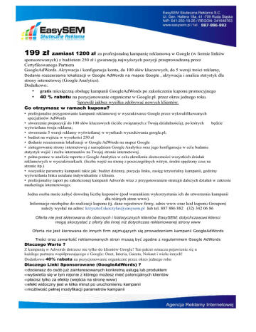 199 zł zamiast 1200 zł za profesjonalną kampanię reklamową w Google (w formie linków sponsorowanych) z budżetem 250 zł i gwarancją najwyższych pozycji przeprowadzoną przez Certyfikowanego Partnera GoogleAdWords. Aktywacja i konfiguracja konta, do 100 słów kluczowych, do 5 wersji treści reklamy, Dodanie rozszerzenia lokalizacji w Google AdWords na mapce Google , aktywacja i analiza statystyk dla strony internetowej (Google Analytics). Dodatkowo: • gratis miesięczną obsługę kampanii GoogleAdWords po zakończeniu kuponu promocyjnego • 40 % rabatu na pozycjonowanie organiczne w Google.pl. przez okres jednego roku. Sprawdź jakbez wysiłku zdobywać nowych klientów. Co otrzymasz w ramach kuponu? • profesjonalne przygotowanie kampanii reklamowej w wyszukiwarce Google przez wykwalifikowanych specjalistów AdWords • stworzenie propozycji do 100 słów kluczowych (ściśle związanych z Twoją działalnością), po których będzie wyświetlana twoja reklama; • stworzenie 5 wersji reklamy wyświetlanej w wynikach wyszukiwania google.pl; • budżet na wejścia w wysokości 250 zł • dodanie rozszerzenia lokalizacji w Google AdWords na mapce Google • zintegrowanie strony internetowej z narzędziem Google Analytics oraz jego konfiguracja w celu badania statystyk wejść i ruchu internautów na Twojej stronie internetowej. • pełna pomoc w analizie raportu z Google Analytics w celu określenia skuteczności wszystkich działań reklamowych w wyszukiwarkach. (liczba wejść na stronę z poszczególnych witryn, średni spędzony czas na stronie itp.) • wszystkie parametry kampanii takie jak: budżet dzienny, pozycja linku, zasięg terytorialny kampanii, godziny wyświetlania linku ustalane indywidualnie z klinem. • profesjonalny raport po zakończonej kampanii Adwords wraz z przygotowaniem strategii dalszych działań w zakresie marketingu internetowego; Jedna osoba może nabyć dowolną liczbę kuponów (pod warunkiem wykorzystania ich do utworzenia kampanii dla różnych stron www). Informacje niezbędne do realizacji kuponu (tj. dane rejestrowe firmy, adres www oraz kod kuponu Groupon) należy wysłać na adres: [email protected] lub tel. 887 886 882 (32) 342 06 86 Oferta nie jest skierowana do obecnych i historycznych klientów EasySEM; dotychczasowi klienci mogą skorzystać z oferty dla innej niż dotychczas reklamowanej strony www Oferta nie jest kierowana do innych firm zajmujących się prowadzeniem kampanii GoogleAdWords Treści oraz zawartość reklamowanych stron muszą być zgodne z regulaminem Google AdWords Dlaczego Warto ? Z kampanią w Adwords dotrzesz nie tylko do klientów Google! Ten pakiet oznacza pojawienie się u każdego partnera współpracującego z Google: Onet, Interia, Gazeta, Nokaut i wielu innych! Dodatkowo 40% rabatu na pozycjonowanie organiczne przez okres jednego roku Dlaczego Linki Sponsorowane (GoogleAdWords) ? • docierasz do osób już zainteresowanych konkretną usługą lub produktem • wyświetla się w tym rejonie z którego możesz mieć potencjalnych klientów • płacisz tylko za efekty (wejścia na stronę www) • efekt widoczny jest w kilka minut po uruchomieniu kampanii • możliwość pełnej modyfikacji parametrów kampanii
