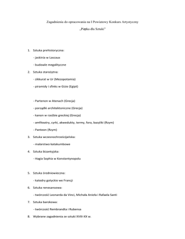 Zagadnienia do opracowania na I Powiatowy Konkurs Artystyczny „Piątka dla Sztuki” 1. Sztuka prehistoryczna: - jaskinia w Lascaux - budowle megalityczne 2. Sztuka starożytna: - zikkurat w Ur (Mezopotamia) - piramidy i sfinks w Gizie (Egipt) - Partenon w Atenach (Grecja) - porządki architektoniczne (Grecja) - kanon w rzeźbie greckiej (Grecja) - amfiteatry, cyrki, akwedukty, termy, fora, bazyliki (Rzym) - Panteon (Rzym) 3. Sztuka wczesnochrześcijańska: - malarstwo katakumbowe 4. Sztuka bizantyjska: - Hagia Sophia w Konstantynopolu 5. Sztuka średniowieczna: - katedry gotyckie we Francji 6. Sztuka renesansowa: - twórczość Leonarda da Vinci, Michała Anioła i Rafaela Santi 7. Sztuka barokowa: - twórczość Rembrandta i Rubensa 8. Wybrane zagadnienia ze sztuki XVIII-XX w. - Francisco Goya (romantyzm) - Jan Matejko (historyzm) - Claude Monet (impresjonizm) - Pablo Picasso (kubizm) - Salvadore Dali (surrealizm)