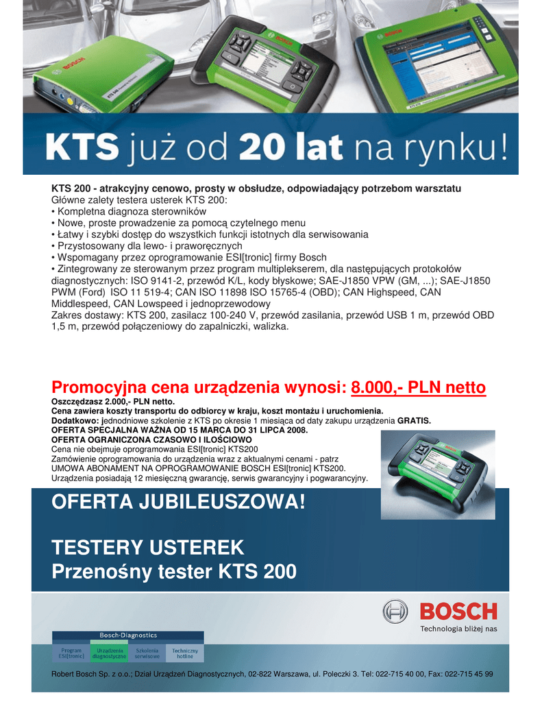 KTS 200 - atrakcyjny cenowo, prosty w obsłudze, odpowiadający potrzebom warsztatu Główne zalety testera usterek KTS 200: • Kompletna diagnoza sterowników • Nowe, proste prowadzenie za pomocą czytelnego menu • Łatwy i szybki dostęp do wszystkich funkcji istotnych dla serwisowania • Przystosowany dla lewo- i praworęcznych • Wspomagany przez oprogramowanie ESI[tronic] firmy Bosch • Zintegrowany ze sterowanym przez program multiplekserem, dla następujących protokołów diagnostycznych: ISO 9141-2, przewód K/L, kody błyskowe; SAE-J1850 VPW (GM, ...); SAE-J1850 PWM (Ford) ISO 11 519-4; CAN ISO 11898 ISO 15765-4 (OBD); CAN Highspeed, CAN Middlespeed, CAN Lowspeed i jednoprzewodowy Zakres dostawy: KTS 200, zasilacz 100-240 V, przewód zasilania, przewód USB 1 m, przewód OBD 1,5 m, przewód połączeniowy do zapalniczki, walizka. Promocyjna cena urządzenia wynosi: 8.000,- PLN netto Oszczędzasz 2.000,- PLN netto. Cena zawiera koszty transportu do odbiorcy w kraju, koszt montażu i uruchomienia. Dodatkowo: jednodniowe szkolenie z KTS po okresie 1 miesiąca od daty zakupu urządzenia GRATIS. OFERTA SPECJALNA WAŻNA OD 15 MARCA DO 31 LIPCA 2008. OFERTA OGRANICZONA CZASOWO I ILOŚCIOWO Cena nie obejmuje oprogramowania ESI[tronic] KTS200 Zamówienie oprogramowania do urządzenia wraz z aktualnymi cenami - patrz UMOWA ABONAMENT NA OPROGRAMOWANIE BOSCH ESI[tronic] KTS200. Urządzenia posiadają 12 miesięczną gwarancję, serwis gwarancyjny i pogwarancyjny. OFERTA JUBILEUSZOWA! TESTERY USTEREK Przenośny tester KTS 200 Robert Bosch Sp. z o.o.; Dział Urządzeń Diagnostycznych, 02-822 Warszawa, ul. Poleczki 3. Tel: 022-715 40 00, Fax: 022-715 45 99