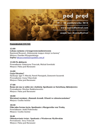 Poniedziałek (19/10) 12:00 Lekcja czytania z Grzegorzem Jankowiczem Raymond Roussel, „Dokumenty mające służyć za kanwę” Miejsce: Pawilon Wyspiańskiego Zapisy [email protected] 13:00 Po debiucie Prowadzenie: Katarzyna Trzeciak, Michał Sowiński Miejsce: Pałac pod Baranami 14:00 Czyja Ukraina? Dyskusja: Igor T. Miecik, Paweł Pieniążek, Ziemowit Szczerek Prowadzenie: Iryna Vikyrchak Miejsce: Pałac pod Baranami 17:00 Rosja nie ma w sobie nic z kobiety. Spotkanie ze Swietłaną Aleksijewicz Prowadzenie: Wacław Radziwinowicz Miejsce: Pałac pod Baranami 18:00 Wernisaż wystawy „Hannah Arendt. Ufność w człowieczeństwo” Miejsce: Goethe-Institut 18:30 Film jako forma życia. Spotkanie z Margarethe von Trottą Prowadzenie: Anita Piotrowska Miejsce: Goethe-Institut 20:00 Obłaskawianie świata. Spotkanie z Wiesławem Myśliwskim Prowadzenie: Jerzy Franczak Miejsce: Pałac pod Baranami 20:45 Pasmo filmowe Miejsce: Kino Pod Baranami Wtorek (20/10) 11:00 Lekcja czytania z Małgorzatą Łukasiewicz Rainer Maria Rilke, „Starożytny tors Apollina”, Partick Süskind, „Amnesia in litteris” Miejsce: Pawilon Wyspiańskiego Zapisy [email protected] 13:00 Po debiucie Prowadzenie: Katarzyna Trzeciak, Michał Sowiński Miejsce: Pałac pod Baranami 14:00 Żyjemy w raju. Spotkanie z Lukasem Bärfussem Prowadzenie: Arkadiusz Żychliński Miejsce: Pałac pod Baranami 15:00 Przemoc i wyobraźnia Dyskusja: Leonidas Donskis, Tomas Venclova Prowadzenie: Krzysztof Czyżewski Miejsce: Pałac pod Baranami 16:00 Konwój wygnańców. Spotkanie z Varujanem Vosganianem Prowadzenie: Dorota Kozicka Miejsce: Pałac pod Baranami 17:00 Jak czytać bardzo stare książki, by ich nie zniszczyć? Wykład: Earle Havens Miejsce: Pałac pod Baranami 18:00 Wernisaż wystawy: Jan Peter Tripp “Nieopowiedziane” Prowadzenie: Instytut Goethego Miejsce: Goethe-Institut 18:30 Tripp/Sebald: przemoc spojrzenia Dyskusja: Małgorzata Łukasiewicz, Jan Peter Tripp Prowadzenie: Magdalena Heydel Miejsce: Goethe-Institut 19:00 Wernisaż wystawy: „WOJNA!” Miejsce: Pasaż (Pasaż Bielaka) 19:30 Wojna w obrazkach Spotkanie: Krzysztof Gawronkiewicz, Mariusz Sołtysik, Marzena Sowa, Maciej Świerkocki Prowadzenie: Agnieszka Dauksza, Kamil Śmiałkowski Miejsce: Pasaż (Pasaż Bielaka) 20:00 Tłumacz kultur. Spotkanie z Hoomanem Majdem Prowadzenie: Marek Kęskrawiec Miejsce: Pałac pod Baranami 21:30 Pasmo filmowe Miejsce: Kino Pod Baranami Środa (21/10) 11:00 Lekcja czytania z Anną Wasilewską Georges Perec „Człowiek, który śpi” Miejsce: Pawilon Wyspiańskiego Zapisy [email protected] 12:00 Po debiucie Prowadzenie: Michał Sowiński Miejsce: Pałac pod Baranami 13:00 Polskie fikcje Dyskusja: Inga Iwasiów, Wit Szostak, Agnieszka Taborska Prowadzenie: Katarzyna Trzeciak Miejsce: Pałac pod Baranami 14:00 Bibliotheca Fictiva Wykład i prezentacja: Earle Havens Miejsce: Pałac pod Baranami 15:00 Ująć świat. Spotkanie z Tadeuszem Sławkiem Prowadzenie: Ryszard Koziołek Miejsce: Pałac pod Baranami 16:00 Wizytówki Joyce'a (wernisaż i dyskusja) Dyskusja: Krzysztof Bartnicki, Marcin Szmandra Prowadzenie: Grzegorz Olszański Miejsce: Pałac pod Baranami 17:00 Agon, czyli muza graczy Dyskusja: Igor Sarzyński, Jakub Szamałek Prowadzenie: Wojciech Orliński Miejsce: Pałac pod Baranami 18:00 Wernisaż: Gisèle Freund – sceny fotograficzne i portrety Wprowadzenie: Michał Paweł Markowski, Wojciech Nowicki Miejsce: Muzeum Narodowe w Krakowie 20:00 Postmodernizm nie jest tym, co myślisz. Spotkanie z Robertem Cooverem Prowadzenie: Agnieszka Taborska Miejsce: Pałac pod Baranami 21:30 Pasmo filmowe Miejsce: Kino Pod Baranami Czwartek (22/10) 11:00 Lekcja czytania z Agatą Bielik-Robson Gustaw Herling-Grudziński, „Dziennik pisany nocą” – fragmenty o Franzu Kafce Miejsce: Pawilon Wyspiańskiego Zapisy [email protected] 12:00 Po debiucie Prowadzenie: Katarzyna Trzeciak, Michał Sowiński Miejsce: Pałac pod Baranami 13:30 Jestem stąd, czyli skąd Dyskusja: Brygida Helbig, Henryk Waniek Prowadzenie: Piotr Śliwiński Miejsce: Pałac pod Baranami 15:00 Separatyści wszystkich krajów łączcie się Dyskusja: Marcin Koszałka, Zbigniew Libera Prowadzenie: Jakub Majmurek Miejsce: Pałac pod Baranami 16:00 Ślady judaizmu Dyskusja: Agata Bielik-Robson, Adam Lipszyc, Przemysław Tacik Prowadzenie: Ryszard Koziołek Miejsce: Pałac pod Baranami 18:00 Inna Afryka. Spotkanie z Kamelem Daoudem Prowadzenie: Olga Stanisławska Miejsce: Pałac pod Baranami 20:00 KRALL. Spotkanie z Hanną Krall Z udziałem Mariusza Szczygła, Wojciecha Tochmana Miejsce: Pałac pod Baranami 21:30 Pasmo filmowe Miejsce: Kino Pod Baranami Piątek (23/10) 11:00 Lekcja czytania z Kazimierą Szczuką Gabriela Zapolska, „Moralność Pani Dulskiej” Miejsce: Pawilon Wyspiańskiego Zapisy [email protected] 12:00 Po debiucie Prowadzenie: Katarzyna Trzeciak, Michał Sowiński Miejsce: Pałac pod Baranami 13:00 Syndrom Wileński. Spotkanie z Herkusem Kunčiusem Prowadzenie: Ziemowit Szczerek Miejsce: Pałac pod Baranami 14:00 Sylwa obojga narodów. Spotkanie z Kristiną Sabaliauskaite Prowadzenie: Michał Nogaś Miejsce: Pałac pod Baranami 15:00 ICORN. Spotkanie z Asly Ardogan Miejsce: Pałac pod Baranami 15:30 Bernhard, czyli my i oni Dyskusja: Sława Lisiecka, Monika Muskała Prowadzenie: Janusz Margański Miejsce: Pałac pod Baranami 17:00 Podróże konika morskiego. Spotkanie z Petrem Šabachem Prowadzenie: Szymon Kloska i Tomasz Pindel Miejsce: Pałac pod Baranami 18:30 Mesjasze. Spotkanie z Györgym Spiró Prowadzenie: Kazimiera Szczuka Miejsce: Pałac pod Baranami 21:30 Pasmo filmowe Miejsce: Kino Pod Baranami Sobota (24/10) 12:00 Pomelo. Spotkanie z Benjaminem Chaudem i Ramoną Badescu Prowadzenie: Tomasz Pindel Miejsce: Pałac pod Baranami 13:00 Nie wychodź z teatru Dyskusja: Jolanta Janiczak, Sebastian Majewski, Weronika Murek Prowadzenie: Justyna Nowicka Miejsce: Pałac pod Baranami 14:00 Cel: Lec Dyskusja: Lidia Kośka, Michał Paw