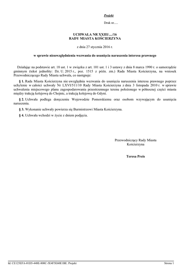 Projekt Druk nr..... UCHWAŁA NR XXIII/..../16 RADY MIASTA KOŚCIERZYNA z dnia 27 stycznia 2016 r. w sprawie nieuwzględnienia wezwania do usunięcia naruszenia interesu prawnego Działając na podstawie art. 18 ust. 1 w związku z art. 101 ust. 1 i 3 ustawy z dnia 8 marca 1990 r. o samorządzie gminnym (tekst jednolity: Dz. U. 2015 r., poz. 1515 z późn. zm.) Rada Miasta Kościerzyna, na wniosek Przewodniczącego Rady Miasta uchwala, co następuje: § 1. Rada Miasta Kościerzyna nie uwzględnia wezwania do usunięcia naruszenia interesu prawnego poprzez uchylenie w całości uchwały Nr LXVI/511/10 Rady Miasta Kościerzyna z dnia 3 listopada 2010 r. w sprawie uchwalenia miejscowego planu zagospodarowania przestrzennego terenu położonego w północnej części miasta między trakcją kolejową do Chojnic, a trakcją kolejową do Gdyni. § 2. Uchwała podlega doręczeniu Wojewodzie Pomorskiemu oraz osobom wzywającym do usunięcia naruszenia. § 3. Wykonanie uchwały powierza się Burmistrzowi Miasta Kościerzyna. § 4. Uchwała wchodzi w życie z dniem podjęcia. Przewodniczący Rady Miasta Kościerzyna Teresa Preis Id: CE125EFA-01D5-448E-800C-5E4F5E60E1BE. Projekt Strona 1 Uzasadnienie W dniu 15 grudnia 2015 r. do Rady Miasta Kościerzyna wpłynęło wezwanie do usunięcia naruszenia prawa wywołanego uchwałą Nr LXVI/511/10 z dnia 3 listopada 2010 r. w sprawie uchwalenia miejscowego planu zagospodarowania przestrzennego terenu położonego w północnej części miasta między trakcją kolejową do Chojnic, a trakcją kolejową do Gdyni, oraz granicami miasta. Wezwanie to należy rozpatrzyć w trybie art. 101 ustawy z dnia 8 marca 1990 r. o samorządzie gminnym, który stanowi w ust. 1: „Każdy, czyj interes prawny lub uprawnienie zostały naruszone uchwałą lub zarządzeniem podjętymi przez organ gminy w sprawie z zakresu administracji publicznej, może - po bezskutecznym wezwaniu do usunięcia naruszenia - zaskarżyć uchwałę lub zarządzenie do sądu administracyjnego”. Po wnikliwym przeanalizowaniu zarzutów zawartych w wezwaniu dotyczącym żądania uchylenia w całości uchwały Nr LXVI/511/10 Rady Miasta Kościerzyna z dnia 3 listopada 2010 r. w sprawie uchwalenia miejscowego planu zagospodarowania przestrzennego terenu położonego w północnej części miasta między trakcją kolejową do Chojnic, a trakcją kolejową do Gdyni, oraz granicami miasta, Rada Miasta Kościerzyna postanawia wyrazić negatywne stanowisko w przedmiocie uwzględnienia wezwania do usunięcia naruszenia ich interesu prawnego z uwagi na poniższe. Wzywajaca do usunięcia naruszenia prawa wskazała na: 1) Istotne naruszenie trybu sporządzenia miejscowego planu zagospodarowania przestrzennego w szczególności: a) nierozpatrzenie uwag zgłoszonych do projektu planu miejscowego, b) nieprecyzyjne oznaczenie w załączniku graficznym do uchwały granic oddzielających poszczególne obszary, a w szczególności nieprecyzyjne, oznaczenie granic zieleni izolacyjnej położonej na działkach 46 i 47 obręb 01 miasta Kościerzyna, 2) Naruszenie zasad sporządzenia planu miejscowego w szczególności: a) przekroczenie granic władztwa planistycznego w tym poprzez naruszenie zasady proporcjonalności oraz równości wobec prawa, prowadzące do naruszenia prawa własności przysługującego właścicielowi działki nr 46 w obrębie 01 miasta Kościerzyna, a tym samym naruszenie art. 21 ust. 1 (Art. 21. 1. Rzeczpospolita Polska chroni własność i prawo dziedziczenia) i art. 64 ust. 1 (1. Każdy ma prawo do własności, innych praw majątkowych oraz prawo dziedziczenia) i 3 (Własność może być ograniczona tylko w drodze ustawy i tylko w zakresie, w jakim nie narusza ona istoty prawa własności. Konstytucji RP, jak również art. 6 ust. 1 Europejskiej konwencji o ochronie praw człowieka i podstawowych wolności sporządzonej w Rzymie 4 listopada 1950 r (Dz. U. z 1993 Nr 61, poz. 284 ze zm.), b) nieuwzględnienie w toku sporządzenia uchwalenia miejscowego planu zagospodarowania przestrzennego wymagań o których mowa w art. 1 ust. 2 ustawy o planowaniu i zagospodarowaniu przestrzennym tj. w szczególności walorów ekonomicznych przestrzeni oraz prawa własności przysługującego właścicielom nieruchomości objętych planem, co w konsekwencji doprowadziło do niespełnienia celów zagospodarowania, a także naruszenie praw i wolności obywateli oraz innych wartości chronionych prawem. Odnosząc się do zarzutu o naruszenie trybu sporządzenia miejscowego planu zagospodarowania przestrzennego w odniesieniu do uchwalonego zgodnie uchwałą Nr LXVI/511/10 Rady Miasta Kościerzyna z dnia 3 listopada 2010 r. miejscowego planu zagospodarowania przestrzennego terenu położonego w północnej części miasta między trakcją kolejową do Chojnic, a trakcją kolejową do Gdyni oraz granicami miasta należy stwierdzić, że opracowanie planu odbyło się w oparciu o zasady określone w art. 17 ustawy o planowaniu i zagospodarowaniu przestrzennym i na żadnym etapie nie nastąpiło naruszenie trybu jego sporządzenia. Odnosząc się w szczególności do zarzutu nierozpatrzenia zgłoszonych do projektu planu uwag należy stwierdzić, że wszystkie zgłoszone w ustawowym terminie uwagi zostały rozpatrzone przez Burmistrza Miasta. Należy w tym miejscu zwrócić uwagę, że uwagami, które burmistrz ma obowiązek rozpatrzyć są uwagi złożone w trakcie wyłożenia projektu planu do publicznego wglądu oraz wniesione w terminie określonym w ogłoszeniu o wyłożeniu, ale nie krótszym niż 14 dni po zakończeniu wyłożenia projektu planu. Do omawianego projektu planu uwagi można było składać przez okres 14 dni po wyłożeniu projektu planu miejscowego do publicznego wglądu (złożone zostały cztery uwagi). Zgodnie z art. 17 pkt. 12 ustawy z dnia 27 marca 2003 r. o Id: CE125EFA-01D5-448E-800C-5E4F5E60E1BE. Projekt Strona 1 planowaniu i zagospodarowaniu przestrzennym (t. j. Dz. z 2015 r., poz. 199 z