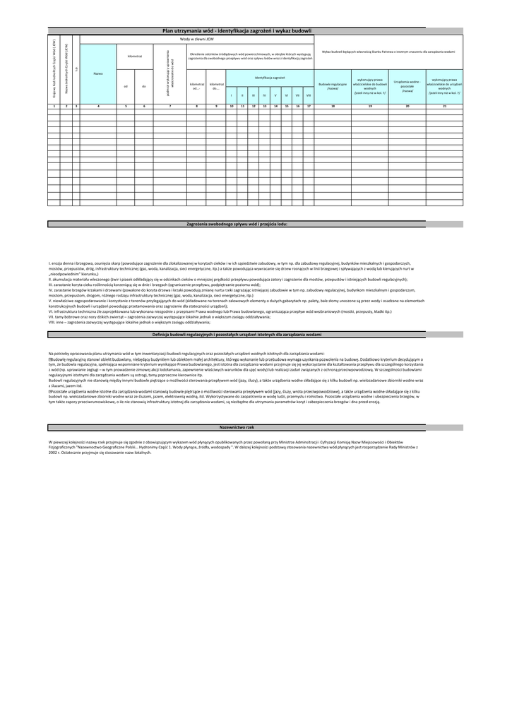 Plan utrzymania wód - identyfikacja zagrożeń i wykaz budowli Nazwa Jednolitych Części Wód (JCW) L.p. 1 2 3 kilometraż Nazwa 4 od do 5 6 podmiot wykonujący uprawnienia właścicieskie do wód Krajowy Kod Jednolitych Części Wód ( JCW) Wody w zlewni JCW 7 Wykaz budowli będących własnością Skarbu Państwa o istotnym znaczeniu dla zarządzania wodami Określenie odcinków śródlądowych wód powierzchniowych, w obrębie których występują zagrożenia dla swobodnego przepływu wód oraz spływu lodów wraz z identyfikacją zagrożeń Identyfikacja zagrożeń kilometraż od...- kilometraż do…. 8 9 I II III IV V VI VII VIII 10 11 12 13 14 15 16 17 Budowle regulacyjne /nazwa/ wykonujący prawa właścicielskie do budowli wodnych /jeżeli inny niż w kol. 7/ Urządzenia wodne pozostałe /nazwa/ wykonujący prawa właścicielskie do urządzeń wodnych /jeżeli inny niż w kol. 7/ 18 19 20 21 Zagrożenia swobodnego spływu wód i przejścia lodu: I. erozja denna i brzegowa, osunięcia skarp (powodujące zagrożenie dla zlokalizowanej w korytach cieków i w ich sąsiedztwie zabudowy, w tym np. dla zabudowy regulacyjnej, budynków mieszkalnych i gospodarczych, mostów, przepustów, dróg, infrastruktury technicznej (gaz, woda, kanalizacja, sieci energetyczne, itp.) a także powodująca wywracanie się drzew rosnących w linii brzegowej i spływających z wodą lub kierujących nurt w „nieodpowiednim” kierunku,) II. akumulacja materiału wleczonego (żwir i piasek odkładający się w odcinkach cieków o mniejszej prędkości przepływu powodująca zatory i zagrożenie dla mostów, przepustów i istniejących budowli regulacyjnych); III. zarastanie koryta cieku roślinnością korzeniącą się w dnie i brzegach (ograniczenie przepływu, podpiętrzanie poziomu wód); IV. zarastanie brzegów krzakami i drzewami (powalone do koryta drzewa i krzaki powodują zmianę nurtu rzeki zagrażając istniejącej zabudowie w tym np. zabudowy regulacyjnej, budynkom mieszkalnym i gospodarczym, mostom, przepustom, drogom, różnego rodzaju infrastruktury technicznej (gaz, woda, kanalizacja, sieci energetyczne, itp.) V. niewłaściwe zagospodarowanie i korzystanie z terenów przylegających do wód (składowane na terenach zalewowych elementy o dużych gabarytach np. palety, bale słomy unoszone są przez wody i osadzane na elementach konstrukcyjnych budowli i urządzeń powodując przetamowania oraz zagrożenie dla stateczności urządzeń); VI. infrastruktura techniczna źle zaprojektowana lub wykonana niezgodnie z przepisami Prawa wodnego lub Prawa budowlanego, ograniczająca przepływ wód wezbraniowych (mostki, przepusty, kładki itp.) VII. tamy bobrowe oraz nory dzikich zwierząt – zagrożenia zazwyczaj występujące lokalnie jednak o większym zasięgu oddziaływania; VIII. inne – zagrożenia zazwyczaj występujące lokalnie jednak o większym zasięgu oddziaływania; Definicja budowli regulacyjnych i pozostałych urządzeń istotnych dla zarządzania wodami Na potrzeby opracowania planu utrzymania wód w tym inwentaryzacji budowli regulacyjnych oraz pozostałych urządzeń wodnych istotnych dla zarządzania wodami: tym, że budowla regulacyjna, spełniająca wspomniane kryterium wynikające Prawa budowlanego, jest istotna dla zarządzania wodami przyjmuje się jej wykorzystanie dla kształtowania przepływu dla szczególnego korzystania z wód (np. uprawianie żeglugi – w tym prowadzenie zimowej akcji lodołamania, zapewnienie właściwych warunków dla ujęć wody) lub realizacji zadań związanych z ochroną przeciwpowodziową. W szczególności budowlami regulacyjnymi istotnymi dla zarządzania wodami są ostrogi, tamy poprzeczne kierownice itp. Budowli regulacyjnych nie stanowią między innymi budowle piętrzące o możliwości sterowania przepływem wód (jazy, śluzy), a także urządzenia wodne składające się z kilku budowli np. wielozadaniowe zbiorniki wodne wraz z śluzami, jazem itd. budowli np. wielozadaniowe zbiorniki wodne wraz ze śluzami, jazem, elektrownią wodną, itd. Wykorzystywane do zaopatrzenia w wodę ludzi, przemysłu i rolnictwa. Pozostałe urządzenia wodne i ubezpieczenia brzegów, w tym także zapory przeciwrumowiskowe, o ile nie stanowią infrastruktury istotnej dla zarządzania wodami, są niezbędne dla utrzymania parametrów koryt i zabezpieczenia brzegów i dna przed erozją. Nazewnictwo rzek W piewszej kolejności nazwy rzek przyjmuje się zgodnie z obowiązującym wykazem wód płynących opublikowanych przez powołaną przy Ministrze Adminsitracji i Cyfryzacji Komisję Nazw Miejscowości i Obiektów Fizjograficznych "Nazewnoctwo Geograficzne Polski... Hydronimy Część 1. Wody płynące, źródła, wodospady ". W dalszej kolejności podstawą stosowania nazewnictwa wód płynących jest rozporządzenie Rady Ministrów z 2002 r. Ostatecznie przyjmuje się stosowanie nazw lokalnych.