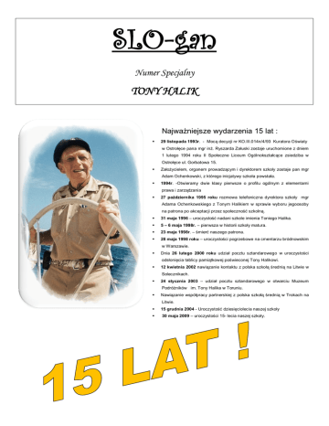 SLO-gan Numer Specjalny TONY HALIK Najważniejsze wydarzenia 15 lat : § 29 listopada 1993r. - Mocą decyzji nr KO.III.014n/4/93 Kuratora Oświaty w Ostrołęce pana mgr inż. Ryszarda Załuski zostaje uruchomione z dniem 1 lutego 1994 roku II Społeczne Liceum Ogólnokształcące zsiedziba w Ostrołęce ul. Gorbatowa 15. § Założycielem, organem prowadzącym i dyrektorem szkoły zostaje pan mgr Adam Ochenkowski, z którego inicjatywy szkoła powstała. § 1994r. -Otwieramy dwie klasy pierwsze o profilu ogólnym z elementami prawa i zarządzania § 27 października 1995 roku rozmowa telefoniczna dyrektora szkoły mgr Adama Ochenkowskiego z Tonym Halikiem w sprawie wyboru jegoosoby na patrona po akceptacji przez społeczność szkolną. § 31 maja 1996 – uroczystość nadani szkole imienia Toniego Halika. § 5 – 6 maja 1998r. – pierwsza w historii szkoły matura. § 23 maja 1998r. – śmierć naszego patrona. § 28 maja 1998 roku – uroczystości pogrzebowe na cmentarzu bródnowskim § Dnia 26 lutego 2000 roku udział pocztu sztandarowego w uroczystości § 12 kwietnia 2002 nawiązanie kontaktu z polska szkołą średnią na Litwie w § 24 stycznia 2003 – udział pocztu sztandarowego w otwarciu Muzeum § Nawiązanie współpracy partnerskiej z polska szkołą średnią w Trokach na w Warszawie. odsłonięcia tablicy pamiątkowej poświeconej Tony Halikowi. Solecznikach. Podróżników im. Tony Halika w Toruniu. Litwie. § 15 grudnia 2004 - Uroczystość dziesięciolecia naszej szkoły § 30 maja 2009 – uroczystości 15- lecia naszej szkoły. Spis treści: Życiorys Toniego Halika……………………………………………….str.3 Mapa podróży i opis podrózy Toniego Halka……………………….str.4-5 15-lecie szkoły………………………………………………………….str.6-7 Wywiad z dyrektorem szkoły………………………………………….str.8 Kadra pedagogiczna II SLO w Ostrołęce……………….…………...str.9 Moda……………………………………………………………………..str.10 Pozdrowienia uczniów………………………………………………….str.11 Podziękowania……………………………………………………….….str.12 Redaktorzy główni: Konrad Opęchowski Krystian Stobiński Redaktorzy: Sylwia Nadolna Filip Wołosz Marta Gniazdowska SLO-gan Str.2 Życiorys Toniego Halika Mieczysław Halik Warszawa, dn. 28 kwietnia 1996r. Były to filmy o ludziach i kulturach pierwotnych, o przyrodzie i najważniejszych wydarzeniach. W sumie zrealizowałem ponad 400 filmów dokumentalnych . W 1952 r. za zgodą władz polskich, przyjąłem obywatelstwo argentyńskie, które umożliwiło mi poruszanie się po całym świecie bez wiz i pozwoliło na wykonywanie zawodu dziennikarza. Polskę traktuję jako kraj ojczysty, miejsce mojego urodzenia, dlatego już w 1977r. otrzymałem „Kartę stałego pobytu” w Polsce. Posiadam tu własne mieszkanie. Od 22 lat prowadzę razem z Elżbietą Dzikowską, obywatelką polską, program telewizyjny „Pieprz i Wanilia”, który – jak wykazują sondaże – ogląda kilkanaście milionów Polaków w kraju i za granicą . Za całokształt mojej działalności otrzymałem szereg prestiżowych nagród i wyróżnień, m.in. „Wiktor 86”, „Złoty Ekran”, „Złotą Dziesiątkę” oraz w 1981 r. amerykańską nagrodę „The Humanittas Price”. Jestem autorem wielu książek o tematyce podróżniczej. Komitet Rodzicielski i Dyrekcja II Społecznego Liceum Ogólnokształcącego w Ostrołęce, zaproponowali mi objęcie patronatu nad tą szkołą. Formalnie przyjęła ona moje imię w maju 1996 roku. Przyszłe moje losy wiążę ze stałym pobytem w Polsce i pracą dla Polski . Syn Ozana Halik urodzony 05.01.1959 r. – dziennikarz, obywatel Stanów Zjednoczonych, obecnie mieszka w USA – Viena Virgina. Urodziłem się 24 stycznia 1921 roku z matki Heleny Krasuskiej i ojca Zbigniewa Halika, właściciela ziemskiego. Obydwoje rodzice byli narodowości polskiej, posiadali obywatelstwo polskie. Szkołę podstawową i średnią (im. Małachowskiego) ukończyłem w Płocku. W 1939 roku celem kontynuowania walki z okupantem hitlerowskim przedostałem się przez Rumunię do Francji, gdzie wstąpiłem do wojska polskiego. Z Francji, w 1940 r. przedostałem się do Wielkiej Brytanii, gdzie ukończyłem oficerską szkołę lotnictwa i służyłem w RAF-ie jako pilot myśliwski. Zostałem zestrzelony nad Francją, gdzie walczyłem o niepodległość w jej oddziałach partyzanckich. W 1943r. przekradając się przez Hiszpanię wróciłem do Wielkiej Brytanii, aby służyć w RAF-ie. W roku 1946 zawarłem związek małżeński z obywatelką francuską Pierette Andre’e Courtin-Halik. W 1959 r. urodził się nam syn. W 1948 r. zostałem zdemobilizowany w stopniu porucznika i z Wielkiej Brytanii wyemigrowałem do Argentyny, gdzie pracowałem jako pilot na taksówkach lotniczych. Oprócz pilotażu zajmowałem się również fotografiką i filmowaniem. Rozpocząłem pracę w czasopiśmie „Life” jako fotograf i operator filmowy. W 1950 r. z wydawnictwa „Life” przeszedłem do pracy w amerykańskiej sieci telewizyjnej NBC, dla której realizowałem filmy praktycznie na całym świecie. Źródło: „WSPOMNIENIA Z HALIKÓWKI” SLO-gan Str.3 Mapa podróży SLO-gan Str.4 Podróze Toniego Halika się ona w 1957 roku i trwała 1536 dni – przemierzyli 182 624 kilometry (ponad czterokrotna długość równika Ziemi) i wydali ponad 80 tysięcy dolarów. Zwiedzili wówczas 21 krajów, przekroczyli 140 rzek i bagien, wybudowali 14 mostów i zmienili 8 kompletów opon. Najwyżej dotarli na 5200 m n.p.m., podróżowali w temperaturach od -50 do +60°C. Podczas podróży używali namiotu Turin z nieprzemakalną podłogą i podwójnym dachem, który rozbijali 684 razy i spędzili w nim 1253 noce. Na zakończenie podróży (w 1962 roku), za kręgiem polarnym, wbili w 