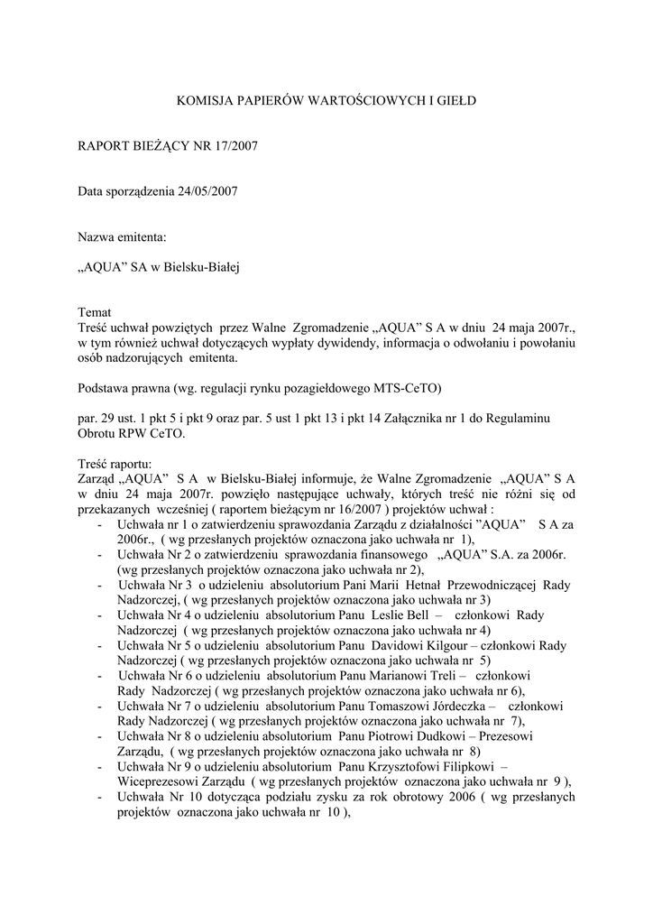 KOMISJA PAPIERÓW WARTOŚCIOWYCH I GIEŁD RAPORT BIEŻĄCY NR 17/2007 Data sporządzenia 24/05/2007 Nazwa emitenta: „AQUA” SA w Bielsku-Białej Temat Treść uchwał powziętych przez Walne Zgromadzenie „AQUA” S A w dniu 24 maja 2007r., w tym również uchwał dotyczących wypłaty dywidendy, informacja o odwołaniu i powołaniu osób nadzorujących emitenta. Podstawa prawna (wg. regulacji rynku pozagiełdowego MTS-CeTO) par. 29 ust. 1 pkt 5 i pkt 9 oraz par. 5 ust 1 pkt 13 i pkt 14 Załącznika nr 1 do Regulaminu Obrotu RPW CeTO. Treść raportu: Zarząd „AQUA” S A w Bielsku-Białej informuje, że Walne Zgromadzenie „AQUA” S A w dniu 24 maja 2007r. powzięło następujące uchwały, których treść nie różni się od przekazanych wcześniej ( raportem bieżącym nr 16/2007 ) projektów uchwał : - Uchwała nr 1 o zatwierdzeniu sprawozdania Zarządu z działalności ”AQUA” S A za 2006r., ( wg przesłanych projektów oznaczona jako uchwała nr 1), - Uchwała Nr 2 o zatwierdzeniu sprawozdania finansowego „AQUA” S.A. za 2006r. (wg przesłanych projektów oznaczona jako uchwała nr 2), - Uchwała Nr 3 o udzieleniu absolutorium Pani Marii Hetnał Przewodniczącej Rady Nadzorczej, ( wg przesłanych projektów oznaczona jako uchwała nr 3) - Uchwała Nr 4 o udzieleniu absolutorium Panu Leslie Bell – członkowi Rady Nadzorczej ( wg przesłanych projektów oznaczona jako uchwała nr 4) - Uchwała Nr 5 o udzieleniu absolutorium Panu Davidowi Kilgour – członkowi Rady Nadzorczej ( wg przesłanych projektów oznaczona jako uchwała nr 5) - Uchwała Nr 6 o udzieleniu absolutorium Panu Marianowi Treli – członkowi Rady Nadzorczej ( wg przesłanych projektów oznaczona jako uchwała nr 6), - Uchwała Nr 7 o udzieleniu absolutorium Panu Tomaszowi Jórdeczka – członkowi Rady Nadzorczej ( wg przesłanych projektów oznaczona jako uchwała nr 7), - Uchwała Nr 8 o udzieleniu absolutorium Panu Piotrowi Dudkowi – Prezesowi Zarządu, ( wg przesłanych projektów oznaczona jako uchwała nr 8) - Uchwała Nr 9 o udzieleniu absolutorium Panu Krzysztofowi Filipkowi – Wiceprezesowi Zarządu ( wg przesłanych projektów oznaczona jako uchwała nr 9 ), - Uchwała Nr 10 dotycząca podziału zysku za rok obrotowy 2006 ( wg przesłanych projektów oznaczona jako uchwała nr 10 ), - Uchwała Nr 11 o ustaleniu łącznej kwoty dywidendy oraz dnia dywidendy i terminu jej wypłaty ( wg przesłanych projektów oznaczona jako uchwała nr 11 ), Uchwała Nr 12 o przyznaniu nagrody rocznej Prezesowi Zarządu „AQUA” S A ( wg przesłanych projektów oznaczona jako uchwała nr 12), Uchwała Nr 13 o odwołaniu członka Rady Nadzorczej – Leslie Bella ( wg przesłanych projektów oznaczona jako uchwała nr 13), Równocześnie Zarząd informuje, że celem uzupełnienia składu Rady Nadzorczej Walne Zgromadzenie „AQUA” S A powzięło uchwały nr 14 i 15 ( według przesłanych projektów oznaczone tymi samymi numerami ) następującej treści: UCHWAŁA Nr 14 Działając na podstawie przepisu art. 385 § 1 Kodeksu spółek handlowych oraz § 31 Statutu „AQUA” S A w wyniku tajnego głosowania Walne Zgromadzenie postanawia: „W związku z odwołaniem członka Rady Nadzorczej Pana Leslie Bella, uzupełnić skład tego organu powołując Pana Kevina Starlinga na członka Rady Nadzorczej ”AQUA” S A na okres kolejnej kadencji .” UCHWAŁA Nr 15 Działając na podstawie przepisu art. 385 § 1 Kodeksu spółek handlowych oraz § 31 Statutu „AQUA” S A w wyniku tajnego głosowania Walne Zgromadzenie postanawia: „W związku z upływem kadencji Pana Davida Kilgour – członka Rady Nadzorczej uzupełnić skład tego organu powołując ponownie Pana Davida Kilgour na członka Rady Nadzorczej „AQUA” S A na okres kolejnej kadencji .” W związku z powyższym niniejszy raport jest równocześnie informacją o odwołaniu osoby nadzorującej emitenta – członka Rady Nadzorczej pana Leslie Bella ( uchwała nr 13) oraz o powołaniu pana Kevina Starlina w skład Rady Nadzorczej „AQUA” S A ( uchwała nr 14) a także o ponownym powołaniu w skład Rady Nadzorczej „AQUA” S A pana Davida Kilgour'a na kolejną jego kadencję (uchwała nr 15). Równocześnie informujemy, że w przypadku odwołania Pana Leslie Bell'a, akcjonariusz wnioskujący o odwołanie -United Utilities (Poland) B.V., jako podstawę odwołania wskazał, iż nastąpiła zmiana funkcji pełnionej przez pana Leslie Bella w firmie United Utilities i obecnie nie jest on już odpowiedzialny w tej firmie za operacje międzynarodowe. Działając w oparciu o postanowienia §19 ust.1 załącznika nr 1 do Regulaminu Obrotu RPW CeTO Zarząd przedstawia następujące informacje dotyczące w/ wym członków Rady Nadzorczej Kevina Starlinga i Davida Kilgour'a : Pan Kevin Starling – poczynając od 24.05.2007r. członek Rady Nadzorczej „AQUA” S A Wykształcenie i kwalifikacje: magister zarządzania działalnością usługową (MSc) Zajmowane wcześniej stanowiska wraz z opisem przebiegu pracy zawodowej: W ciągu ostatnich 3 lat dyrektor następujących Spółek: Aktisiaselts Tallinna Vesi, United Utilities Networks Limited, United Utilities Industrial (Gwent) Limited, United Utilities Energy Services Limited, United Utilities (I&C Solutions) Holdings Limited, United Utilities Contract Solutions Holdings Limited, United Utilities Facilities Management Limited, United Utilities Industrial Limited, United Utilities (Luxembourg) Sarl, United Utilities Waste Management Limited, United Utilities (Luxembourg) Sarl No2, United Utilities Investments BV, United Utilities (Sofia) BV. Obecnie dyrektor następujących spółek : Birchpoint No1, United Utilities International Limited, United Utilities (Overseas Holdings) Limited, United Utilities Australia Pty Ltd, United Utilities (Europe) Limited, United Utilities International Holdings Limited, United Utilities Australia Holdings BV, United Utilities BV, United Utilities Europe Holdings BV