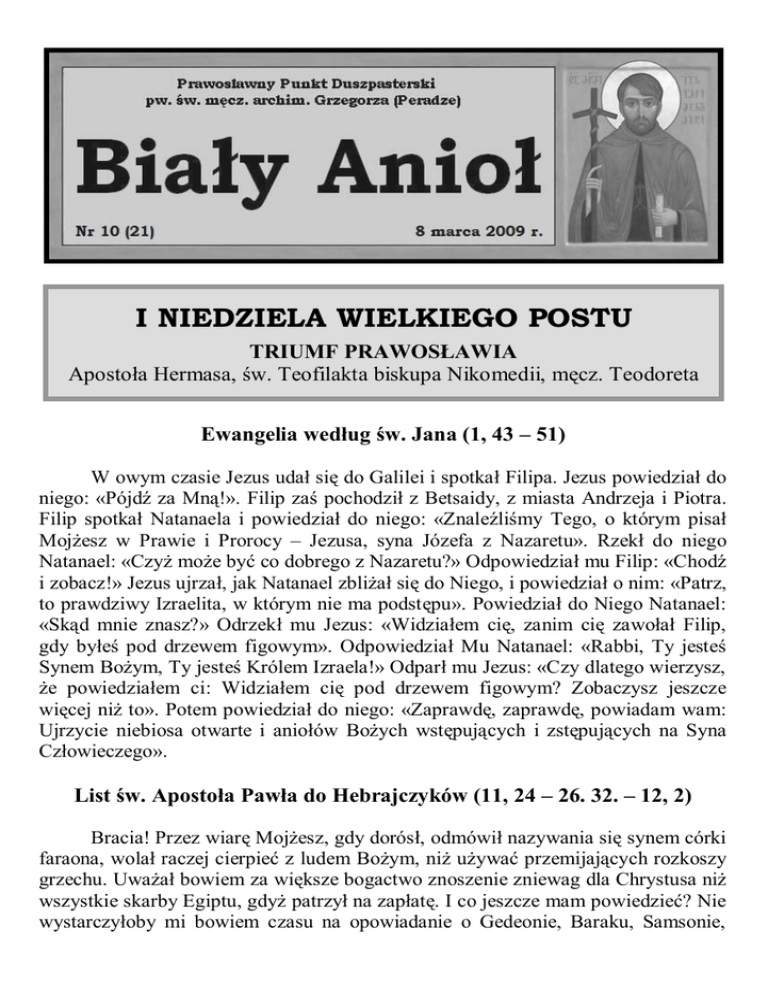 I NIEDZIELA WIELKIEGO POSTU TRIUMF PRAWOSŁAWIA Apostoła Hermasa, św. Teofilakta biskupa Nikomedii, męcz. Teodoreta Ewangelia według św. Jana (1, 43 – 51) W owym czasie Jezus udał się do Galilei i spotkał Filipa. Jezus powiedział do niego: «Pójdź za Mną!». Filip zaś pochodził z Betsaidy, z miasta Andrzeja i Piotra. Filip spotkał Natanaela i powiedział do niego: «Znaleźliśmy Tego, o którym pisał Mojżesz w Prawie i Prorocy – Jezusa, syna Józefa z Nazaretu». Rzekł do niego Natanael: «Czyż może być co dobrego z Nazaretu?» Odpowiedział mu Filip: «Chodź i zobacz!» Jezus ujrzał, jak Natanael zbliżał się do Niego, i powiedział o nim: «Patrz, to prawdziwy Izraelita, w którym nie ma podstępu». Powiedział do Niego Natanael: «Skąd mnie znasz?» Odrzekł mu Jezus: «Widziałem cię, zanim cię zawołał Filip, gdy byłeś pod drzewem figowym». Odpowiedział Mu Natanael: «Rabbi, Ty jesteś Synem Bożym, Ty jesteś Królem Izraela!» Odparł mu Jezus: «Czy dlatego wierzysz, że powiedziałem ci: Widziałem cię pod drzewem figowym? Zobaczysz jeszcze więcej niż to». Potem powiedział do niego: «Zaprawdę, zaprawdę, powiadam wam: Ujrzycie niebiosa otwarte i aniołów Bożych wstępujących i zstępujących na Syna Człowieczego». List św. Apostoła Pawła do Hebrajczyków (11, 24 – 26. 32. – 12, 2) Bracia! Przez wiarę Mojżesz, gdy dorósł, odmówił nazywania się synem córki faraona, wolał raczej cierpieć z ludem Bożym, niż używać przemijających rozkoszy grzechu. Uważał bowiem za większe bogactwo znoszenie zniewag dla Chrystusa niż wszystkie skarby Egiptu, gdyż patrzył na zapłatę. I co jeszcze mam powiedzieć? Nie wystarczyłoby mi bowiem czasu na opowiadanie o Gedeonie, Baraku, Samsonie, Jeftem, Dawidzie, Samuelu i o prorokach, którzy przez wiarę pokonali królestwa, dokonali czynów sprawiedliwych, otrzymali obietnicę, zamknęli paszcze lwom, przygasili żar ognia, uniknęli ostrza miecza i wyleczyli się z niemocy, stali się bohaterami w wojnie i do ucieczki zmusili nieprzyjacielskie szyki. Dzięki dokonanym przez nich wskrzeszeniom niewiasty otrzymały swoich zmarłych. Jedni ponieśli katusze, nie przyjąwszy uwolnienia, aby otrzymać lepsze zmartwychwstanie. Inni zaś doznali zelżywości i biczowania, a nadto kajdan i więzienia. Kamienowano ich, przerzynano piłą, , przebijano mieczem; tułali się w skórach owczych, kozich, w nędzy, w utrapieniu, w ucisku - świat nie był ich wart - i błąkali się po pustyniach i górach, po jaskiniach i rozpadlinach ziemi. A ci wszyscy, choć ze względu na swą wiarę stali się godni pochwały, nie otrzymali przyrzeczonej obietnicy, gdyż Bóg, który nam lepszy los zgotował, nie chciał, aby oni doszli do doskonałości bez nas. I my zatem mając dokoła siebie takie mnóstwo świadków, odłożywszy wszelki ciężar, grzech, który nas łatwo zwodzi, winniśmy wytrwale biec w wyznaczonych nam zawodach. Patrzmy na Jezusa, który nam w wierze przewodzi i ją wydoskonala. On to zamiast radości, którą Mu obiecywano, przecierpiał krzyż, nie bacząc na hańbę, i zasiadł po prawicy tronu Boga. TRIUMF PRAWOSŁAWIA Gdy kończy się pierwszy tydzień Wielkiego Postu, tydzień wzmożonej modlitwy i ascetycznych zmagań, następuje pierwsza niedziela Wielkiego Postu – niedziela Triumfu Prawosławia. W tym dniu Cerkiew prawosławna wspominając wydarzenia, które doprowadziły do ostatecznego ustanowienia dogmatów prawosławnych, pragnie podbudować duchowo i pocieszyć swoich wiernych owym duchowym świętem Triumfu Prawdziwej Wiary. Święto to zostało ustanowione w 843 roku w Konstantynopolu na pamiątkę zwycięstwa nad herezją ikonoklazmu, która wstrząsnęła całym Kościołem Chrystusowym. Pierwszy etap sporów ikonoklastycznych przypadł na rok 726, gdy to cesarz Leon III Izauryjczyk wystąpił przeciwko kultowi ikon i rozpoczął ciąg krwawych prześladowań, którym kres położyła cesarzowa Irena w 780 roku. Stanowisko zwolenników ikon podtrzymał również VII Sobór Powszechny, który odbył się w Nicei. Zgodnie z postanowieniami tego soboru cześć oddawana świętym ikonom nie jest bałwochwalstwem, wobec czego ikony powinny pozostawać w świątyniach i należy oddawać im taką samą cześć, jaka oddawana jest innym symbolom religijnym. Jednocześnie Cerkiew zaznaczyła różnicę między nabożeństwem, jakie przynależy jedynie Wszechmogącemu Bogu, a czcią, która oddawana jest Bogarodzicy, świętym, świętemu Krzyżowi, czy też świętym relikwiom. Wkrótce jednak nastał drugi okres prześladowania ikon, zapoczątkowany w 815 roku przez Leona V Armeńczyka. Trwał on do roku 842, gdy kult ikon zostały ponownie, tym razem już na stałe, przywrócony przez patriarchę Metodego i cesarzową Teodorę na soborze w Konstantynopolu. To właśnie ostateczne zwycięstwo świętych ikon jest świętem Triumfu Prawosławia. Poprzez to święto Cerkiew podkreśla jednocześnie Triumf Prawdziwej Wiary, jej zwycięstwa nad wszystkimi bezbożnymi herezjami, fałszywymi naukami i schizmami. Dlatego też mówimy, że tego dnia świętujemy zwycięstwo pojmowane nie w kategoriach ludzkich, lecz upamiętniamy wydarzenie, które odegrało ważną rolę w naszej wierze, które miało wielki wpływ na duchowość całej ludzkości. Duch nabożeństwa pierwszej niedzieli Wielkiego Postu jest duchem niebiańskiej proklamacji nadziei i ufności w Bogu. Jest to radość odnowy Cerkwi i jej nauki po wielu ofiarnych zmaganiach z herezjami. Święto Ortodoksji jest oddaniem czci wszystkim tym, którzy walczyli za prawą wiarę, oddali za nią swoje życie, a jednocześnie jest świętem wszystkich wiernych, którzy w czasach obecnych idą śladami swoich poprzedników i odnajdują w Świętym Prawosławiu błogosławieństwo, obecność Trójjedynego Boga, Bogarodzicy, męczenników i wszystkich świętych. o. hieromnich Tymoteusz (Sawczuk) Zdaniem Ojców i