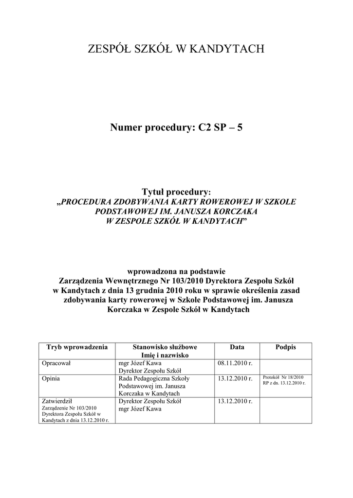 ZESPÓŁ SZKÓŁ W KANDYTACH Numer procedury: C2 SP – 5 Tytuł procedury: „PROCEDURA ZDOBYWANIA KARTY ROWEROWEJ W SZKOLE PODSTAWOWEJ IM. JANUSZA KORCZAKA W ZESPOLE SZKÓŁ W KANDYTACH” wprowadzona na podstawie Zarządzenia Wewnętrznego Nr 103/2010 Dyrektora Zespołu Szkół w Kandytach z dnia 13 grudnia 2010 roku w sprawie określenia zasad zdobywania karty rowerowej w Szkole Podstawowej im. Janusza Korczaka w Zespole Szkół w Kandytach Tryb wprowadzenia Opracował Opinia Zatwierdził Zarządzenie Nr 103/2010 Dyrektora Zespołu Szkół w Kandytach z dnia 13.12.2010 r. Stanowisko służbowe Imię i nazwisko mgr Józef Kawa Dyrektor Zespołu Szkół Rada Pedagogiczna Szkoły Podstawowej im. Janusza Korczaka w Kandytach Dyrektor Zespołu Szkół mgr Józef Kawa Data Podpis 08.11.2010 r. 13.12.2010 r. 13.12.2010 r. Protokół Nr 18/2010 RP z dn. 13.12.2010 r. WYKAZ ZMIAN W PROCEDURZE Nr wydania Nr zmiany Rozdział – strona Data zatwierdzenia Opis zmiany Podpis dyrektora Nr procedury ZESPÓŁ SZKÓŁ W KANDYTACH PROCEDURA C2 SP – 5 Procedura zdobywania karty rowerowej w Szkole Podstawowej im. Janusza Korczaka w Zespole Szkół w Kandytach Wydanie I 1.0 Podstawa prawna: 1. Ustawa Prawo o ruchu drogowym (Dz. U. z 1997 r. Nr 98, poz. 602 z późn. zm.): 1) art. 96, ust. 1 Dokumentem stwierdzającym uprawnienie do kierowania przez osobę, która nie ukończyła 18 lat: a) rowerem – jest karta rowerowa, motorowerowa lub prawo jazdy, b) motorowerem – jest karta motorowerowa lub prawo jazdy, c) pojazdem zaprzęgowym – jest prawo jazdy, karta motorowerowa lub rowerowa, jeżeli osoba uprawniona ukończyła 15 lat. 2) art. 96, ust. 2 Kartę rowerową lub motorowerową może uzyskać osoba, która wykazała się niezbędnymi kwalifikacjami i osiągnęła wymagany wiek: a) 10 lat w przypadku karty rowerowej, b) 13 lat w przypadku karty motorowerowej. 3) art. 97, ust. 2 Kartę rowerową wydaje nieodpłatnie dyrektor szkoły podstawowej , gimnazjum lub szkoły ponadgimnazjalnej, 4) art. 97, ust. 2a Kartę motorowerową wydaje nieodpłatnie dyrektor gimnazjum lub szkoły ponadgimnazjalnej, 5) art. 109, ust. 4 – Sprawdzenia kwalifikacji osoby ubiegającej się o kartę rowerową lub motorowerową dokonują: a) nauczyciel wychowania komunikacyjnego uprawniony przez dyrektora szkoły, b) policjant posiadający specjalistyczne przeszkolenie z zakresu ruchu drogowego, c) egzaminator. 2. Nie przewiduje się egzaminu dla uczniów w omawianym zakresie. 3. Od 1 września 1998 roku sprawdzenie kwalifikacji odbywa się w szkole podczas obowiązkowych zajęć z wychowania komunikacyjnego na lekcjach przedmiotu technika i zajęciach pozalekcyjnych w ciągu roku szkolnego (art. 109, ust. 4 Prawo o ruchu drogowym). 2.0 Program przygotowania uczniów do uzyskania karty rowerowej: 1. Zgodnie z założeniem wychowanie komunikacyjne realizowane jest w postaci: 1) zajęć teoretycznych, 2) zadań wytwórczych, 3) symulacyjnych ćwiczeń w szkolnej pracowni internetowej, 4) zajęć praktycznych (jazda rowerem) poza budynkiem szkolnym. 2. Cele nauczania: głównym celem jest przygotowanie uczniów do bezpiecznego i partnerskiego uczestnictwa w ruchu drogowym jako rowerzysty i wyrobienie odpowiedzialności za życie i zdrowie własne i innych. W wyniku działań dydaktyczno – wychowawczych uczniowie powinni: 1) poznać obowiązujące rowerzystę zasady i przepisy ruchu drogowego, 2) poznać zagrożenia występujące w ruchu drogowym i sposoby zapobiegania im, 3) poznać sposoby udzielania pierwszej pomocy, 4) umieć postępować na drodze zgodnie z zasadami ruchu drogowego, 5) umieć rozpoznawać zagrożenia i podejmować trafne decyzje, 6) umieć respektować prawa innych, 7) posiadać gotowość niesienia pomocy, 8) posiadać świadomość przestrzegania zasad i przepisów ruchu drogowego. 3. Treści nauczania: 1) wiadomości: a) warunki uzyskania karty rowerowej: ukończone 10 lat, znajomość obowiązujących zasad bezpiecznego poruszania się rowerzysty w ruchu drogowym, potwierdzenie posiadanych kwalifikacji, b) rower i jego wyposażenie: zalety i wady roweru, rodzaje rowerów, budowa roweru, układy: napędowy, jezdny, oświetleniowy, hamulcowy, zasady działania roweru, obowiązkowe wyposażenie roweru: oświetlenie z przodu i z tyłu roweru, światło pozycyjne, hamulce, sygnał dźwiękowy, dodatkowe wyposażenie roweru: elementy odblaskowe z boku kół, podstawowy zestaw narzędziowy, apteczka pierwszej pomocy. c) stan techniczny roweru i jego wpływ na bezpieczeństwo jazdy, d) zasady kierowania rowerem, e) zasady wykonywania poszczególnych manewrów przez rowerzystę: włączenie się do ruchu, skręcanie w prawo, skręcanie w lewo, wymijanie, omijanie, wyprzedzanie, zawracanie, zatrzymywanie, f) zasady i przepisy ruchu drogowego obowiązujące rowerzystę z uwzględnieniem sygnalizacji, oznakowania dróg, pierwszeństwa przejazdu, g) miejsca poruszania się rowerzysty, h) drogi i ścieżki rowerowe oraz ich oznakowanie, i) drogi dla pieszych i rowerzystów oraz ich oznakowanie, j) strefa zamieszkania oraz jej oznakowanie, k) drogi osiedlowe, l) pobocze prawej strony jezdni ogólnodostępnej, m) blisko krawędzi prawej strony jezdni, n) zasady bezpiecznego poruszania się rowerem w/w miejscach, o) zagrożenia w ruchu drogowym i sposoby ich zapobiegania, p) sposób zachowania w miejscu kolizji i wypadku, q) sposoby udzielania pierwszej pomocy. 2) umiejętności: a) rozpoznawanie układów w rowerze, ich mechanizmów i części, b) prawidłowy dobór przełożenia przekładni do jazdy w określonych warunkach, c) zamocowanie elementów odblaskowych na kole roweru, d) dobór podstawowego zestawy narzędziowego, e) dobór środków opatrunkowych, f) przygotowanie roweru do bezpiecznej jazdy (ustawienie kierownicy i siodełka, sprawdzenie opon, świateł, działania hamulców, łańcucha), g) utrzymanie dobrego stanu technicznego roweru poprzez konserwację bieżącą i okresową, h) prawidłowe kie