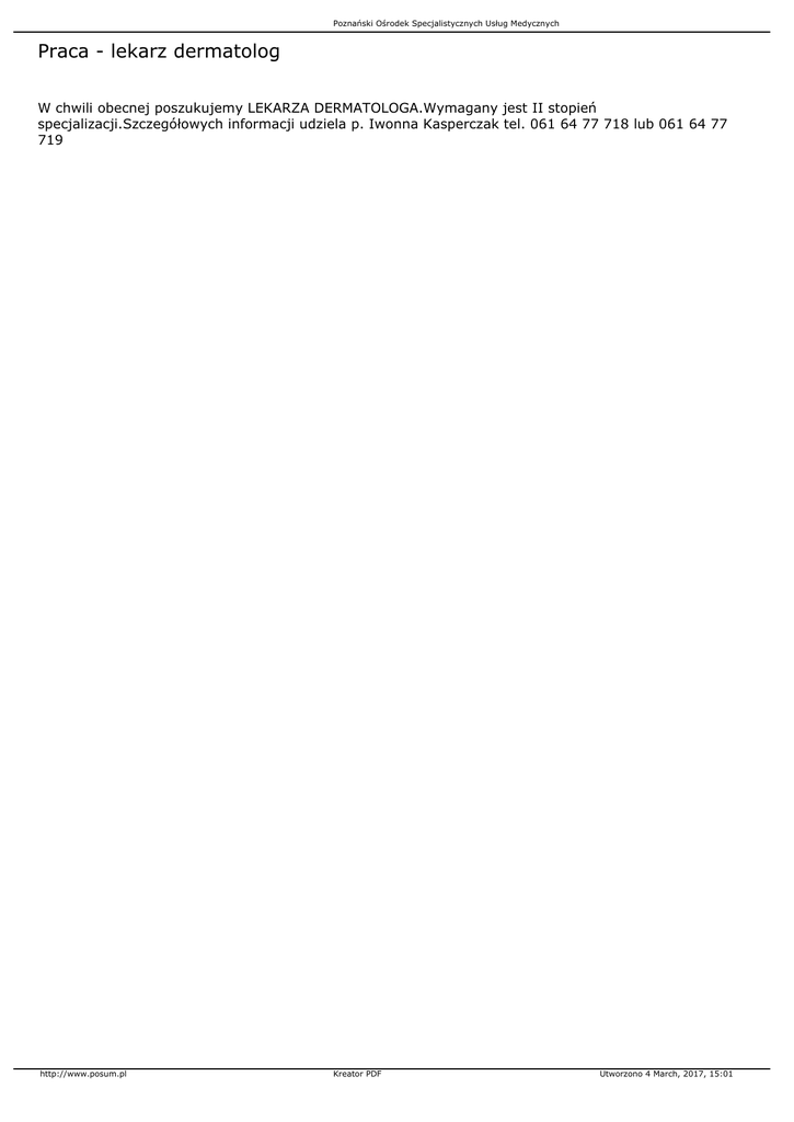 Poznański Ośrodek Specjalistycznych Usług Medycznych Praca - lekarz dermatolog W chwili obecnej poszukujemy LEKARZA DERMATOLOGA.Wymagany jest II stopień specjalizacji.Szczegółowych informacji udziela p. Iwonna Kasperczak tel. 061 64 77 718 lub 061 64 77 719 http://www.posum.pl Kreator PDF Utworzono 4 March, 2017, 15:01