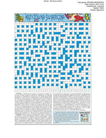Mokate - Monitoring mediów Tytu³ gazety: KRONIKA BESKIDZKA Data wydania: 2012-12-20 Czêstotliwo¶æ: Tygodnik Nak³ad: 19000 Rodzaj: regionalna l^ZYM/^5U/l/ira 10 12 13 14 '6 !6 17 19 20 22 21 23 24 1 T^T ^ 25 26 27 28 29 30 31 32 33 34 35 J POZIOMO: 1 - zręcznościowy numer cyrkowy, 10 - elektryczność, 18 - pogarda, igno rancja, 19 - takielunek, 20 - deputacja, 21 - halucynacja, przywidzenie, 23 - przełożony, szef, 24 - inhibitor, 25 - glosa, dopisek, 28 - zastygła lawa, 31 - władza królewska, 33 - rodzaj szkła kryształowego, 37 - kurtka dżokeja, 40 - inwencja twórcza, 43 - jednostka nakładu „Kroniki Beskidzkiej", 45 - leśne lub owcze, 47 - trójkąt kreślarski, 48 - nauka o pozaziemskich lotach, 49 - widokówki, 50 - komis lub konsum, 53 - korzenna przyprawa do ciast, 55 - mgła nad ba gnem, 57 - wymierzony odcinek biegu, 59 - zasłona okienna, 62 - koczownik, 65 - aglomerat, 66 - taktyka obronna, 68 - miłośnik łamigłówek, 70 - szeregi drzew tworzących aleję, 71 - gra z lotkami, 74 - pióro w skrzydle ptaka, 76 - masowy wykup towarów, 77 - dziecięca choroba, 78 - rzeka wypływająca z Bajkału, 81 - śpiewak kościelny, diak, 83 - agent handlowy, 86 - le gendarny król Celtów, 88 - dekorator, 89 - państwo w pd. Afryce, 92 - rabuś, 94 - chora na nie dokrwistość, 96 - bujna na stepie, 97 - dzierżawa, 98 - pomieszczenie mieszkalne, 99 - stado wilków, 102 - barwi lakmus na czerwono, 105 - niejedna w kołczanie, 108 - znak, ostrzeżenie, 110 - tafla lodu, 112 - główny składnik czekolady, 114 - okrągły zabytek w Cieszynie, 115 - dipol, 116 - powszechny konsument chleba, 117 - wytworna kobieta, 118 - miękki metal, 119 - plecie pojemniki z wikliny, 121 - miał cudowną lampę, 124 - kubański instrument perkusyjny, 128 soda rodzima, 130 - siostra Balladyny, 131 - podpora stropu wyrobiska w kopalni, 134 - maszy na do robót ziemnych, 137 - ozdobny krzew o owłosionych liściach, 138 - gruczoł produkujący insulinę, 139 - skała na pomniki, 142 - upiór, widziadło, 144 - urządzenie samoczynnie utrzy mujące określone warunki pracy, 145 - wartownia, 148 - pora roku niosąca nadzieję, 149 - ja dowita olbrzymia ropucha, 150 - lepra, 151 - podręcznik do nauki religii, 152 - paryska rzeka. PIONOWO: 1 - życzenie wyrażone w kategorycznej formie, 2 - patyna, 3 - zapis w testamen cie, 4 - słuszność, 5 - larum, 6 - rejon, dzielnica, 7 - rysownica, 8 - płytka malarska, 9 - żydowski świecznik, 10 - szachowy pieszek, 11 -rodzaj gry w karty, 12 -budynek mieszkalny, 13 -japoński miecz, 14 - płaska laska złota, 15 - naszyjnik, 16 - imię męskie, 17 - tajemnica, 22 - część sztuki teatralnej, 24 - owoc palmy, 26 - praktykantka, 27 - mniejsza od kościoła, 29 - rzadkie imię mę skie, 30 - więcej niż tysiąc, 32 - misja do wypełnienia, 33 - symbol władzy królewskiej, 34 - sala szkolna, 35 - klub piłkarski z Madrytu, 36 - zapadnia na scenie, 38 - sygnalizacyjna trąba wojsko wa, 3 9 - gra w karty, 41 - zespół ośmiu muzyków, 42 - lutowy solenizant, 44 - mol, 46 - przyzwy czajenie, nałóg, 51 - pierwiastek w silikonie, 52 - monter przewodów pod wysokim napięciem, 54 - szata liturgiczna, 56 - nie każdy lata, 57 - wyżyna na Płw. Indyjskim, 58 - gromada zwierząt domowych, 59 - może być ogórkowy, 60 - pospolite drzewo liściaste, 61 - meksykański sukulent, 63 - skała osadowa używana w hutach jako topnik, 64 - łowi śledzie, 66 - ubiór sportowy, 67 - pod pora mostu, 69 - odruch na bodziec, 72 - medal, 73 - czerwony wróg strażaków, 75 - pniak drzewa z korzeniami, 78 - krewny po mieczu, 79 - kolos, olbrzym, 80 - stos atomowy, 82 - matematyk z Miletu, 84 - spryciarz, rutyniarz, 85 szkocki wzór, 87 - szybki taniec towarzyski, 90 - miasto w Ja ponii, 91 - z wodą na pustyni, 93 - śniedź, 95 - biały lub czarny w fortepianie, 99 - korzeniowe to burak ćwikłowy, 100 - kochała Eugeniusza Oniegina, 101 -jedynak, 103 - furman, 104 - filmowy lub spirytystyczny, 105 - rozgłośnia, 106 - wojskowe polecenie, 107 - ogród owocowy, 108 - kurs waluty, 109 - główna lub boczna w kościele, 110 - źródło, zdrój, 111 - stan w USA, 112 - stragan, 113 - duchowieństwo, 115 - roślina ozdobna, szarłat, 118 - wierzchołek Babiej Góry, 120 - szaradziarska łamigłówka, 122 - wyspa na Filipinach, 123 - prezent, 125 - bogini poranka, 126 - ta lizman, 127 - stan czynny majątku, 129 - ocena, opinia, 131 - arbuz, 132 - podrzędna restauracja, 133 - miasto w Konińskim Zagłębiu Węglowym, 134 - piejący ptak, 135 - kciuk, 136 - pokry wy rogowe na sarniej nodze, 140 - staropolski pan, 141 - kosaciec, 142 - rogoża, 143 - ozdobna uprząż końska, 146 - dawny student, 147 - dopływ dolnej Odry. (miecz) Litery z pól ponumerowanych od 1 do 35 utworzą hasło. Rysunki - Rafał Bojdys. Spośród czytelników, którzy prawidłowo rozwiążąkrzyżówkę, wpiszą hasło - rozwiązanie, ułożą najciekawszy slogan lub wierszyk o Bożym Narodzeniu i wraz z kuponem dostarczą je do naszej redakcji (Bielsko-Biała, ul. Dubois 4) w terminie do 4 stycznia redakcyjne jury wyłoni 9 osób, z których pięć pierw szych otrzyma zestaw Diallo (grupaNetia) składający się z tele fonu komórkowego i startera ze „złotą kartą", trzy osoby otrzy mają kosz produktów ufundowanych przez firmę Mokate, jed na otrzyma sokowirówkę firmy Moulinex. Regulamin konkursu dostępny na stronie www.kronika. beskidzka.pl KRZYŻÓWKA SKUTECZNA \\tfKJH