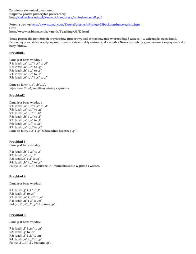 Zajmiemy się wnioskowaniem… Najpierw proszę przeczytać prezentację: http://zsi.tech.us.edu.pl/~nowak/zaocznese/wnioskowanieR.pdf Potem stronkę: http://www.amzi.com/ExpertSystemsInProlog/03backwarduncertainty.htm Oraz http://www.cs.bham.ac.uk/~mmk/Teaching/AI/l2.html Teraz proszę dla poniższych przykładów przeprowadzić wnioskowanie w przód bądź wstecz – w zależności od zadania. Proszę wypisać które reguły są analizowane i które uaktywnione i jaka wiedza Nowa jest wtedy generowana i zapisywana do bazy faktów. Przykład1 Dana jest baza wiedzy : R1: Jeżeli „a” i „b” i „c” to „d” R2: Jeżeli „a” i „b” to „g” R3: Jeżeli „b” i „c” to „e” R4: Jeżeli „a” i „c” to „f” R5: Jeżeli „e” i „b” i „c” to „f” Dane są fakty : „a”, „b”, „c”. Wyprowadź całą możliwą wiedzę z systemu. Przykład2 Dana jest baza wiedzy : R1: Jeżeli „a” i „b” i „c” to „d” R2: Jeżeli „a” i „d” to „g” R3: Jeżeli „a” i „f” to „b” R4: Jeżeli „b” i „g” to „f” R5: Jeżeli „a” i „e” to „f” R6: Jeżeli „e” i „f” to „a” R7: Jeżeli „a” i „b” to „c” Dane są fakty : „a” i „e”. Udowodnić hipotezę „g”. Przykład 3 Dana jest baza wiedzy: R1: Jeżeli „b” i „d” to „f” R2: Jeżeli „a” to „b” R3: Jeżeli„e” i „f” to „g” R4: Jeżeli „b” i „c” to „e” Fakty: „a”, „c” i „d”. Szukane „b”. Wnioskowanie w przód i wstecz. Przykład 4 Dana jest baza wiedzy: R1: Jeżeli „j” i „k” to „l” R2: Jeżeli „j” to „n” R3: Jeżeli „n” i „m” to „o” R4: Jeżeli „n” i „l” to „m” Fakty: „j”, „k”, „l”, „p”. Szukane „p”. Przykład 5 Dana jest baza wiedzy: R1: Jeżeli „l” i „m” to „n” R2: Jeżeli „j” to „o” R3: Jeżeli „j” i „k” to „m” R4: Jeżeli „n” i „o” to „p” Fakty: „j”, „k”, „l”. Szukane „p”.
