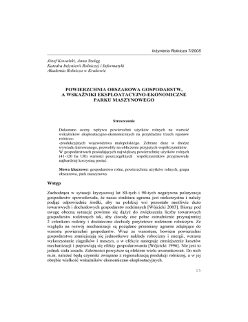 InŜynieria Rolnicza 7/2005 Józef Kowalski, Anna Szeląg Katedra InŜynierii Rolniczej i Informatyki Akademia Rolnicza w Krakowie POWIERZCHNIA OBSZAROWA GOSPODARSTW, A WSKAŹNIKI EKSPLOATACYJNO-EKONOMICZNE PARKU MASZYNOWEGO Streszczenie Dokonano oceny wpływu powierzchni uŜytków rolnych na wartość wskaźników eksploatacyjno-ekonomicznych na przykładzie trzech rejonów rolniczo-produkcyjnych województwa małopolskiego. Zebrane dane w drodze wywiadu kierowanego, pozwoliły na obliczenie przyjętych współczynników. W gospodarstwach posiadających największą powierzchnię uŜytków rolnych (41-120 ha UR) wartości poszczególnych współczynników przyjmowały najbardziej korzystną postać. Słowa kluczowe: gospodarstwo rolne, powierzchnia uŜytków rolnych, grupa obszarowa, park maszynowy Wstęp Zachodząca w sytuacji kryzysowej lat 80-tych i 90-tych negatywna polaryzacja gospodarstw spowodowała, Ŝe nasza struktura agrarna jest niekorzystna i naleŜy podjąć odpowiednie środki, aby na polskiej wsi pozostało moŜliwie duŜo towarowych i dochodowych gospodarstw rodzinnych [Wójcicki 2003]. Biorąc pod uwagę obecną sytuacje powinno się dąŜyć do zwiększenia liczby towarowych gospodarstw rodzinnych tak, aby dawały one pełne zatrudnienie przynajmniej 2 członkom rodziny i dostateczne dochody parytetowe rodzinom rolniczym. Ze względu na rozwój mechanizacji są poŜądane przemiany agrarne zdąŜające do wzrostu powierzchni gospodarstw. Wraz ze wzrostem, bowiem powierzchni gospodarstwa zmniejszają się jednostkowe nakłady robocizny i energii, wzrasta wykorzystanie ciągników i maszyn, a w efekcie następuje zmniejszenie kosztów mechanizacji i poprawiają się efekty gospodarowania [Wójcicki 1996]. Nie jest to jednak stała zasada. ZaleŜności powyŜsze są efektem wielu uwarunkowań. Do nich m.in. naleŜeć będą czynniki związane z regionalizacją produkcji rolniczej, a w jej obrębie wielkość wskaźników ekonomiczno-eksploatacyjnych. 15 Józef Kowalski, Anna Szeląg Cel i zakres badań Celem opracowania jest określenie wartości i współzaleŜności wskaźników eksploatacyjno-ekonomicznych w aspekcie powierzchni gospodarstw w obrębie przyjętych grup. Do analizy opisowej wydzielono trzy grupy obszarowe powierzchni uŜytków rolnych (6-20, 21-40, 41-120 ha UR). Obliczone wskaźniki to: wskaźnik uzbrojenia technicznego (WT), moc zainstalowana, wartość odtworzeniowa parku maszynowego (WOPM), koszty mechanizacji (KM), udział kosztów mechanizacji w kosztach całkowitych (WKM), jednostkowe nakłady pracy (NRj). Zakresem badań objęte zostało 90 gospodarstw z terenu województwa małopolskiego z trzech rejonów rolniczo-produkcyjnych. Zebrane w latach 2003 i 2004 dane dotyczyły całości procesów produkcyjnych prowadzonych w poszczególnych gospodarstwach. Metoda badań Badaniami objęto po 30 gospodarstw rolnych leŜących na terenie powiatów: miechowskiego, proszowickiego i oświęcimskiego województwa małopolskiego. Badania zostały przeprowadzone w formie wywiadu kierowanego, który posłuŜył do wypełnienia wcześniej przygotowanego kwestionariusza. Do badań wybrano gospodarstwa spośród największych obszarowo w wybranych gminach w/w powiatów. Wybór gospodarstw był celowy, zaleŜny między innymi od: wielkości powierzchni badanego obiektu, zróŜnicowania gospodarstw pod względem kierunku produkcji. Wyliczeń wymienionych w celu i zakresie wskaźników dokonano według przyjętych w tym zakresie metod stosowanych w statystyce oraz metod relacji ekonomicznych opracowanych w Katedrze Mechanizacji Rolnictwa AR Kraków [Kowalski i in. 2002]. Wyniki badań i ich analiza W celu określenia poziomu technicznego uzbrojenia w badanych obiektach posłuŜono się wskaźnikami: mocy zainstalowanej w gospodarstwie oraz wskaźnikiem technicznego uzbrojenia. Wskaźnik technicznego uzbrojenia jest stosunkiem wartości technicznych środków produkcji do nakładów pracy Ŝywej [Kowalski i in. 2002]. Według załoŜonej metodyki jest on miernikiem uzbrojenia technicznego gospodarstw rolnych. Wspomniany powyŜej wskaźnik powinien być tym większy im proces produkcyjny jest bardziej kapitałochłonny, a mniej pracochłonny. 16 Powierzchnia obszarowa gospodarstw… Wartość ocenianych wskaźników uzbrojenia technicznego oraz zainstalowanej mocy dla badanych gospodarstw w przyjętych grupach obrazuje tabela 1. Tabela 1. Wskaźnik uzbrojenia technicznego [zł/rbh] oraz moc zainstalowana w gospodarstwie [kW/ha UR] Table 1. Technical equipment index [PLN/man-hour] and power installed in a farm [kW/ha UR] Grupy obszarowe [ha UR] Liczba gospodarstw 6-20 46 21-40 27 < 41 17 Parametr Minimum Średnia Maksimum Odch.stand. Minimum Średnia Maksimum Odch.stand. Minimum Średnia Maksimum Odch.stand. Powierzchnia UR [ha] 6,00 13,13 20,00 4,08 21,00 30,27 40,00 5,12 42,50 73,07 120,00 24,66 WT [zł/rbh] 24,32 130,78 361,45 86,72 31,15 107,75 328,99 71,62 23,67 117,17 328,99 74,97 Moc zainstalowana [kW/ha UR] 3,63 13,86 39,24 7,64 2,53 7,34 23,65 5,08 2,53 8,52 32,77 7,30 Dane sygnalizują, iŜ wielkość jednej roboczogodziny nakładów pracy uzaleŜniona jest od wielu czynników warunkujących pracę. DuŜy wpływ mają wielkość gospodarstwa, skala i kierunki produkcji, oraz zasobność w siłę roboczą. W gospodarstwach najmniejszych (6-20 ha UR ) wartość wskaźnika jest największa, jedna roboczogodzina równowaŜona jest 130 złotymi zainwestowanymi w park maszynowy. W tym przypadku główny wpływ ma wysoka wartość parku maszynowego odniesiona do 1 ha UR. Obiekty średnie ( 21-40 ha UR ) cechuje najniŜsza wartość wynosząca 107 złotych. Wynika to z faktu, iŜ w grupie tej znajdowała się duŜa liczba gospodarstw dwukierunkowych. W gospodarstwach tych produkcję zwierzęcą cechowała stosunkowo niska obsada zwierząt, a co najczęściej za tym idzie niski poziom mechanizacji wpływający na wielkość drugiej składowej – pracochłonność pr