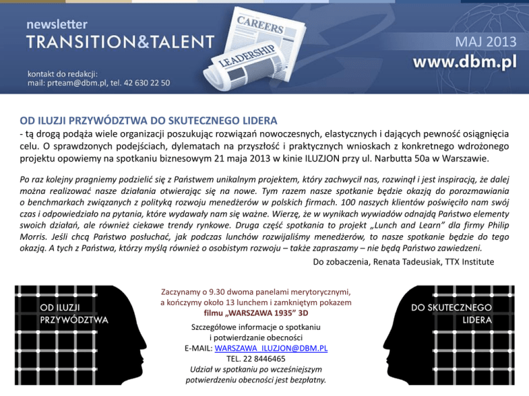 MAJ 2013 OD ILUZJI PRZYWÓDZTWA DO SKUTECZNEGO LIDERA - tą drogą podąża wiele organizacji poszukując rozwiązań nowoczesnych, elastycznych i dających pewność osiągnięcia celu. O sprawdzonych podejściach, dylematach na przyszłość i praktycznych wnioskach z konkretnego wdrożonego projektu opowiemy na spotkaniu biznesowym 21 maja 2013 w kinie ILUZJON przy ul. Narbutta 50a w Warszawie. Po raz kolejny pragniemy podzielić się z Państwem unikalnym projektem, który zachwycił nas, rozwinął i jest inspiracją, że dalej można realizować nasze działania otwierając się na nowe. Tym razem nasze spotkanie będzie okazją do porozmawiania o benchmarkach związanych z polityką rozwoju menedżerów w polskich firmach. 100 naszych klientów poświęciło nam swój czas i odpowiedziało na pytania, które wydawały nam się ważne. Wierzę, że w wynikach wywiadów odnajdą Państwo elementy swoich działań, ale również ciekawe trendy rynkowe. Druga część spotkania to projekt „Lunch and Learn” dla firmy Philip Morris. Jeśli chcą Państwo posłuchać, jak podczas lunchów rozwijaliśmy menedżerów, to nasze spotkanie będzie do tego okazją. A tych z Państwa, którzy myślą również o osobistym rozwoju – także zapraszamy – nie będą Państwo zawiedzeni. Do zobaczenia, Renata Tadeusiak, TTX Institute Zaczynamy o 9.30 dwoma panelami merytorycznymi, a kończymy około 13 lunchem i zamkniętym pokazem filmu „WARSZAWA 1935” 3D Szczegółowe informacje o spotkaniu i potwierdzanie obecności E-MAIL: [email protected] TEL. 22 8446465 Udział w spotkaniu po wcześniejszym potwierdzeniu obecności jest bezpłatny. BANKI ZWALNIAJĄ… I ZATRUDNIAJĄ W branży finansowej trwa ciągła wymiana kadr, Warszawę w liczbie ofert goni pomorskie, a zwolnieni dyrektorzy szybciej niż inni znajdują pracę – to wyniki badań Lee Hecht Harrison DBM Polska przeprowadzonych wśród 1 200 osób odchodzących z największych instytucji finansowych w wyniku restrukturyzacji 2011-2013. źródło: sxc.hu Modyfikacje modeli biznesowych, fuzje i przejęcia – tak wyglądały ostatnie miesiące w największych bankach w Polsce. Do tego dołożyło się także zalecenie Komisji Nadzoru Finansowego dotyczące zasad udzielania kredytów hipotecznych. W efekcie nastąpiły znaczne redukcje zatrudnienia: 75% zwolnionych to osoby ze stanowisk specjalistycznych, 15% z kierowniczych, a 10% z dyrektorskich. Redukcje etatów objęły wszystkie działy, ale w największej mierze dotknęły pracowników związanych z back-office oraz sprzedażą. Niemal połowa osób, które utraciły pracę, pochodziła z województwa mazowieckiego, z czego aż 86% z nich to mieszkańcy Warszawy. Proces restrukturyzacji w dużej mierze objął także mieszkańców województw pomorskiego, małopolskiego i śląskiego. Nowe modele biznesowe zakładały przesunięcie środka ciężkości z bankowości oddziałowej na zdalną oraz z sektora detalicznego na korporacyjny. W rezultacie konieczne stało się zatrudnienie pracowników posiadających kompetencje umożliwiające rozwinięcie nowych gałęzi biznesu. Banki, które zdecydowały się na redukcję zatrudnienia, równolegle prowadziły zatem procesy rekrutacyjne. Spośród tych, które zwalniały, aż 80% jednocześnie prowadziło procesy rekrutacyjne, głównie na stanowiska sprzedażowe oraz do działów IT. GDYBY MINISTERSTWO PRACY ZAOSTRZYŁO PRZEPISY „Podobnie jak urzędy pracy, często spotykamy się z "grymaszeniem" uczestników programów outplacement na temat ofert pracy i mierzymy się z objawami niezadowolenia firm opłacających takie programy, że ich byli pracownicy nie podejmują zatrudnienia, choć firma stara się w tym pomóc. Mimo to uważam, że opisane w Gazecie Wyborczej 6 maja br. plany, aby bezrobotny, który odmówi przyjęcia już pierwszej oferty z urzędu pracy został wykreślony z rejestru, nie przyniosą niczego dobrego. Rozumiemy, że jak w każdej dziedzinie życia i na rynku pracy zdarzają się patologie - nam samym zdarza się ponosić ich biznesowe konsekwencje. Jednak proponowana zmiana to typowe „wylewanie dziecka z kąpielą”. Ludzie pozbawieni pracy, najczęściej zresztą w wyniku zmian strukturalnych, a więc bez własnej winy, także mają prawo do przynajmniej elementarnego wyboru, gdzie chcą pracować. Rozumiemy, że można rozważać zwiększanie konsekwencji np. już drugiej odmowy. Jednak najbardziej drastyczna sankcja za pierwszą to duża przesada, pole do nadużyć i pomyłek. Czy naprawdę można wierzyć, że każda oferta składana przez urząd zawsze odpowiada kwalifikacjom i potencjałowi kandydata? Owszem, możemy założyć, że dwie, trzy odmowy mogą (choć nie muszą) oznaczać złe intencje bezrobotnego czy próbę nadużycia systemu opieki społecznej. Ale zakładanie tego po pierwszej odmowie to arogancja i brak szacunku dla człowieka i jego wyborów. Osoba przyjmująca bezalternatywną w zasadzie ofertę to niemal "pracownik źródło: sxc.hu przymusowy". Jako pracodawca bardzo bym się zastanawiał nad przekazywaniem informacji o wakatach do urzędów pracy, gdybym wiedział, że ludzie przyjmujący moje oferty czynią to, bo grozi im długotrwała utrata prawa do świadczeń. Doświadczonemu i etycznemu pracodawcy zależy na kandydatach zmotywowanych, a nie pracownikach, którzy zaakceptują ofertę pod presją, z góry traktując ją jako przejściową. Rozmawiajmy więc o ograniczeniu zjawiska "grymaszenia", ale nie o pozbawianiu ludzi prawa do świadomego wyboru drogi zawodowej. Choćby to ostatnie ładnie poprawiało rządowe statystyki - co zresztą pewnie by nastąpiło.” Paweł Gniazdowski Ekspert zarządzania karierą, szef Lee Hecht Harrison DBM w Polsce MEDIA FLASH „Kandydat musi umieć pytać” - Rzeczpospolita, A.Błaszczak, 03.04.2013 Zdaniem Pawła Gniazdowskiego podczas rozmowy kwalifikacyjnej można spytać o wiele wrażliwych kwestii - pod warunkiem, że umiemy