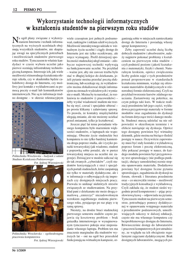 12 PISMO PG Wykorzystanie technologii informatycznych w kształceniu studentów na pierwszym roku studiów N a ogół plany związane z wykorzy− staniem Internetu i technik informa− tycznych na wyższych uczelniach obej− mują wszystkich studentów, nie skupia− jąc uwagi na specyficznych potrzebach i możliwościach studentów pierwszego roku studiów. Tymczasem to właśnie kan− dydaci w czasie wyboru uczelni jako pierwsi oceniają infrastrukturę technolo− giczną kampusu. Interesuje ich, jak wiele możliwości różnorodnego kształcenia ofe− ruje szkoła, czy w akademiku będzie ca− łodobowy dostęp do Internetu, czy moż− liwy jest kontakt z wykładowcami za po− mocą poczty e−mail lub komunikatorów internetowych. Nie są to informacje trud− no dostępne – w okresie rekrutacyjnym Politechnika Wrocławska – budynek z salami Studium Kształcenia Podstawowego Fot. Jędrzej Wierzejewski Politechnika Wrocławska – ogólnodostępna pracownia komputerowa Fot. Jędrzej Wierzejewski Nr 1/2009 wiele czasopism jest pełnych podsumo− wań, rankingów i reklam szkół wyższych. Możliwość interaktywnego udziału w wir− tualnym życiu uczelni i ciągły dostęp do Internetu jest nie tylko oczekiwany, ale wręcz wymagany. Profil dzisiejszej spo− łeczności studenckiej uległ zmianie – zdo− bycze najnowszej techniki wpływają na funkcjonowanie uczelni. Na przykład – ważne jest, aby nie zawsze trzeba było stać w długiej kolejce do dziekanatu, je− żeli pytanie można przesłać pocztą elek− troniczną, lub oczekuje się, że wykładow− ców można zlokalizować dzięki informa− cjom na stronach wydziałowych i wymia− nie e−maili. Można by tu narzekać, że roz− leniwia to studentów (i pracowników) – żeby wysłać wiadomość mailem nie trze− ba się myć, czesać i specjalnie ubierać – po prostu klikamy i załatwiamy sprawę. To prawda, że kontakty międzyludzkie ulegają zmianie, ale nie możemy uciekać przed zmianami, tylko je kształtować. Jeszcze pięć lat temu posiadanie wła− snego komputera było marzeniem więk− szości studentów, o laptopach nie wspo− minając. Obecnie życie studenckie bez komputera to nie tylko bardziej kamieni− sta droga poprzez studia, ale i ryzyko po− rażki towarzyskiej (jak wiadomo, student z poprawką sobie poradzi, ale w pustce towarzyskiej miejsca na uczelni nie za− grzeje). Dzisiaj jest w modzie zaliczać się do tak zwanych „cyberżaków”, czyli stu− dentów korzystających z sieci i specjal− nych portali studenckich, które zaopatrują nie tylko w materiały dydaktyczne, ale i w informacje o odbywających się impre− zach czy dostępnych miejscach pracy. Pozwala to uniknąć niektórych stresów związanych ze studiowaniem. Na przy− kład pani z dziekanatu nie może drogą e− mailową „zmierzyć” niezadowolonym wzrokiem zagubionego studenta pierw− szego roku, pytającego po raz piąty o tę samą sprawę. Niestety, na drodze braci studenckiej pierwszego semestru studiów często po− jawia się kosztowny problem – brak gniazdka internetowego w wynajmowa− nym tymczasowo pokoju oraz nieposia− danie własnego laptopa. Problem ten ma znaczenie marginalne dla studentów wy− ższych lat – oni na ogół bez przeszkód funkcjonują na wirtualnym kampusie, or− ganizują sobie w miejscach zamieszkania dostęp do Internetu i posiadają własny sprzęt komputerowy. Żeby zapewnić uczelni dużą liczbę dobrych studentów i absolwentów, nale− ży najpierw pokonać problemy z kształ− ceniem na pierwszym roku studiów – czyli podnieść poziom i jakość kształce− nia z matematyki, fizyki i chemii. Natu− ralnym krokiem, oprócz zwiększenia liczby godzin zajęć z tych przedmiotów ponad proponowane w standardach kształcenia minimum, wydaje się ofero− wanie materiałów dydaktycznych w róż− norodnej formie elektronicznej. Czyli na przykład tworzenie kursów zdalnego na− uczania. Zastanówmy się pokrótce, na czym polega taki kurs. W trakcie reali− zacji przedmiotu lub jego części, wykła− dowca przygotowuje materiały w formie modułów oraz zagadnienia do dyskusji na forum dotyczące treści danego modu− łu. Studenci muszą udzielać na nie od− powiedzi w określonym terminie i w efekcie nawiązuje się dyskusja. Oprócz tego dostępny powinien być wirtualny dziennik, gdzie można na bieżąco śledzić postępy w nauce. Oczywiście zapewnio− ny musi być stały kontakt z wykładowcą poprzez forum i pocztę elektroniczną. Aby pokazać postępy w nauce, do każ− dego modułu powinien być przygotowa− ny test sprawdzający (nie podlega punk− tacji), służący samodzielnej ocenie stop− nia opanowania materiału. Dodatkowo powinny być dostępne liczne pytania sprawdzające, zagadnienia do dyskusji na forum, słownik i literatura przedmiotu oraz – co niezwykle istotne – możliwość tradycyjnych konsultacji z wykładowcą. Czyli zakłada się, że student siedzi wy− godnie przed komputerem i – pijąc przy− słowiową kawę – odpowiada na pytania. Tymczasem student na pierwszym seme− strze, potrzebujący pomocy dydaktycz− nej w opanowaniu wstępnego materiału z przedmiotów podstawowych, umożli− wiających sukcesy w dalszej edukacji, często nie ma własnego komputera czy bezproblemowego dostępu do Internetu. Równocześnie dostęp do laboratoriów i pracowni komputerowych jest utrudnio− ny, ze względu na ich obciążenie regu− larnymi zajęciami dydaktycznymi. Brak dostępnych laboratoriów, mogących po− PISMO PG mieścić większą liczbę studentów, powo− duje również inny problem. Najlepszą formą kontroli poziomu opanowania materiału są sprawdziany i kolokwia. Testy – z funkcją natychmiastowej oce− ny – można wykonać w formie elektro− nicznej. Aby jednak mieć pewność co do wiarygodności wyników takiego egzami− nu, powinien on być przeprowadz