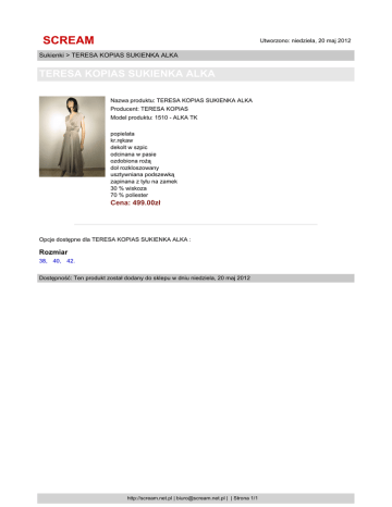 SCREAM Utworzono: niedziela, 20 maj 2012 Sukienki > TERESA KOPIAS SUKIENKA ALKA TERESA KOPIAS SUKIENKA ALKA Nazwa produktu: TERESA KOPIAS SUKIENKA ALKA Producent: TERESA KOPIAS Model produktu: 1510 - ALKA TK popielata kr.rękaw dekolt w szpic odcinana w pasie ozdobiona rożą doł rozkloszowany usztywniana podszewką zapinana z tyłu na zamek 30 % wiskoza 70 % poliester Cena: 499.00zł Opcje dostępne dla TERESA KOPIAS SUKIENKA ALKA : Rozmiar 38, 40, 42. Dostępność: Ten produkt został dodany do sklepu w dniu niedziela, 20 maj 2012 http://scream.net.pl | [email protected] | | Strona 1/1