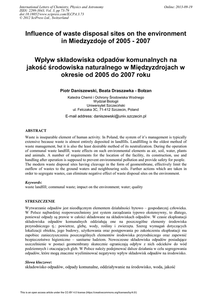 International Letters of Chemistry, Physics and Astronomy ISSN: 2299-3843, Vol. 3, pp 73-79 doi:10.18052/www.scipress.com/ILCPA.3.73 © 2012 SciPress Ltd., Switzerland Online: 2013-09-19 Influence of waste disposal sites on the environment in Miedzyzdoje of 2005 - 2007 Wpływ składowiska odpadów komunalnych na jakość środowiska naturalnego w Międzyzdrojach w okresie od 2005 do 2007 roku Piotr Daniszewski, Beata Draszawka - Bołzan Katedra Chemii i Ochrony Środowiska Wodnego Wydział Biologii Uniwersytet Szczeciński ul. Felczaka 3C, 71-412 Szczecin, Poland E-mail address: [email protected] ABSTRACT Waste is inseparable element of human activity. In Poland, the system of it’s management is typically extensive because waste is almost entirely deposited in landfills. Landfilling is the oldest method of waste management, but it is also the least desirable method of its neutralization. During the operation of communal waste landfill, waste effects on such environmental elements as air, soil, water, plants and animals. A number of requirements for the location of the facility, its construction, use and handling after operation is supposed to prevent environmental pollution and provide safety for people. The modern waste disposal sites having cleavage in the form of geomembrane, effectively limit the outflow of wastes to the ground waters and neighbouring soils. Further actions which are taken in order to segregate wastes, can eliminate negative effect of waste disposal sites on the environment. Keywords: waste landfill; communal waste; impact on the environment; water; quality STRESZCZENIE Wytwarzanie odpadów jest nieodłącznym elementem działalności bytowo – gospodarczej człowieka. W Polsce najbardziej rozpowszechniony jest system zarządzania typowo ekstensywny, to dlatego, ponieważ odpady są prawie w całości składowane na składowiskach odpadów. W czasie eksploatacji składowiska odpadów komunalnych oddziałują one na poszczególne elementy środowiska przyrodniczego tj.: powietrze, glebę, wody, rośliny i zwierzęta. Szereg wymagań dotyczących lokalizacji obiektu, jego budowy, użytkowania oraz postępowania po zakończeniu eksploatacji ma zapobiec zanieczyszczeniu poszczególnych elementów środowiska przyrodniczego oraz zapewnić bezpieczeństwo higieniczno – sanitarne ludziom. Nowoczesne składowiska odpadów posiadające uszczelnienie w postaci geomembrany skutecznie ograniczają odpływ z nich odcieków do wód podziemnych i otaczających gleb. W Polsce należy podejmować dalsze działania w celu segregowania odpadów, które mogą znacznie wyeliminować negatywny wpływ składowisk odpadów na środowisko. Słowa kluczowe: składowisko odpadów, odpady komunalne, oddziaływanie na środowisko, woda, jakość This is an open access article under the CC-BY 4.0 license (https://creativecommons.org/licenses/by/4.0/) 74 Volume 3 1. WPROWADZENIE Zgodnie z Ustawą z 22 stycznia 2010 roku o zmianie ustawy o odpadach oraz niektórych innych ustaw jako odpady komunalne rozumie się „odpady powstające w gospodarstwach domowych, z wyłączeniem pojazdów wycofanych z eksploatacji, a także odpady nie zawierające odpadów niebezpiecznych pochodzące od innych wytwórców odpadów, które ze względu na swój charakter lub skład są podobne do odpadów powstających w gospodarstwach domowych". Składowiska odpadów i oczyszczalnie ścieków są źródłem emisji wielu związków substancji chemicznych i biologicznych w postaci bioaerozoli, które mogą negatywnie oddziaływać na środowisko naturalne i zdrowie ludzkie [Gonzalez 2000, Hendry 1993, Horner 1995, Daniszewski i in. 2001a, 2001b, Daniszewski 2008, 2009]. Wśród wielu czynników szkodliwych występujących w bioaerozolach na szczególną uwagę zasługują drobnoustroje, które występując w postaci przetrwalników, zarodników, konidii, fragmentów grzybni czy nawet form wegetatywnych (bakterie, wirusy) mogą stwarzać poważne niebezpieczeństwo chorobotwórcze dla zdrowia ludzi, zwierząt i roślin [Barabasz i in. 1998, 2001a, 2001b 2003, Daniszewski i in. 2001a, 2001b, Daniszewski 2008, 2009]. Uwalniany bioaerozol ze składowisk odpadów i oczyszczalni ścieków w wyniku opadania pod wpływem sił grawitacyjnych, gromadzi się na powierzchni gleb, wód, roślin, a także wraz z wodą przemieszczać się może do głębszych warstw gleby, ponadto zawieszony w powietrzu atmosferycznym bioaerozol nie traci swoich właściwości nawet przez długi okres czasu [Barabasz i in. 1998, 2001a, 2001b 2003, Borowski 2001, Borrello i in. 1999, Cronholm 1980, Daniszewski i in. 2001a, 2001b, Gonzalez 2000, Litwin 1977, Mancinelli i in. 1978]. Obiekty komunalne stanowią jedno z potencjalnych źródeł zagrożenia dla człowieka, a wielkość zagrożenia zależy przede wszystkim od charakteru obiektów a także od sposobu ich eksploatacji i aktualnych warunków meteorologicznych i przyrodniczych[Barabasz i in. 1998, 2001a, 2001b 2003, Borowski 2001, Borrello i in. 1999, Cronholm 1980, Daniszewski i in. 2001a, 2001b]. Obiekty komunalne mają wpływ na otaczające gleby, wody powierzchniowe i podziemne, zanieczyszczają atmosferę, a za jej pośrednictwem odległe tereny rolnicze, miejskie i rekreacyjne [Borowski 2001, Daniszewski 2008, 2009, Jagiełło 2003, Jones i in. 1983, Kock i in. 1998]. 2. CZĘŚĆ DOŚWIADCZALNA Składowisko komunalne w Międzyzdrojach zlokalizowane zostało w południowo – zachodniej części miasta. Składowisko to było eksploatowane w latach 1948-2002. Międzyzdroje położone są nad Morzem Bałtyckim, na terenie wyspy Wolin. Klimat wyspy Wolin jest różny od klimatu reszty kraju, ponieważ jest silnie kształtowany obecnością Morza Bałtyckiego. Charakteryzuje go duża wilgotność powietrza, zmienność nasłonecznienia i rozkładu opadów atmosferycznych, siły i kierunku wiatru oraz duże dobowe amplitudy temperatur. Nieczynne składowisko odpadów komunalnych w Międzyzdro