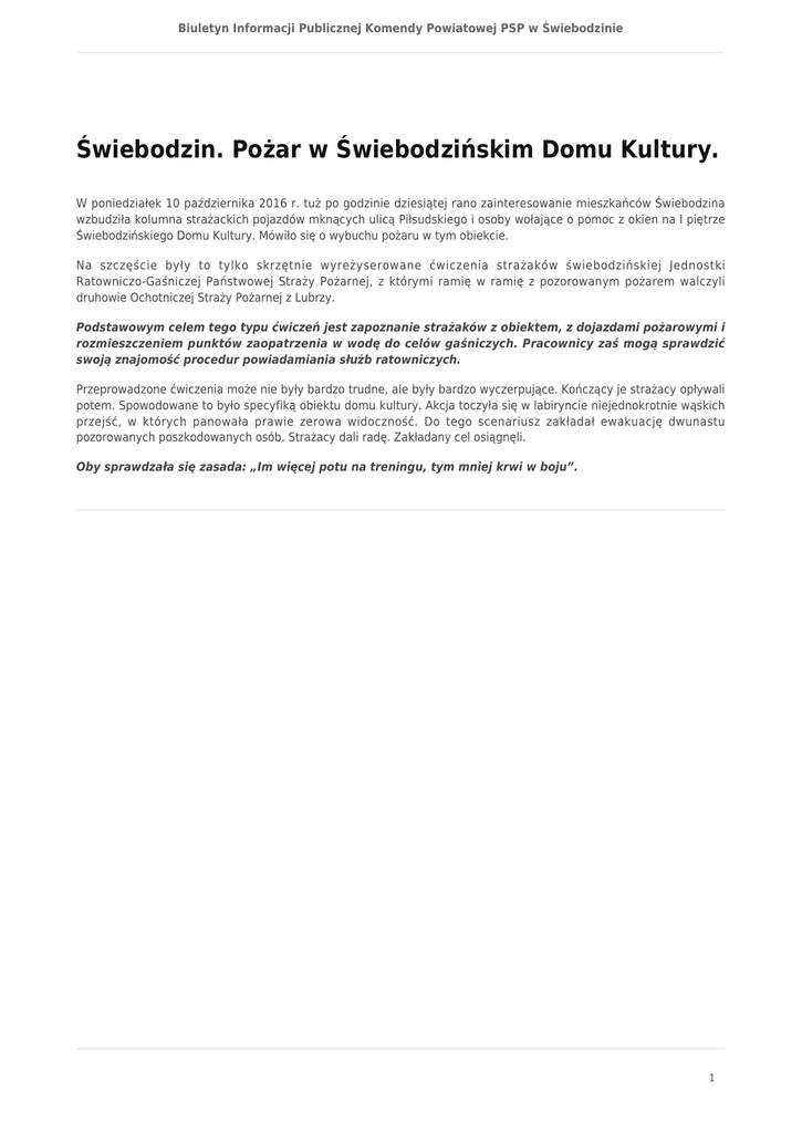 Biuletyn Informacji Publicznej Komendy Powiatowej PSP w Świebodzinie Świebodzin. Pożar w Świebodzińskim Domu Kultury. W poniedziałek 10 października 2016 r. tuż po godzinie dziesiątej rano zainteresowanie mieszkańców Świebodzina wzbudziła kolumna strażackich pojazdów mknących ulicą Piłsudskiego i osoby wołające o pomoc z okien na I piętrze Świebodzińskiego Domu Kultury. Mówiło się o wybuchu pożaru w tym obiekcie. Na szczęście były to tylko skrzętnie wyreżyserowane ćwiczenia strażaków świebodzińskiej Jednostki Ratowniczo-Gaśniczej Państwowej Straży Pożarnej, z którymi ramię w ramię z pozorowanym pożarem walczyli druhowie Ochotniczej Straży Pożarnej z Lubrzy. Podstawowym celem tego typu ćwiczeń jest zapoznanie strażaków z obiektem, z dojazdami pożarowymi i rozmieszczeniem punktów zaopatrzenia w wodę do celów gaśniczych. Pracownicy zaś mogą sprawdzić swoją znajomość procedur powiadamiania służb ratowniczych. Przeprowadzone ćwiczenia może nie były bardzo trudne, ale były bardzo wyczerpujące. Kończący je strażacy opływali potem. Spowodowane to było specyfiką obiektu domu kultury. Akcja toczyła się w labiryncie niejednokrotnie wąskich przejść, w których panowała prawie zerowa widoczność. Do tego scenariusz zakładał ewakuację dwunastu pozorowanych poszkodowanych osób. Strażacy dali radę. Zakładany cel osiągnęli. Oby sprawdzała się zasada: „Im więcej potu na treningu, tym mniej krwi w boju”. 1