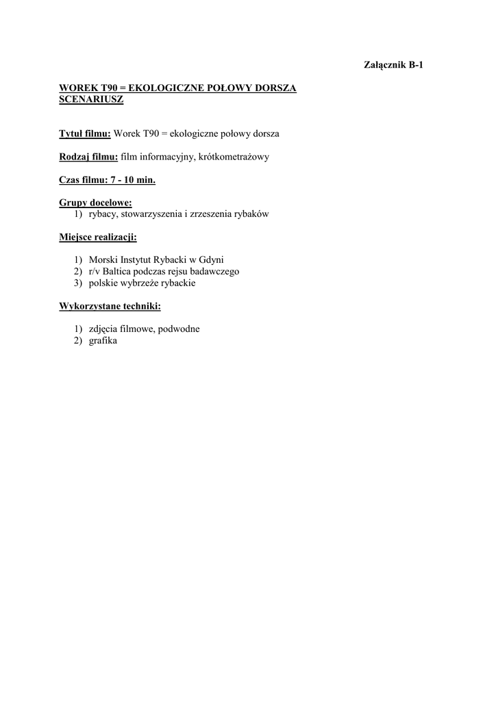 Załącznik B-1 WOREK T90 = EKOLOGICZNE POŁOWY DORSZA SCENARIUSZ Tytuł filmu: Worek T90 = ekologiczne połowy dorsza Rodzaj filmu: film informacyjny, krótkometraŜowy Czas filmu: 7 - 10 min. Grupy docelowe: 1) rybacy, stowarzyszenia i zrzeszenia rybaków Miejsce realizacji: 1) Morski Instytut Rybacki w Gdyni 2) r/v Baltica podczas rejsu badawczego 3) polskie wybrzeŜe rybackie Wykorzystane techniki: 1) zdjęcia filmowe, podwodne 2) grafika Struktura filmu: Sekwencja 1 Osoba wypowiadająca: lektor Kadr: kutry rybackie na Morzu Bałtyckim, praca na morzu, r/v Baltica Czas sekwencji: 1 min. Lektor: Po drugiej wojnie światowej połowy wszystkich gatunków ryb uŜytkowych Bałtyku systematycznie rosły, osiągając swoje maksimum w latach 70-tych i 80-tych. Trend ten załamał się w latach 90-tych, co jest szczególnie widoczne na przykładzie dorsza. Ogólne połowy dorsza na Bałtyku zmalały z 442 tys. ton w roku 1984 do 41 tys. ton w 1993 roku. Wtedy to zwrócono uwagę na konieczność bardziej racjonalnej gospodarki Ŝywymi zasobami Bałtyku. Dla zapewnienia odnawialności bałtyckich zasobów Unia Europejska, a wcześniej Międzynarodowa Komisja Rybołówstwa Morza Bałtyckiego, stosuje program ochrony ryb, polegający na wprowadzeniu okresów i obwodów ochronnych, ograniczeniu dostępu do tarlisk i miejsc wzrostu narybku. Odpowiednie przepisy określają natomiast parametry środków technicznych stosowanych w rybołówstwie, np. wielkość oczek w sieciach rybackich. Sekwencja 2 Osoba wypowiadająca: dr. hab. prof. MIR Wiesław Blady Kadr: kutry rybackie, MIR Czas sekwencji: 1 min. dr hab. prof. MIR Wiesław Blady - odpowiedź na pytania: 1) Jak zmieniały się obwody ochronne ryb i wielkość oczka w sieciach rybackich na przestrzeni lat? 2) Jakie worki we włokach dennych naleŜy stosować w połowach dorsza na Bałtyku? 3) Jaką politykę ochrony ryb przyjmie Unia Europejska w przyszłości - Pańskie przewidywania? Sekwencja 3 Osoba wypowiadająca: Lektor Kadr: sieci rybackie Czas sekwencji: 1 min. Lektor Badania nad określeniem parametrów technicznych narzędzi połowu prowadzą naukowcy z europejskich instytutów, w tym dr inŜ. Waldemar Moderhak z Zakładu Zasobów Rybackich Morskiego Instytutu Rybackiego w Gdyni. Dr inŜ. Waldemar Moderhak realizował projekty badawcze, w których testował moŜliwości worka T90 na r/v Baltica oraz na kutrach rybackich. Sekwencja 4 Osoba wypowiadająca: dr inŜ. Waldemar Moderhak Kadr: MIR Czas sekwencji: 1 min. dr inŜ. Waldemar Moderhak - odpowiedź na pytania: 1) proszę przedstawić ideę oczka obróconego o 90 stopni 2) proszę przedstawić konstrukcję worka z tkaniny o oczkach obróconych o 90 stopni 3) jakie zalety posiada materiał sieciowy o oczku obróconym o 90 stopni Sekwencja 5 Osoba wypowiadająca: lektor Kadr: archiwalne zdjęcia podwodne, zdjęcia z pracy na statku r/v Baltica, ewentualna animacja dostarczona przez MIR Czas sekwencji: 2 min. Lektor: Worek T90 to końcowa część aktywnego, trałowego narzędzia połowu, który zastosowany został do połowów dorsza na Bałtyku, lecz moŜe być takŜe stosowany do połowu innych gatunków ryb, głównie wrzecionowatych. Do połowów dorsza prześwit oczek w worku T90 wynosi nie mniej niŜ 110 mm. Jest to konieczne ze względu na ochronę ryb młodocianych i niewymiarowych. Do wykonania worka T90 stosowana jest identyczna tkanina, jak przy produkcji worków standardowych, w związku z czym nie wymaga ona Ŝadnych dodatkowych operacji technologicznych. W porównaniu do worków ze standardowymi (rombowymi) oczkami worek T90 posiada od trzech do czterech razy większą średnicę, co zapewnia lepszy przepływ wody przez narzędzie oraz poprawia jego właściwości selektywne. Dodatkowo do zalet worka moŜna zaliczyć fakt, Ŝe worek jest narzędziem "czystym", tj. ułatwia przechodzenie przez oczka mniejszym wymiarowo dorszom oraz innym gatunkom. Większa łowność worka i lepsza jakość łowionych ryb sprawia, Ŝe dla rybaków jest to ekonomiczne narzędzie połowu. Zestaw włoka z workiem T90 posiada mniejszy opór holowania, co umoŜliwia stosowanie innego uzbrojenia, tj. rozpornic o mniejszej powierzchni i zmodyfikowanego zbrojenia podbory. W rezultacie zostaje ograniczony wpływ zestawu trałowego na dno i osady denne. Korzyści ze stosowania worka to takŜe mniejsze zuŜycie paliwa. Po rocznej eksploatacji worka T90 nie zauwaŜa się większych uszkodzeń tkaniny sieciowej, która naraŜona była na tarcie o dno i pokład statku. Sekwencja 6 Osoba wypowiadająca: lektor, rybak, przedstawiciel sieciarni Kadr: praca w morzu, plaŜa, kutry rybackie, sieciarnia Czas sekwencji: 1 min. Lektor: Worek T90 jest wykorzystywany przez rybaków z Islandii, Danii, a takŜe z Polski. Rybak - wypowiedź 1) Od jak dawna uŜywa Pan worka T90 do połowów? 2) Jakie moŜe Pan przedstawić jego zalety? Przedstawiciel sieciarni - wypowiedŜ 1) Jakie moŜe Pan przedstawić zalety worka T90 Sekwencja 7 Osoba wypowiadająca: lektor Kadr: plaŜa, kutry rybackie, domostwa rybaków Czas sekwencji: 0,5 min. Lektor: Dzięki stosowaniu worka T90 w połowach na Bałtyku zwiększa się szansa na odnawianie stad dorsza bałtyckiego i zachowanie jego populacji. W tej sytuacji stwarzamy większą gwarancję trwałości zatrudnienia i wykonywania zawodu rybaka, który jest częścią wielopokoleniowej tradycji Kaszubów.