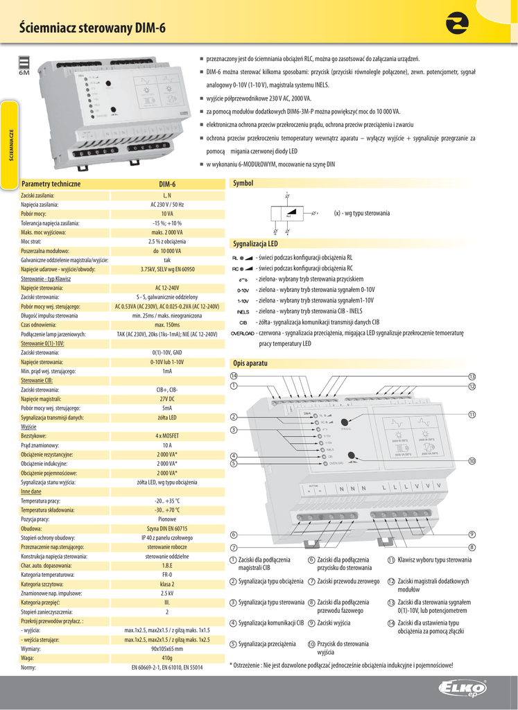 Ściemniacz sterowany DIM-6 ! przeznaczony jest do ściemniania obciążeń RLC, można go zasotsować do załączania urządzeń. ! DIM-6 można sterować kilkoma sposobami: przycisk (przyciski równolegle połączone), zewn. potencjometr, sygnał analogowy 0-10V (1-10 V), magistrala systemu INELS. 2 2 ! wyjście półprzewodnikowe 230 V AC, 2000 VA. ! za pomocą modułów dodatkowych DIM6-3M-P można powiększyć moc do 10 000 VA. ! elektroniczna ochrona przeciw przekroczeniu prądu, ochrona przeciw przeciążeniu i zwarciu ! ochrona przeciw przekroczeniu temoperatury wewnątrz aparatu – wyłączy wyjście + sygnalizuje przegrzanie za 2 ŚCIEMNIACZE 2 pomocą migania czerwonej diody LED ! Parametry techniczne Zaciski zasilania: Napięcia zasilania: Pobór mocy: Tolerancja napięcia zasilania: Maks. moc wyjściowa: Moc strat: Poszerzalna modułowo: Galwaniczne oddzielenie magistrala/wyjście: Napięcie udarowe - wyjście/obwody: Sterowanie - typ Klawisz Napięcie sterowania: Zaciski sterowania: Pobór mocy wej. sterującego: Długość impulsu sterowania Czas odnowienia: Podłączenie lamp jarzeniowych: Sterowanie 0(1)-10V: Zaciski sterowania: Napięcie sterowania: Min. prąd wej. sterującego: Sterowanie CIB: Zaciski sterowania: Napięcie magistrali: Pobór mocy wej. sterującego: Sygnalizacja transmisji danych: Wyjście Bezstykowe: Prąd znamionowy: Obciążenie rezystancyjne: Obciążenie indukcyjne: Obciążenie pojemnościowe: Sygnalizacja stanu wyjścia: Inne dane Temperatura pracy: Temperatura składowania: Pozycja pracy: Obudowa: Stopień ochrony obudowy: Przeznaczenie nap.sterującego: Konstrukcja napięcia sterowania: Char. auto. dopasowania: Kategoria temperaturowa: Kategoria szczytowa: Znamionowe nap. impulsowe: Kategoria przepięć: Stopień zanieczyszczenia: Przekrój przewodów przyłacz. : - wyjścia: - wejścia sterujące: Wymiary: Waga: Normy: w wykonaniu 6-MODUŁOWYM, mocowanie na szynę DIN DIM-6 L, N AC 230 V / 50 Hz 10 VA -15 %; +10 % maks. 2 000 VA 2.5 % z obciążenia do 10 000 VA tak 3.75kV, SELV wg EN 60950 Symbol L V R,L,C (x) CIB+, CIB27V DC 5mA żółta LED N Sygnalizacja LED - świeci podczas konfiguracji obciążenia RL - świeci podczas konfiguracji obciążenia RC - zielona- wybrany tryb sterowania przyciskiem - zielona - wybrany tryb sterowania sygnałem 0-10V - zielona - wybrany tryb sterowania sygnałem1-10V - zielona - wybrany tryb sterowania CIB - INELS - żółta- sygnalizacja komunikacji transmisji danych CIB - czerwona - sygnalizacia przeciążenia, migająca LED sygnalizuje przekroczenie temoeraturę pracy temperatury LED AC 12-240V S - S, galwanicznie oddzielony AC 0.53VA (AC 230V), AC 0.025-0.2VA (AC 12-240V) min. 25ms / maks. nieograniczona max. 150ms TAK (AC 230V), 20ks (1ks-1mA); NIE (AC 12-240V) 0(1)-10V, GND 0-10V lub 1-10V 1mA (x) - wg typu sterowania Opis aparatu 14 13 1 12 2 11 3 4 x MOSFET 10 A 2 000 VA* 2 000 VA* 2 000 VA* żółta LED, wg typu obciążenia -20.. +35 °C -30.. +70 °C Pionowe Szyna DIN EN 60715 IP 40 z panelu czołowego sterowanie robocze sterowanie oddzielne 1.B.E FR-0 klasa 2 2.5 kV III. 2 max.1x2.5, max2x1.5 / z gilzą maks. 1x1.5 max.1x2.5, max2x1.5 / z gilzą maks. 1x2.5 90x105x65 mm 410g EN 60669-2-1, EN 61010, EN 55014 4 5 10 6 9 8 7 Zaciski dla podłączenia magistrali CIB 6 Zaciski dla podłączenia przycisku do sterowania 11 Klawisz wyboru typu sterowania 2 Sygnalizacja typu obciążenia 7 Zaciski przewodu zerowego 12 Zaciski magistrali dodatkowych modułów 3 Sygnalizacja typu sterowania 8 Zaciski dla podłączenia przewodu fazowego 13 Zaciski dla sterowania sygnałem 0(1)-10V, lub potencjometrem 4 Sygnalizacja komunikacji CIB 9 Zaciski wyjścia 14 Zaciski dla ustawienia typu obciążenia za pomocą złączki 5 Sygnalizacja przeciążenia 1 10 Przycisk do sterowania wyjścia * Ostrzeżenie : Nie jest dozwolone podłączać jednocześnie obciążenia indukcyjne i pojemnościowe!