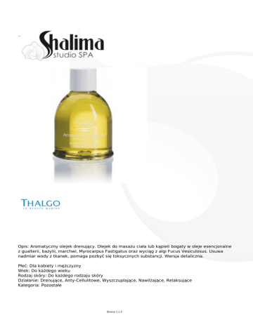Opis: Aromatyczny olejek drenujący. Olejek do masażu ciała lub kąpieli bogaty w oleje esencjonalne z gualterii, bazylii, marchwi, Myrocarpus Fastigatus oraz wyciąg z algi Fucus Vesiculosus. Usuwa nadmiar wody z tkanek, pomaga pozbyć się toksycznych substancji. Wersja detaliczna. Płeć: Dla kobiety i mężczyzny Wiek: Do każdego wieku Rodzaj skóry: Do każdego rodzaju skóry Działanie: Drenujące, Anty-Cellulitowe, Wyszczuplające, Nawilżające, Relaksujące Kategoria: Pozostałe Strona 1 z 2 Strona 2 z 2