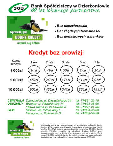 ♦ Bez ubezpieczenia ♦ Bez zbędnych formalności ♦ Bez dodatkowych warunków Kredyt bez prowizji Kwota kredytu 1 rok 2 lata 3 lata 5 lat 7 lat 1.000zł 91zł 49zł 35zł 24zł 20zł 5.000zł 452zł 243zł 174zł 119zł 97zł 10.000zł 903zł 485zł 347zł 238zł 193zł CENTRALA Dzierżoniów, ul. Daszyńskiego 24 ODDZIAŁY Bielawa, ul. Piłsudskiego 74 Piława Górna ul. Kościuszki 2 FILIE Bielawa, os. Włókniarzy 1 Pieszyce, ul. Kościuszki 3 tel. 74/831-29-10 tel. 74/833-38-60 tel. 74/837-21-35 tel. 74/833-45-58 tel. 74/836-52-56 Informacja oparta na reprezentatywnym przykładzie: całkowita kwota kredytu 4750zł, okres kredytowania 24 miesiące, miesięczna rata równa kredytu 230,31zł, roczne oprocentowanie nominalne 15,00%, kwota odsetek 775,43zł, prowizja za udzielenie kredytu 0,00zł, koszt zabezpieczenia kredytu 0,00zł. Przy przyjęciu w/w parametrów RRSO wynosi 16,08%, całkowita kwota do zapłaty, stanowiąca sumę całkowitej kwoty kredytu oraz całkowitego kosztu kredytu wynosi 5525,43zł. ♦ Bez ubezpieczenia ♦ Bez zbędnych formalności ♦ Bez dodatkowych warunków Kredyt z oprocentowaniem 9,99% Kwota kredytu 1 rok 2 lata 3 lata 5 lat 7 lat 1.000zł 93zł 49zł 34zł 23zł 18zł 5.000zł 463zł 243zł 170zł 112zł 88zł 10.000zł 926zł 486zł 340zł 224zł 175zł CENTRALA Dzierżoniów, ul. Daszyńskiego 24 ODDZIAŁY Bielawa, ul. Piłsudskiego 74 Piława Górna ul. Kościuszki 2 FILIE Bielawa, os. Włókniarzy 1 Pieszyce, ul. Kościuszki 3 tel. 74/831-29-10 tel. 74/833-38-60 tel. 74/837-21-35 tel. 74/833-45-58 tel. 74/836-52-56 Informacja oparta na reprezentatywnym przykładzie: całkowita kwota kredytu 4750zł, okres kredytowania 24 miesiące, miesięczna rata równa kredytu 230,70zł, roczne oprocentowanie nominalne 9,99%, kwota odsetek 535,55zł, prowizja za udzielenie kredytu 250,00zł, koszt zabezpieczenia kredytu 0,00zł. Przy przyjęciu w/w parametrów RRSO wynosi 16,29%, całkowita kwota do zapłaty, stanowiąca sumę całkowitej kwoty kredytu oraz całkowitego kosztu kredytu wynosi 5535,55zł.
