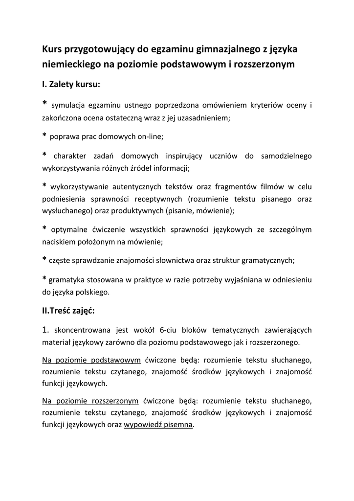 Kurs przygotowujący do egzaminu gimnazjalnego z języka niemieckiego na poziomie podstawowym i rozszerzonym I. Zalety kursu: * symulacja egzaminu ustnego poprzedzona omówieniem kryteriów oceny i zakończona ocena ostateczną wraz z jej uzasadnieniem; * poprawa prac domowych on-line; * charakter zadań domowych inspirujący uczniów do samodzielnego wykorzystywania różnych źródeł informacji; * wykorzystywanie autentycznych tekstów oraz fragmentów filmów w celu podniesienia sprawności receptywnych (rozumienie tekstu pisanego oraz wysłuchanego) oraz produktywnych (pisanie, mówienie); * optymalne ćwiczenie wszystkich sprawności językowych ze szczególnym naciskiem położonym na mówienie; * częste sprawdzanie znajomości słownictwa oraz struktur gramatycznych; * gramatyka stosowana w praktyce w razie potrzeby wyjaśniana w odniesieniu do języka polskiego. II.Treść zajęć: 1. skoncentrowana jest wokół 6-ciu bloków tematycznych zawierających materiał językowy zarówno dla poziomu podstawowego jak i rozszerzonego. Na poziomie podstawowym ćwiczone będą: rozumienie tekstu słuchanego, rozumienie tekstu czytanego, znajomość środków językowych i znajomość funkcji językowych. Na poziomie rozszerzonym ćwiczone będą: rozumienie tekstu słuchanego, rozumienie tekstu czytanego, znajomość środków językowych i znajomość funkcji językowych oraz wypowiedź pisemna. *Blok tematyczny A obejmuje następujące domeny tematyczne: człowiek; życie rodzinne i towarzyskie, dzień powszedni; formy spędzania czasu wolnego, święta i uroczystości; dom oraz zagadnienia gramatyczne: konjugacja czasownika regularnego i nieregularnego w czasie teraźniejszym PRÄSENS, deklinacja rodzajnika określonego i nieokreślonego oraz zaimków dzierżawczych i osobowych, przyimki z DATIVEM i AKKUSATIVEM, tryb rozkazujący IMPERATIV ; *Blok tematyczny B obejmuje następujące domeny tematyczne: szkoła – przedmioty nauczania, oceny i wymagania; praca – popularne zawody i związane z nimi czynności; oraz zagadnienia gramatyczne: czasowniki modalne i zdania modalne w czasie PRÄSENS, czasowniki rozdzielnie- i nierozdzielnie złożone w czasie PRÄSENS. ; *Blok tematyczny C obejmuje następujące domeny tematyczne: żywienie – artykuły spożywcze, przygotowanie potraw, posiłki, lokale gastronomiczne; zakupy i usługi – rodzaje sklepów, towary, sprzedawanie i kupowanie; oraz zagadnienia gramatyczne: zdania niemodalne i modalne w czasie IMPERFEKT i PERFEKT; zaimki pytające i wskazujące. ; *Blok tematyczny D obejmuje następujące domeny tematyczne: mediarodzaje mediów, ich wpływ na nasze życie; podróżowanie i turystyka – środki transportu, baza noclegowa, informacja turystyczna; oraz zagadnienia gramatyczne: deklinacja mocna i słaba rzeczownika, deklinacja i stopniowanie przymiotników. ; *Blok tematyczny E obejmuje następujące domeny tematyczne: elementy wiedzy o krajach obszaru językowego, którego język jest zdawany; oraz zagadnienia gramatyczne: zdania współrzędnie złożone i ich spójniki, zdania podrzędnie złożone i ich spójniki. ; *Blok tematyczny F obejmuje następujące domeny tematyczne: zasady konstruowania różnych form prostych wypowiedzi: a). ustnych – formy nawiązywania kontaktu z rozmówcą, przekazywania komunikatu i kończenia rozmowy; b). pisemnych – ogłoszenia, notatki, ankiety, pocztówki, zaproszenia, listu prywatnego, prostego listu formalnego, do tego symulacja egzaminu ustnego oraz zagadnienia gramatyczne: zdania modalne i niemodalne w czasie przyszłym FUTUR I. 2. jest podporządkowana typom wypowiedzi ustnej (relacja, pozyskiwanie informacji, negocjacja, opis fotografii, prezentacja materiału stymulowanego itd.) i pisemnej (notatka, zaproszenie, ankieta, list formalny, list nieformalny, recenzja, opowiadanie, rozprawka itd.) oraz przekłada się na materiał leksykalno-gramatyczny w zależności od poziomu wymagań egzaminu gimnazjalnego (egzamin z języka niemieckiego na poziomie podstawowym i rozszerzonym). Wypowiedź pisemna ćwiczona jest dla poziomu rozszerzonego. 3.obejmuje stałe ćwiczenie oraz sprawdzanie znajomości struktur gramatycznych i leksykalnych wraz wyjaśnieniem nieznanych zagadnień również w języku polskim 4. obejmuje symulację ustnego egzaminu maturalnego z języka angielskiego wraz z omówieniem kryteriów oceny oraz wystawieniem oceny za egzamin z uzasadnieniem. III.Cele operacyjne kursu: *znaczne podwyższenie poziomu sprawności językowych – zwłaszcza umiejętności formułowania wypowiedzi ustnych; *podniesienie poziomu znajomości leksyki i struktur gramatycznych w zakresie wybranych standardów wymagań. IV. Warianty kursu: Proponujemy dwa warianty: Wariant A: obejmuje 48 godzin lekcyjnych. Zajęcia półtoragodzinne odbywają się dwa razy na tydzień. Wariant B: obejmuje 72 godziny lekcyjne. Zajęcia półtora godzinne odbywają się trzy razy w tygodniu. W obu wariantach realizowane są oba poziomy wymagań egzaminacyjnych (podstawowy i rozszerzony) z tą różnicą , że wariant A koncentruje się bardziej na poziomie podstawowym natomiast wariant B – na poziomie poszerzonym.