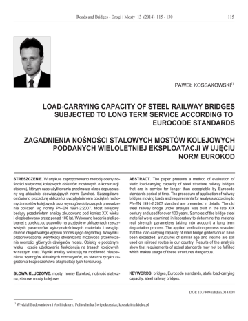 Roads and Bridges - Drogi i Mosty 13 (2014) 115 - 130 115 PAWE£ KOSSAKOWSKI1) LOAD-CARRYING CAPACITY OF STEEL RAILWAY BRIDGES SUBJECTED TO LONG TERM SERVICE ACCORDING TO EUROCODE STANDARDS ZAGADNIENIA NOŒNOŒCI STALOWYCH MOSTÓW KOLEJOWYCH PODDANYCH WIELOLETNIEJ EKSPLOATACJI W UJÊCIU NORM EUROKOD STRESZCZENIE. W artykule zaproponowano metodê oceny noœnoœci statycznej kolejowych obiektów mostowych o konstrukcji stalowej, których czas u¿ytkowania przekracza okres dopuszczany wg aktualnie obowi¹zuj¹cych norm Eurokod. Szczegó³owo omówiono procedurê obliczeñ z uwzglêdnieniem obci¹¿eñ ruchomych mostów kolejowych oraz wymogów dotycz¹cych prowadzenia obliczeñ wg normy PN-EN 1991-2:2007. Most kolejowy bêd¹cy przedmiotem analizy zbudowano pod koniec XIX wieku i eksploatowano przez ponad 100 lat. Wykonano badania stali pobranej z obiektu, co pozwoli³o na przyjêcie w obliczeniach rzeczywistych parametrów wytrzyma³oœciowych materia³u i uwzglêdnienie d³ugotrwa³ego wp³ywu procesu jego degradacji. W wyniku przeprowadzonej weryfikacji stwierdzono mo¿liwoœæ przekroczenia noœnoœci g³ównych dŸwigarów mostu. Obiekty o podobnym wieku i czasie u¿ytkowania funkcjonuj¹ na trasach kolejowych w naszym kraju. Wyniki analizy wskazuj¹ na mo¿liwoœæ niespe³nienia wymogów aktualnych normatywów, co stwarza ryzyko zagro¿enia bezpieczeñstwa eksploatacji tych konstrukcji. ABSTRACT. The paper presents a method of evaluation of static load-carrying capacity of steel structure railway bridges that are in service for longer than acceptable by Eurocode standards period of time. The procedure of application of railway bridges moving loads and requirements for analysis according to PN-EN 1991-2:2007 standard are presented in details. The old steel railway bridge under analysis was built in the late XIX century and used for over 100 years. Samples of the bridge steel material were examined in laboratory to determine the material real strength parameters taking into account a long term degradation process. The applied verification process revealed that the load-carrying capacity of main bridge girders could have been exceeded. Structures of similar age and lifetime are still used on railroad routes in our country. Results of the analysis show that requirements of actual standards may not be fulfilled which makes usage of these structures dangerous. S£OWA KLUCZOWE: mosty, normy Eurokod, noœnoœæ statyczna, stalowe mosty kolejowe. KEYWORDS: bridges, Eurocode standards, static load-carrying capacity, steel railway bridges. DOI: 10.7409/rabdim.014.008 1) Wydzia³ Budownictwa i Architektury, Politechnika Œwiêtokrzyska; [email protected] 116 Pawe³ Kossakowski 1. WPROWADZENIE 1. INTRODUCTION Obiekty budowlane w ci¹gu wieloletniej eksploatacji w naturalny sposób ulegaj¹ degradacji. Rozwój zjawisk destrukcyjnych sprzyja inicjacji uszkodzeñ co prowadzi do obni¿enia parametrów wytrzyma³oœciowych materia³u. Bardzo czêsto przyjmuje siê, ¿e parametrem, za pomoc¹ którego szacuje siê stopieñ degradacji materia³u jest czas u¿ytkowania konstrukcji, a podstawowym wskaŸnikiem okreœlaj¹cym okres niezawodnej eksploatacji konstrukcji budowlanej jest jej trwa³oœæ. Aktualnie czêsto funkcjonuj¹ obiekty zbudowane sto, a nawet dwieœcie lat temu. Konstrukcje te s¹ szczególnie nara¿one na uszkodzenie z uwagi na zastosowane w nich materia³y takie jak ¿eliwo i stal zgrzewna lub stal zlewna oraz cykliczny charakter obci¹¿eñ. Aktualnie obowi¹zuj¹ce normy okreœlaj¹ trwa³oœæ obiektów mostowych na 100 lat [1], nale¿y wiêc zak³adaæ, ¿e ¿ywotnoœæ tak d³ugo eksploatowanych konstrukcji mo¿e byæ wyczerpana, co powoduje koniecznoœæ badania ich stanu technicznego. Badania te, interesuj¹ce zarówno z praktycznego jak i poznawczego punktu widzenia, s¹ przedmiotem zainteresowania zarówno zarz¹dców obiektów jak i naukowców prowadz¹cych badania w tym zakresie, np. [2-6]. All man-made structures are subject to natural deterioration during the years of service. The process of deterioration encourages initiation of damages affecting the strength parameters of the material. The time of service is often used to estimate the degree of deterioration of the material in question and durability is the key factor used to estimate the time of reliable operation of the structure. Presently it is not uncommon to find bridges which were built a hundred or even two hundred years ago which are still in operation. Such structures are particularly sensitive to damage due to the specific characteristics of the materials which were in use at the time of their construction (such as cast iron, puddled steel and cast steel) and cyclic service loads. Taking into account that the service lifetime of bridges, according to the current standards is 100 years [1] we can expect that the bridges in question have exceeded their design service life and this calls for examination of their technical condition. Such examinations are interesting from practical point of view to their operators as well as to the researchers interested in the subject, for example [2-6]. Koniecznoœæ oceny aktualnej noœnoœci obiektów o ponadnormatywnym okresie eksploatacji wynika równie¿ z powodu wzrostu prêdkoœæ poci¹gów. Zjawiska dynamiczne i zmêczeniowe s¹ szczególnie niebezpieczne dla obiektów starych, wykonanych z materia³ów o zdegradowanej strukturze i niskich wartoœciach parametrów mechanicznych. The line speed of trains increases nowadays and this is another factor calling for load rating of bridges operated longer than their service lifetime. Old bridges are particularly sensitive to dynamic and fatigue loads due to internal structure deterioration of the materials they are built of, as well as low mechanical strength parameters. W artykule zestawiono wybrane informacje na temat w³aœciwoœci mechanicznych stali stosowanych w mostownictwie w XIX i na pocz¹tku XX wieku oraz wykonano an
