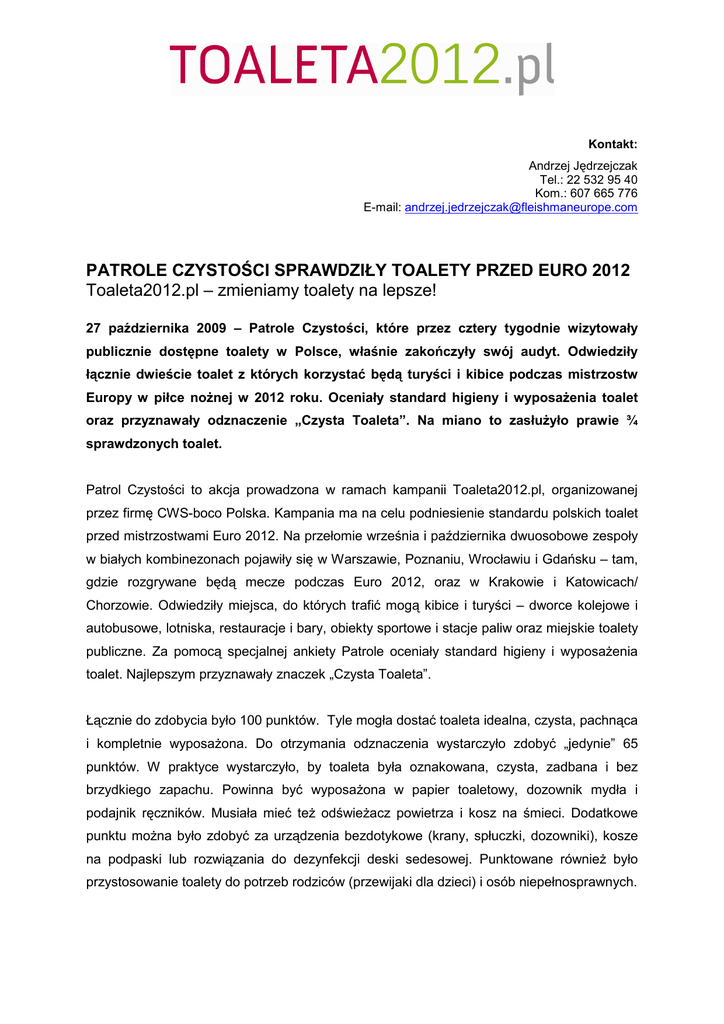 Kontakt: Andrzej Jędrzejczak Tel.: 22 532 95 40 Kom.: 607 665 776 E-mail: [email protected] PATROLE CZYSTOŚCI SPRAWDZIŁY TOALETY PRZED EURO 2012 Toaleta2012.pl – zmieniamy toalety na lepsze! 27 października 2009 – Patrole Czystości, które przez cztery tygodnie wizytowały publicznie dostępne toalety w Polsce, właśnie zakończyły swój audyt. Odwiedziły łącznie dwieście toalet z których korzystać będą turyści i kibice podczas mistrzostw Europy w piłce noŜnej w 2012 roku. Oceniały standard higieny i wyposaŜenia toalet oraz przyznawały odznaczenie „Czysta Toaleta”. Na miano to zasłuŜyło prawie ¾ sprawdzonych toalet. Patrol Czystości to akcja prowadzona w ramach kampanii Toaleta2012.pl, organizowanej przez firmę CWS-boco Polska. Kampania ma na celu podniesienie standardu polskich toalet przed mistrzostwami Euro 2012. Na przełomie września i października dwuosobowe zespoły w białych kombinezonach pojawiły się w Warszawie, Poznaniu, Wrocławiu i Gdańsku – tam, gdzie rozgrywane będą mecze podczas Euro 2012, oraz w Krakowie i Katowicach/ Chorzowie. Odwiedziły miejsca, do których trafić mogą kibice i turyści – dworce kolejowe i autobusowe, lotniska, restauracje i bary, obiekty sportowe i stacje paliw oraz miejskie toalety publiczne. Za pomocą specjalnej ankiety Patrole oceniały standard higieny i wyposaŜenia toalet. Najlepszym przyznawały znaczek „Czysta Toaleta”. Łącznie do zdobycia było 100 punktów. Tyle mogła dostać toaleta idealna, czysta, pachnąca i kompletnie wyposaŜona. Do otrzymania odznaczenia wystarczyło zdobyć „jedynie” 65 punktów. W praktyce wystarczyło, by toaleta była oznakowana, czysta, zadbana i bez brzydkiego zapachu. Powinna być wyposaŜona w papier toaletowy, dozownik mydła i podajnik ręczników. Musiała mieć teŜ odświeŜacz powietrza i kosz na śmieci. Dodatkowe punktu moŜna było zdobyć za urządzenia bezdotykowe (krany, spłuczki, dozowniki), kosze na podpaski lub rozwiązania do dezynfekcji deski sedesowej. Punktowane równieŜ było przystosowanie toalety do potrzeb rodziców (przewijaki dla dzieci) i osób niepełnosprawnych. - Otrzymanie odznaczenia „Czysta Toaleta” wcale nie jest takie trudne. Wystarczy spełnić podstawowe wymagania – mówi Andrzej Smółko z firmy CWS-boco Polska, organizator kampanii Toaleta2012.pl. – Chcemy pokazywać dobre przykłady i dopingować tych, którym do osiągnięcia podstawowych standardów ciągle nieco brakuje. Znakomita większość toalet (aŜ 145 na 200 sprawdzonych przez Patrole Czystości) spełnia podstawowe wymogi. Średni wynik dla wszystkich kategorii wyniósł 65,9 punkta (czyli tuŜ ponad progiem minimalnym). Najlepiej wypadły toalety na lotniskach – zdobywając średnio 73 punkty. Wszystkie zbadane toalety lotniskowe otrzymały znaczek „Czysta Toaleta”. DuŜo gorzej prezentowały się toalety publiczne – zdobywając średnio 62 punkty. W tej kategorii znaczek zdobyło 29 na 46 sprawdzonych toalet (63%). Problemem jest teŜ ich dostępność. Z wytypowanych do audytu 56 toalet miejskich 8 było nieczynnych. Najgorsza sytuacja jest jednak na dworcach. Tylko 7 na 20 audytowanych toalet dworcowych (35%) spełnia podstawowe wymogi. Średnia ocena w tej kategorii to 50 punktów. Właśnie w toaletach publicznych i dworcowych najczęściej moŜemy zetknąć się z brzydkim zapachem (Patrolom Czystości przytrafiło się to w co szóstej (16%) publicznej toalecie miejskiej i w co czwartej toalecie na dworcu). Tam teŜ najczęściej zaskoczyć nas mogą takie niespodzianki jak choćby brak papieru toaletowego (w 11% toalet dworcowych i aŜ w 15% toalet miejskich). - Mamy nadzieję, Ŝe do 2012 roku podniesie się standard takŜe tych zaniedbanych miejsc, toalet dworcowych i miejskich. – mówi Andrzej Smółko z CWS-boco Polska. - Bardzo bym chciał, byśmy za 3 lata mogli z czystym sumieniem odznaczyć naszym znaczkiem wszystkie publicznie dostępne toalety w Polsce. Wówczas na pewno nie będziemy musieli się wstydzić przed rzeszą kibiców i turystów, którzy odwiedzą nasz kraj z okazji Euro2012.