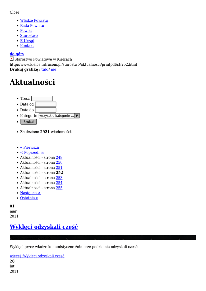 Close Władze Powiatu Rada Powiatu Powiat Starostwo E-Urząd Kontakt do góry Starostwo Powiatowe w Kielcach http://www.kielce.intracom.pl/starostwo/aktualnosci/printpdf/st:252.html Drukuj grafikę : tak / nie Aktualności Treść Data od Data do Kategorie wszystkie kategorie ... ▼ Szukaj Znaleziono 2921 wiadomości. « Pierwsza < Poprzednia Aktualności - strona 249 Aktualności - strona 250 Aktualności - strona 251 Aktualności - strona 252 Aktualności - strona 253 Aktualności - strona 254 Aktualności - strona 255 Następna > Ostatnia » 01 mar 2011 Wyklęci odzyskali cześć Wyklęci odzyskali cześć Wyklęci przez władze komunistyczne żołnierze podziemia odzyskali cześć. więcej :Wyklęci odzyskali cześć 28 lut 2011 Na kulturę, sport i turystykę Na kulturę, sport i turystykę Zarząd Powiatu w Kielcach ogłasza konkurs na realizację zadań dla organizacji prowadzących działalność pożytku publicznego. więcej :Na kulturę, sport i turystykę 25 lut 2011 Samorządy razem Samorządy razem O inwestycjach realizowanych wspólnie z gminami rozmawiano podczas spotkania samorządówców powiatu kieleckiego. więcej :Samorządy razem 25 lut 2011 Łamali głowy Łamali głowy Młodzież z powiatu kieleckiego rozwiązywała logiczne łamigłówki podczas eliminacji IV Świętokrzyskich Mistrzostw Szkół Ponadgimnazjalnych w Sudoku. więcej :Łamali głowy 24 lut 2011 Rodzice odznaczeni Rodzice odznaczeni Medale za "Zasługi dla obronności kraju" otrzymali rodzice, których przynajmniej trzech synów służyło w armii. więcej :Rodzice odznaczeni 24 lut 2011 Podziękowanie za wielkie serce Podziękowanie za wielkie serce Gratulacje i podziękowania za wielkie serce otrzymała ordynator Anna Kondała- Chojnacka. więcej :Podziękowanie za wielkie serce 24 lut 2011 Na kulturę i sport Na kulturę i sport Uchwałę o ogłoszeniu konkursu na zadania z pożytku publicznego podjął Zarząd Powiatu w Kielcach. więcej :Na kulturę i sport 23 lut 2011 Pod znakiem tradycji Pod znakiem tradycji Spotkanie organizacyjne VI Jarmarku Świętokrzyskiego odbyło się 23 lutego. więcej :Pod znakiem tradycji 23 lut 2011 Z sercem dla serca Z sercem dla serca Trwa kampania społeczna wojewody świętokrzyskiego Bożentyny Pałki ? Koruby pod hasłem: ?Z sercem dla serca?. więcej :Z sercem dla serca 22 lut 2011 Porady dla ofiar przestępstw Trwa Tydzień Pomocy Ofiarom Przestępstw (21 ? 26 lutego 2011). więcej :Porady dla ofiar przestępstw « Pierwsza < Poprzednia Aktualności - strona 249 Aktualności - strona 250 Aktualności - strona 251 Aktualności - strona 252 Aktualności - strona 253 Aktualności - strona 254 Aktualności - strona 255 Następna > Ostatnia »