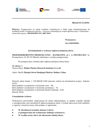 Błaszki 03.12.2010r. Dotyczy: Postępowania na zakup urządzeń wchodzących a skład ciagu technologicznego do produkcji profili z kompozytu drewno – tworzywo obejmujących zespół aglomeryzacji i wytłaczania: , oznaczenie sprawy: 5B/2010/RPO WŁ 2007-2013. Wykonawcy wg rozdzielnika Zawiadomienie o wyborze najkorzystniejszej oferty. PRZEDSIEBIORSTWO PRODUKCYJNO – HANDLOWE „S. i A. PIETRUCHA” ul. Przemysłowa 10, 98-235 Błaszki informuje o wyniku postępowania. W postępowaniu wybrano jako najkorzystniejszą ofertę firmy: Nr oferty: 1 Nazwa firmy: Dalian Plastics Research Institute Co.,Ltd Adres: No.11 Zhoujia Street Danjingzi District, Dalian, China Wartość oferty brutto: 1 120 000,00 USD (słownie: milion sto dwadzieścia tysięcy dolarów USA). Ilość punktów uzyskanych w kryterium cena – 80. Ilość punktów uzyskanych w kryterium gwarancja – 10. Ilość punktów uzyskanych w kryterium termin realizacji –6,66 Razem: 96,66 Uzasadnienie wyboru: Wykonawca potwierdził, załączonymi do oferty dokumentami, iż spełnia warunki udziału w postępowaniu oraz przedstawił najkorzystniejszą ofertę. Uzyskał najwyższą ilość punktów w oparciu o kryteria oceny ofert podane w ogłoszeniu. W określonym terminie złożono 2 oferty. Z postępowania nie wykluczono żadnego wykonawcy. W wyniku oceny ofert, nie odrzucono żadnej oferty. 1 Wykaz wykonawców, którzy złożyli oferty wraz z podaniem ceny oferty oraz punktacja przyznana ofertom. Numer oferty 1 2 Nazwa (firma) i adres wykonawcy Dalian Plastics Research Institute Co., Ltd No. 11 Zhoujia Street Ganjingzi District, Dalian, China Polymax Solution Inc 13053 20A Ave Surrey BC V4A 8L9 Canada Nazwa kryterium I Nazwa kryterium II cena gwarancja termin realizacji oraz ilość oraz ilość oraz ilość przyznanych przyznanych przyznanych punktów punktów punktów 1 120 000,00 USD 80 10 6,66 1 351 500,00 USD 65,6 10 10 Cena Nazwa kryterium III PPH „S i A Pietrucha” Właściciel Andrzej Pietrucha ........................................................ (data, podpis beneficjenta lub osoby upoważnionej) Rozdzielnik: 1 Dalian Plastics Research Institute, Co., Ltd No. 11 Zhoujia Street Ganjingzi District, Dalian, China 2 Polymax Solution Inc 13053 20A Ave Surrey BC V4A 8L9 Canada 3 a/a 2