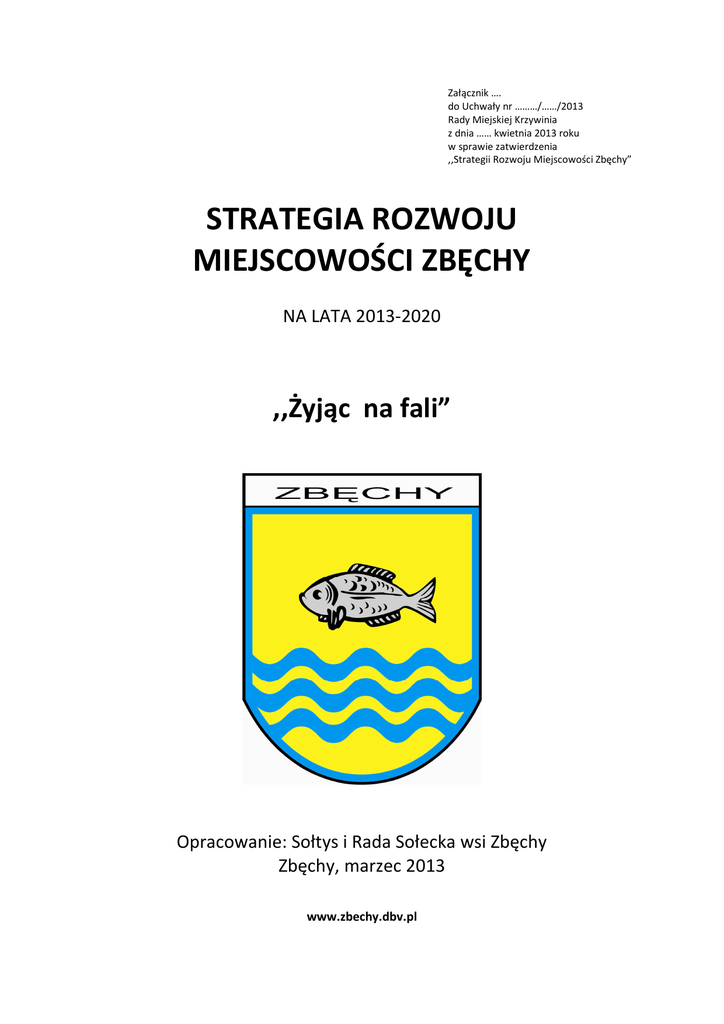 Załącznik …. do Uchwały nr ………/……/2013 Rady Miejskiej Krzywinia z dnia …… kwietnia 2013 roku w sprawie zatwierdzenia ,,Strategii Rozwoju Miejscowości Zbęchy” STRATEGIA ROZWOJU MIEJSCOWOŚCI ZBĘCHY NA LATA 2013-2020 ,,Żyjąc na fali” Opracowanie: Sołtys i Rada Sołecka wsi Zbęchy Zbęchy, marzec 2013 www.zbechy.dbv.pl I. Wprowadzenie Sołecka strategia to dokument opracowany przez grupę odnowy wsi Zbęch. Przedstawia bilans inwestycji, projektów, operacji, które udało się zrealizować wspólnie połączonymi siłami samorządu lokalnego, władz sołectwa i powstałej inicjatywy lokalnej. Jednocześnie dokonuje się analizy i diagnozy obecnych problemów miejscowości. Wyznacza również nowe kierunki, wyzwania i zadania do realizacji w najbliższej przyszłości. Opracowana strategia pokazuje jaki cel zamierza osiągnąć sołectwo docelowo do roku 2020. Prace nad strategią to owoc wspólnej inicjatywy i pracy zespołu ludzi, mieszkańców Zbęch, którym leży na sercu dobro ich miejscowości. O ich zaangażowaniu w życie wioski może świadczyć lista zrealizowanych zadań w okresie ostatnich kilkunastu lat. Strategia przyjmuje rolę integracji w stosunku do mieszkańców, organizacji pozarządowych oraz urzędu miasta i gminy Krzywiń. Wprowadzanie strategii powinno być spójne z strategią rozwoju gminy Krzywiń, przy współpracy z zespołem ludzi oraz przygotowanym zapleczem technicznym. W niniejszej strategii skupiono się na analizie zasobów oraz przedstawieniu planowanych działań, planu rozwoju miejscowości Zbęchy na najbliższe lata. Strategia skierowana jest do mieszkańców wsi, stowarzyszeń i grup nieformalnych (KGW, OSP), Urzędu Miasta i Gminy, Starostwa, Urzędu Marszałkowskiego. Działania wynikające z strategii rozwoju, przyjętej najpierw przez zebranie wiejskie mieszkańców, a następnie przez Radę Miejską Krzywinia powinny zostać przekształcone w konkretne działania na terenie wsi. II. Opis historyczny miejscowości Wieś powstała w poł. XIV w. na terenie należącym do klasztoru lubińskiego. Pierwsza wzmianka pochodzi z 1356 r. W trakcie badań archeologicznych odkryto tu osadę wielokulturową. Na półwyspie jeziora znajduje się grodzisko- obecnie zajęte pod uprawę. W roku 1793 należała do Klasztoru Benedyktynów w Lubiniu. W 1905 r. wieś przynależała do dóbr rycerskich Rąbiń i stanowiła własność Zygmunta Chłapowskiego. O 1926 r. jako właściciela wymieniany jest Andrzej Sobczyński. W 1881 r. powierzchnia dóbr wynosiła 333ha z czego 176ha zajmowały pola; 22ha łąki; 1,73 ha pastwiska; 15,75 ha nieużytki; 131,48 ha woda. We wsi znajduje się dwór neogotycki z końca XIX w., murowany, nieotynkowany, podpiwniczony, piętrowy, siedmioosiowy. Przy dworze pozostałości parku - ok. 0,3 ha, w skład drzewostanu wchodzą: stuletnie lipy, klony, jesiony. III. Nasze osiągnięcia – Zbęchy dziś Ostatnie ponad 20 lat działalności mieszkańców, Sołtysa i Rady Sołeckiej, ich zaangażowania w pracę na rzecz wsi ilustrują bogato udokumentowane Kroniki Wsi, które najlepiej obrazuję zakres wykonanych prac, inwestycji, wydarzeń sportowych i kulturalnych na terenie wsi Zbęchy. Do stałego krajobrazu wsi Zbęchy wpisały się cykliczne imprezy m.ni. tj. Balik dla Dzieci, Powitanie Wiosny, Majówka, dwudniowe Wianki, tradycyjne Dożynki Wiejskie, Zabawa Andrzejkowa. Wszystkie imprezy, wydarzenia kulturalne są organizowane wspólnie przez Radę Sołecką, OSP, KGW. Każdy każdego wspomaga. Wzajemne zrozumienie, poszanowanie wpływa na dobrze przygotowanie ww. imprez. Zakres wykonanych inwestycji na terenie wsi Zbęchy od 1994 roku prezentuje poniższa tabela, która przedstawia zadania, rok realizacji oraz źródła finansowania i poziom zaangażowania mieszkańców w realizację niektórych przedsięwzięć. Wiele z zrealizowanych projektów to determinacja Sołtysa i Rady Sołeckiej, mieszkańców wsi w dążeniu do osiągnięcia wyznaczonych celów. Tabela 1. Zakres wykonanych inwestycji na terenie wsi Zbęchy w latach 1994-2012. Źródło: Opracowanie własne na podstawie danych z Archiwum UMiG Krzywi IV. Analiza zasobów Rodzaj zasobu/kapitału Przyrodniczy - krajobraz - stan środowiska - klimat - roślinność - cenne obszary - gleby - wody powierzchniowe Kulturowy - architektura - przestrzeń wiejska publiczna - przestrzeń wiejska prywatna - zabytki - osobliwości kulturowe - święta, odpusty, imprezy - tradycje, obrzędy, gwara - zespoły, twórcy Obiekty i tereny - działki pod zabudowę mieszkaniową - działki pod domy letniskowe - działki pod zakłady usługowe i przemysł - pustosatny - tradycyjne nie użytkowane obiekty gospodarskie (stodoły, spichlerze, kuźnie, młyny itp.) Infrastruktura społeczna - place publicznych spotkań - sale spotkań - ścieżki rowerowe - szkoły - przedszkola - biblioteki - placówki opieki społecznej Informacja o dysponowaniu - płaski, miejscami lekkie wzniesienia, - dobry - powietrze czyste (w normie) - bujna, różnorodna - jezioro - dobre, rzyzne - wieś położona nad jeziorem - gospodarstwa rolne, zabudowa zagrodowa, - centrum rekreacji i wypoczynku, świetlica wiejska, - zadbane zagrody mieszkańców, zadbane ogródki, - ruiny pałacu - brak, w życie wsi angażują się nauczyciele z wykształcenia, którzy mieszkają we wsi i pracują z dziećmi, - Balik dla Dzieci, Powitanie Lata, Majówka, Wianki, Dożynki, Andrzejki, - gwara wielkopolski, dzieci uczęszczają do szkoły w Jerce, gdzie przygotowują uczniów do konkursów gwarowych, - młodzież grająca na instrumentach (występują podczas imprez o charakterze lokalnym, gminnym) Dzieci i młodzież uczęszczają na zajęcia popołudniowe, które odbywają się w świetlicy w ramach zajęć przygotowanych przez świetlicę środowiskową (gmina opłaca opiekuna świetlicy). - Tereny gminne – mała liczba - obecnie jest kilkadziesiąt domków letniskowych, tendencja rozwojowa, - b