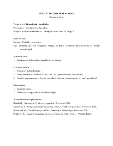 LEKCJE ARCHIWALNE w AGAD (konspekt nr 6) Temat lekcji: Genealogia i heraldyka Prowadzący: mgr Jarosław Zawadzki Miejsce: Archiwum Główne Akt Dawnych, Warszawa ul. Długa 7 Czas: 45 min. Metoda: Wykład z prezentacją Cel: poznanie sposobu czerpania wiedzy na temat wydarzeń historycznych ze źródeł archiwalnych Wprowadzenie: 1. Podstawowe informacje o heraldyce i genealogii Lekcja właściwa: 1. Najstarszy polski herbarz. 2. Herby i herbarze szlacheckie (XVI–XIX w.), potwierdzenia szlachectwa. 3. Sposoby sporządzania wykazów przodków (drzewa genealogiczne, wywody przodków). Zakończenie: 1. Podsumowanie. 2. Odpowiedzi na pytania uczestników lekcji. Wybrana literatura przedmiotu: Bąkała K., Genealogia. Praktyczny poradnik, Warszawa 2009. Laskowicz P., Księga genealogiczna twojej rodziny. Praktyczny poradnik, Warszawa 2005. Nowaczyk M., Poszukiwanie przodków. Genealogia dla każdego, Warszawa 2005. Prinke R. T., Poradnik genealoga amatora, Warszawa 1992 (wyd. II – Poznań 2007). Przykładowe dokumenty: Herb książęcy rodziny Radziwiłłów z inwentarza d. Łachwa w woj. nowogródzkim, własności Ludwiki Karoliny Radziwiłłówny, maj 1672, w Łachwie, AGAD, Archiwum Radziwiłłów, dz. XXV, nr 2166 Notatki herbowe Jana Zamoyskiego, późniejszego kanclerza i hetmana wielkiego koronnego, b. d., AGAD, Archiwum Zamoyskich, sygn. 33 Drzewo genealogiczne rodziny Radziwiłłów, miedzioryt rytowany w Gdańsku przez Petera Bossa, 1740-1742, AGAD, Nabytki Oddziału III, Zbiór wywodów przodków i drzew genealogicznych, sygn. 456
