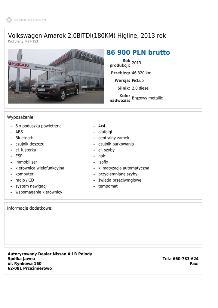 Volkswagen Amarok 2,0BiTDI(180KM) Higline, 2013 rok Kod oferty: NSP-153 86 900 PLN brutto Rok 2013 produkcji: Przebieg: 46 320 km Wersja: Pickup Silnik: 2.0 diesel Kolor Brązowy metallic nadwozia: Wyposażenie: - 6 x poduszka powietrzna ABS Bluetooth czujnik deszczu el. lusterka ESP immobiliser kierownica wielofunkcyjna komputer radio / CD system nawigacji wspomaganie kierownicy - 4x4 alufelgi centralny zamek czujnik parkowania el. szyby hak Isofix klimatyzacja automatyczna przyciemniane szyby światła przeciwmgłowe tempomat Informacje dodatkowe: Autoryzowany Dealer Nissan A i R Polody Spółka Jawna ul. Rynkowa 160 62-081 Przeźmierowo Tel.: 660-783-624 Fax: