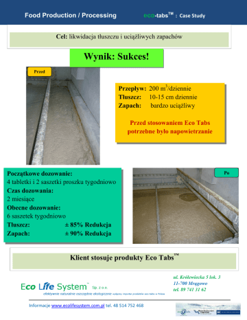eco-tabsTM : Case Study Food Production / Processing Cel: likwidacja tłuszczu i uciążliwych zapachów Wynik: Sukces! Przed Przepływ: 200 m3/dziennie Tłuszcz: 10-15 cm dziennie Zapach: bardzo uciążliwy Przed stosowaniem Eco Tabs potrzebne było napowietrzanie Początkowe dozowanie: 4 tabletki i 2 saszetki proszku tygodniowo Czas dozowania: 2 miesiące Obecne dozowanie: 6 saszetek tygodniowo Tłuszcz: ± 85% Redukcja Zapach: ± 90% Redukcja Po Klient stosuje produkty Eco Tabs™ ul. Królewiecka 5 lok. 3 11-700 Mrągowo tel. 89 741 31 62 Informacje www.ecolifesystem.com.pl tel. 48 514 752 468