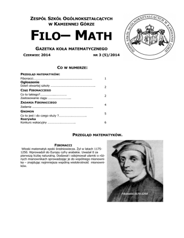 ZESPÓŁ SZKÓŁ OGÓLNOKSZTAŁCĄCYCH W KAMIENNEJ GÓRZE FILO– MATH GAZETKA KOŁA MATEMATYCZNEGO CZERWIEC 2014 NR 3 (5)/2014 CO W NUMERZE: PRZEGLĄD MATEMATYKÓW: Fibonacci…………………….……................................... 1 Ogłoszenie Dzień otwartej szkoły …………………………………………….. 2 CIĄG FIBONACCIEGO Co to takiego?……………...…………. Zastosowanie ciągu ……………………... 2 ZADANIA FIBONACCIEGO Zadania ................................................................. GNOMON Co to jest i do czego służy ?…………….…………….. Rozrywka Konkurs wakacyjny …………….…………….. 4 5 6 PRZEGLĄD MATEMATYKÓW. FIBONACCI Włoski matematyk epoki średniowiecza. Żył w latach 11751250. Wprowadził do Europy cyfry arabskie. Uważał 0 za pierwszą liczbę naturalną. Dodawał i odejmował ułamki o różnych mianownikach sprowadzając je do wspólnego mianownika – znajdując najmniejsza wspólną wielokrotność mianowników. Fibonacci 1175-1250 Dzień Otwartej Szkoły W dniu 29.04.2014 r. w Zespole Szkół Ogólnokształcących odbył się Dzień Otwartej Szkoły. Uczniowie klas trzecich gimnazjum mieli możliwość zwiedzenia szkoły, poznania atmosfery panującej w szkole, spotkania z kolegami i koleżankami uczącymi się w Liceum Ogólnokształcącym. Zostały przygotowane trzy ścieżki tematyczne, którymi podążali uczniowie 7 szkół gimnazjalnych wraz z opiekunami. Uczniowie zostali podzieleni na blok humanistyczno – przyrodniczy, matematyczno – przyrodniczy i blok dodatkowy prezentujący sale komputerowe, bibliotekę oraz prezentację związaną z projektem Lanterna Futuri. W tegorocznej edycji Dnia Otwartej Szkoły prezentację gabinetu matematycznego podjęły się panie Sylwia Cierpikowska, Sylwia Gawerda i Jolanta Myśliwiec. Pod ich opieką uczniowie klasy II a liceum przygotowali prezentację dotyczącą Fibonacciego oraz występowania ciągu Fibonacciego w przyrodzie. Czym jest ciąg Fibonacciego? Spośród wszystkich ciągów liczbowych, które występują, jeden jest szczególnie interesujący. Ciąg ten zawdzięcza swoją nazwę matematykowi z Pizy, Leonardowi, który pod nazwiskiem Fibonacci wydał w 1202 roku słynną księgę Liber Abaci. Ojciec Leonarda nosił przydomek Bonacci, stąd syn został Fibonaccim (filius Bonacci - syn dobrotliwego) Liczby naturalne tworzące ciąg o takiej własności, że kolejny wyraz (z wyjątkiem dwóch pierwszych) jest sumą dwóch poprzednich nazywa się liczbami Fibonacciego i pojawiają się w tak wielu sytuacjach, że wydaje się to niemożliwe. Graficzny zapis ciągu Fibonacciego Liczby Fibonacciego są więc sumami liczb z przekątnych w trójkącie Pascala (rysunek powyżej). Ciąg Fibonacciego to ciąg liczb określony rekurencyjnie w sposób następujący: F0 = 0 F1 = 1 Fn = Fn-1 + Fn-2, dla n ≥ 2 Początkowe wartości tego ciągu to: 0, 1, 1, 2, 3, 5, 8, 13, 21, 34, 55, 89, 144, 233, ... 2 Ciąg Fibonacciego Ciąg Fibonacciego ma zastosowanie w geometrii – pokrycie płaszczyzny kwadratami będącymi n-tym wyrazem ciągu. Należy do ulubionych ciągów spotykanych w przyrodzie – można go odnaleźć w wielu jej aspektach – zarówno w kształtach fizycznych struktur, jak i w przebiegu zmian w strukturach dynamicznych. Jeszcze jedną ciekawostką dotyczącą ciągu Leonarda z Pizy jest spirala Fibonacciego. Najlepszym jej przykładem w przyrodzie są muszle. Gdyby spojrzeć na muszlę łodzika (morskiego mięczaka) w przekroju: widać, że ułożona jest spiralnie i zbudowana z szeregu komór, z których każda następna jest większa od poprzedniej dokładnie o tyle, ile wynosi wielkość tej poprzedniej. Wynika to z faktu, że im są większe, tym szybciej rosną. Ciąg Fibonacciego jest przykładem przedziwnego splatania się matematyki z przyrodą. Przypomnijmy sobie bowiem, że sam pomysł ciągu Fibonacciego powstał dzięki idealizacji zjawiska przyrodniczego (rozmnażanie królików), a następnie okazało się, że tak wymyślone pojęcie powraca do przyrody. Przygotowali: Malwina Lebek-Andersz Marlena Zarzycka Jacek Wasilewski Karolina Trojankowska Klaudia Pres 3 Zadania Fibonacciego 3. Trzech mężczyzn znalazło sakiewkę zawierającą 23 denary. Pierwszy po- Prace Fibonacciego zawierają szereg mate- wiedział do drugiego: Jeżeli dodam te matycznych problemów: pieniądze do swoich, to będę miał dwa razy więcej od ciebie. Drugi podobnie zwrócił się do trzeciego: Ja 1. Dwa ptaki wylatują w tym samym momencie ze szczytów dwóch wież, odległych od siebie o 50 metrów. Wyso- zaś, jeżeli wezmę te pieniądze, będę miał trzy razy więcej od ciebie. W kość jednej wieży wynosi 30 metrów, a końcu trzeci powiedział do pierwsze- drugiej 40 metrów. Lecąc z tą sama go: Ja dodając te pieniądze do swoich prędkością dolatują w tym samym mo- będę miał cztery razy więcej niż ty. Ile mencie do fontanny, usytuowanej na denarów miał każdy z nich? prostej pomiędzy dwiema wieżami (na poziomie gruntu). W jakiej odległości od podstawy każdej wieży znajduje się fontanna? 2. Kupiec podczas swojej podróży handlowej do Wenecji podwoił tam swój początkowy kapitał, a następnie wydał 12 Przykład ciągu Fibonacciego denarów. Potem udał się do Florencji, gdzie znowu podwoił liczbę posiada- 3. Ile par królików może spłodzić jedna nych denarów i wydał 12. Po powrocie para w ciągu roku, jeśli do Pizy po raz kolejny podwoił swój - każda para rodzi nową parę w ciągu majątek, wydał dwanaście denarów miesiąca, i ... został bez grosza. Ile denarów - para staje się płodną po miesiącu, miał na początku? - króliki nie zdychają? 4 Mamy równanie A2 = x2 + B2 + 2Bx. Znamy wartości a i b, poszukujemy A i B. Gnomon B= Co to jest gnomon i do czego służy? Jest to zacieniowana figura złożona z dwóch prostokątów i kwadratu… Nic wam to nie mówi jak na razie… W 