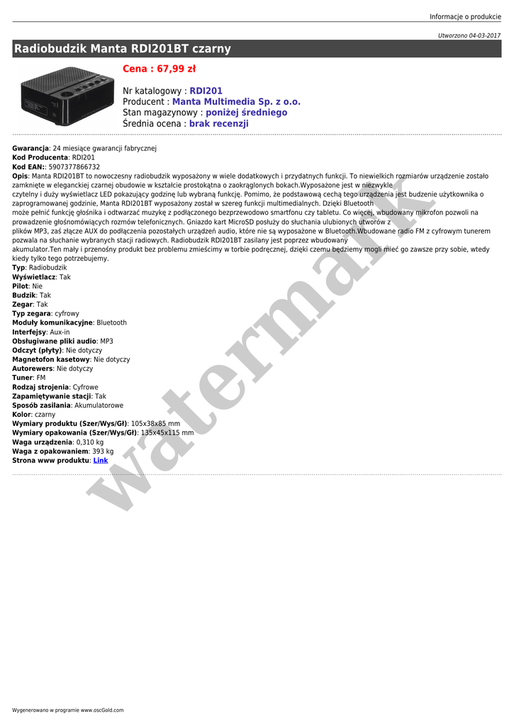 Informacje o produkcie Utworzono 04-03-2017 Radiobudzik Manta RDI201BT czarny Cena : 67,99 zł Nr katalogowy : RDI201 Producent : Manta Multimedia Sp. z o.o. Stan magazynowy : poniżej średniego Średnia ocena : brak recenzji w at er m ar k Gwarancja: 24 miesiące gwarancji fabrycznej Kod Producenta: RDI201 Kod EAN:: 5907377866732 Opis: Manta RDI201BT to nowoczesny radiobudzik wyposażony w wiele dodatkowych i przydatnych funkcji. To niewielkich rozmiarów urządzenie zostało zamknięte w eleganckiej czarnej obudowie w kształcie prostokątna o zaokrąglonych bokach.Wyposażone jest w niezwykle czytelny i duży wyświetlacz LED pokazujący godzinę lub wybraną funkcję. Pomimo, że podstawową cechą tego urządzenia jest budzenie użytkownika o zaprogramowanej godzinie, Manta RDI201BT wyposażony został w szereg funkcji multimedialnych. Dzięki Bluetooth może pełnić funkcję głośnika i odtwarzać muzykę z podłączonego bezprzewodowo smartfonu czy tabletu. Co więcej, wbudowany mikrofon pozwoli na prowadzenie głośnomówiących rozmów telefonicznych. Gniazdo kart MicroSD posłuży do słuchania ulubionych utworów z plików MP3, zaś złącze AUX do podłączenia pozostałych urządzeń audio, które nie są wyposażone w Bluetooth.Wbudowane radio FM z cyfrowym tunerem pozwala na słuchanie wybranych stacji radiowych. Radiobudzik RDI201BT zasilany jest poprzez wbudowany akumulator.Ten mały i przenośny produkt bez problemu zmieścimy w torbie podręcznej, dzięki czemu będziemy mogli mieć go zawsze przy sobie, wtedy kiedy tylko tego potrzebujemy. Typ: Radiobudzik Wyświetlacz: Tak Pilot: Nie Budzik: Tak Zegar: Tak Typ zegara: cyfrowy Moduły komunikacyjne: Bluetooth Interfejsy: Aux-in Obsługiwane pliki audio: MP3 Odczyt (płyty): Nie dotyczy Magnetofon kasetowy: Nie dotyczy Autorewers: Nie dotyczy Tuner: FM Rodzaj strojenia: Cyfrowe Zapamiętywanie stacji: Tak Sposób zasilania: Akumulatorowe Kolor: czarny Wymiary produktu (Szer/Wys/Gł): 105x38x85 mm Wymiary opakowania (Szer/Wys/Gł): 135x45x115 mm Waga urządzenia: 0,310 kg Waga z opakowaniem: 393 kg Strona www produktu: Link Wygenerowano w programie www.oscGold.com