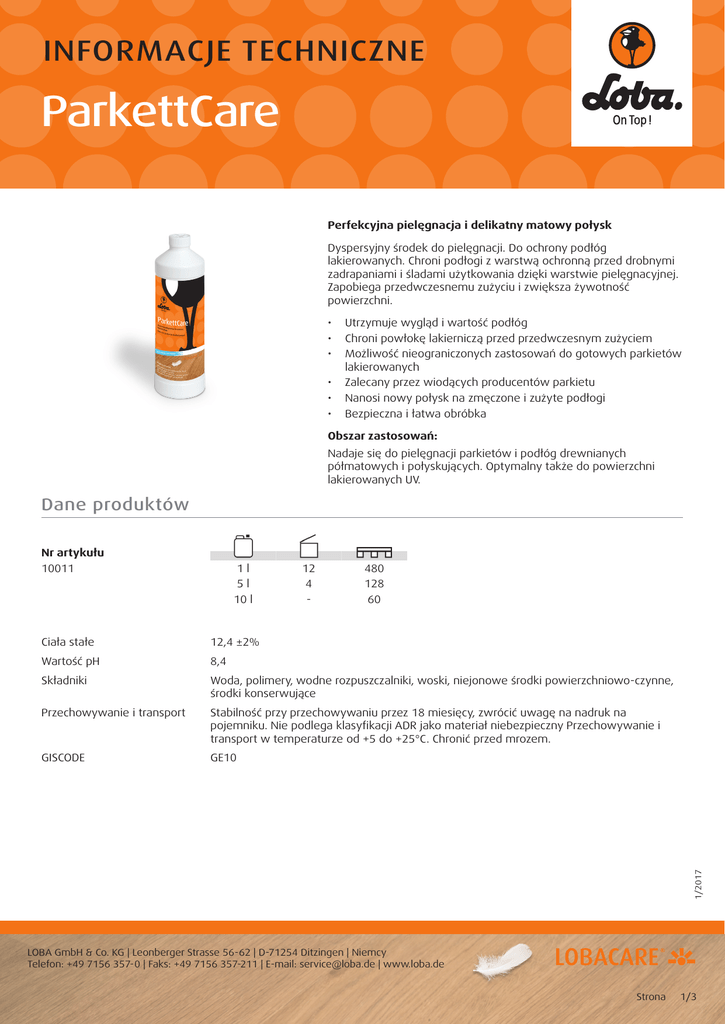 INFORMACJE TECHNICZNE ParkettCare Perfekcyjna pielęgnacja i delikatny matowy połysk Dyspersyjny środek do pielęgnacji. Do ochrony podłóg lakierowanych. Chroni podłogi z warstwą ochronną przed drobnymi zadrapaniami i śladami użytkowania dzięki warstwie pielęgnacyjnej. Zapobiega przedwczesnemu zużyciu i zwiększa żywotność powierzchni. • U trzymuje wygląd i wartość podłóg • Chroni powłokę lakierniczą przed przedwczesnym zużyciem • Możliwość nieograniczonych zastosowań do gotowych parkietów lakierowanych • Zalecany przez wiodących producentów parkietu • Nanosi nowy połysk na zmęczone i zużyte podłogi • Bezpieczna i łatwa obróbka Obszar zastosowań: Nadaje się do pielęgnacji parkietów i podłóg drewnianych półmatowych i połyskujących. Optymalny także do powierzchni lakierowanych UV. Dane produktów Nr artykułu 10011 1l 5l 10 l 12 4 - 480 128 60 12,4 ±2% Wartość pH 8,4 Składniki Woda, polimery, wodne rozpuszczalniki, woski, niejonowe środki powierzchniowo-czynne, środki konserwujące Przechowywanie i transport Stabilność przy przechowywaniu przez 18 miesięcy, zwrócić uwagę na nadruk na pojemniku. Nie podlega klasyfikacji ADR jako materiał niebezpieczny Przechowywanie i transport w temperaturze od +5 do +25°C. Chronić przed mrozem. GISCODE GE10 1/2017 Ciała stałe LOBA GmbH & Co. KG | Leonberger Strasse 56-62 | D-71254 Ditzingen | Niemcy Telefon: +49 7156 357-0 | Faks: +49 7156 357-211 | E-mail: [email protected] | www.loba.de Strona 1/3 INFORMACJE TECHNICZNE ParkettCare Instrukcje przetwarzania • Luźne zabrudzenia i pył usnąć najpierw odkurzaczem, miotłą lub mopem, następnie wytrzeć powierzchnię na mokro przy użyciu LOBACARE® CleanFix lub Cleaner. Mocno przywierające zanieczyszczenia i resztki starych środków do pielęgnacji należy najpierw usunąć, wykonując gruntowne czyszczenie przy użyciu LOBACARE® CareRemover. Przestrzegać przy tym informacji technicznych właściwych produktów. • Zachować ogólne i, w razie potrzeby, specyficzne dla produktu warunki bezpieczeństwa pracy. Bliższe informacje dotyczące GISCODE znajdują się w instrukcjach eksploatacji dostępnych pod adresem www.wingis-online.de. Rozcieńczalnik Produkt jest gotowy do obróbki i nie można go rozcieńczać! Urządzenie nanoszące/zużycie materiału Ściągacz LOBATOOL, na dużych powierzchniach odpowiedni mop płaski do ścierania / 30–40 ml(g)/m² = 25–35 m²/l(kg) = 3–4 l/100 m² Czas schnięcia • Możliwość chodzenia po 1–2 godzinach • Pełna obciążalność i pokrycie po 12 godzinach. Zastosowanie: Materiał nakłada się na podłogę odcinkami, a następnie nanosi równomierną warstwę. Urządzenie nanoszące przykładać do podłoży możliwie płasko i nie podnosić, pracować bez naciskania. Rozpocząć po jednej stronie pomieszczenia, a następnie pracować od ściany do ściany w kierunku strony z drzwiami wyjściowymi. Pomieszczenie należy dokładnie przygotować. W żadnym przypadku nie obrabiać ponownie podłogi podczas schnięcia, ponieważ mogą utworzyć się pasma. Czyszczenie gruntowne: Produkt może zostać usunięty przez gruntowne czyszczenie przy użyciu LOBACARE® CareRemover, szczegóły — patrz informacja techniczna dotycząca produktu. Ważne wskazówki 1/2017 Ze względu na różnorodność oferowanych powłok przemysłowych i lakierów w tym obszarze zalecamy także przestrzeganie zasad pielęgnacji producenta wykładziny, w razie wątpliwości skontaktować się z producentem wykładziny lub z firmą LOBA-Anwendungstechnik. Alternatywnie można także samodzielnie przeprowadzić test na powierzchni wzorcowej. LOBA GmbH & Co. KG | Leonberger Strasse 56-62 | D-71254 Ditzingen | Niemcy Telefon: +49 7156 357-0 | Faks: +49 7156 357-211 | E-mail: [email protected] | www.loba.de Strona 2/3 INFORMACJE TECHNICZNE ParkettCare Zasady ogólne Czyszczenie urządzeń roboczych: Urządzenia robocze czyścić natychmiast przy użyciu wody. Informacje zawarte w niniejszym dokumencie i wszystkie inne wskazówki oraz zalecenia podawane jako doradztwo wykonawcze są wynikiem dotychczasowych doświadczeń i odnoszą się do warunków normatywnych. W związku z różnorodnymi możliwościami zastosowań i warunkami obróbki niniejszym nie zwalniamy użytkownika z przeprowadzania własnych prób lub zasięgnięcia rady przez kontakt z firmą LOBA-Anwendungstechnik. Przestrzegać zaleceń producentów wykładzin i aktualnych norm. Nasze zasady rękojmi i odpowiedzialności są określone w Ogólnych Warunkach Handlowych i nie podlegają rozszerzeniu przez udzielanie przez nas informacji jak i doradztwo. Wydanie nowej informacji technicznej anuluje obowiązywanie starej informacji. 1/2017 Czas suszenia: Podane czasy suszenia obowiązują w temperaturze +20°C i przy wilgotności względnej 55% do 65% oraz przy starannej wentylacji pomieszczeń roboczych, bez przeciągów. Niższe temperatury, wyższa względna wilgotność powietrza, gorsza wentylacja prowadzą do wydłużenia czasów suszenia. Przed osiągnięciem końcowej twardości nie wykonywać czyszczenia i nie układać dywanów. Do przykrycia powierzchni przed osiągnięciem końcowej twardości użyć środka LOBATOOL Cover 400. Wytyczne specyficzne dla produktu znajdują się w odpowiednich dokumentacjach technicznych. LOBA GmbH & Co. KG | Leonberger Strasse 56-62 | D-71254 Ditzingen | Niemcy Telefon: +49 7156 357-0 | Faks: +49 7156 357-211 | E-mail: [email protected] | www.loba.de Strona 3/3