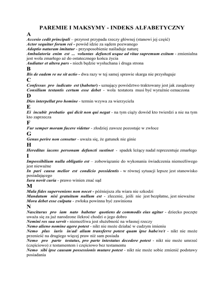 PAREMIE I MAKSYMY - INDEKS ALFABETYCZNY A Accesio cedit principali – przyrost przypada rzeczy głównej (stanowi jej część) Actor sequitur forum rei - powód idzie za sądem pozwanego Adoptio naturam imitatur - przysposobienie naśladuje naturę Ambulatoria enim est ... voluntas defuncti usque ad vitae supremum exitum - zmienialna jest wola zmarłego aŜ do ostatecznego końca Ŝycia Audiatur et altera pars - niech będzie wysłuchana i druga strona B Bis de eadem re ne sit actio - dwa razy w tej samej sprawie skarga nie przysługuje C Confessus pro iudicato est (habetur) - uznający powództwo traktowany jest jak zasądzony Consilium testantis certum esse debet - wola testatora musi być wyraźnie oznaczona D Dies interpellat pro homine - termin wzywa za wierzyciela E Ei incubit probatio qui dicit non qui negat - na tym ciąŜy dowód kto twierdzi a nie na tym kto zaprzecza F Fur semper moram facere videtur - złodziej zawsze pozostaje w zwłoce G Genus perire non censetur - uwaŜa się, Ŝe gatunek nie ginie H Hereditas iacens personam defuncti sustinet - spadek leŜący nadal reprezentuje zmarłego I Impossibilium nulla obligatio est – zobowiązanie do wykonania świadczenia niemoŜliwego jest niewaŜne In pari causa melior est condicio possidentis - w równej sytuacji lepsze jest stanowisko posiadającego Iura novit curia - prawo winien znać sąd M Mala fides superveniens non nocet - późniejsza zła wiara nie szkodzi Mandatum nisi gratuitum nullum est - zlecenie, jeśli nie jest bezpłatne, jest niewaŜne Mora debet esse culpata - zwłoka powinna być zawiniona N Nasciturus pro iam nato habetur quotiens de commodis eius agitur - dziecko poczęte uwaŜa się za juŜ narodzone ilekroć chodzi o jego dobro Nemini res sua servit - niemoŜliwa jest słuŜebność na własnej rzeczy Nemo alieno nomine agere potest - nikt nie moŜe działać w cudzym imieniu Nemo plus iuris in/ad/ alium transferre potest quam ipse habe/re/t - nikt nie moŜe przenieść na drugiego więcej praw niŜ sam posiada Nemo pro parte testatus, pro parte intestatus decedere potest - nikt nie moŜe umrzeć (częściowo) z testamentem i częściowo bez testamentu Nemo sibi ipse causam possessionis mutare potest - nikt nie moŜe sobie zmienić podstawy posiadania Nuptias non concubitus, sed consensus facit - małŜeństwo tworzy porozumienie a nie faktyczne poŜycie O Omnis condemnatio pecuniaria esse debet - kaŜde zasądzenie winno opiewać na sumę pienięŜną P Pacta adiecta bonae fidei negotis insunt - umowy dodatkowe są włączone do czynności dobrej wiary Pater ist est, quem nuptiae demonstrant - ojcem jest ten, na którego wskazuje małŜeństwo Postumus rumpit testamentum - pogrobowiec niweczy testament Prior tempore, potior iure - wcześniejszy w czasie, silniejszy w prawie Q Qui tacet consentire videtur - milczenie uwaŜa się za oznakę zgody Quod ab initio vitiosum est, non potest tractu temporis convalescere - co jest od początku wadliwe, nie moŜe być z czasem uzdrowione Quod sine die debetur, statim debetur - co się naleŜy bez terminu naleŜy się natychmiast Quot generationes tot gradus - ile urodzeń, tyle stopni R Reus in exceptione actor est - pozwany, podnosząc zarzut występuje w charakterze powoda S Semel heres, semper heres - kto raz został spadkobiercą, jest nim na zawsze Sententia ius facit inter partes - wyrok tworzy prawo między stronami Servitutis causa debet esse perpetua - cel, dla którego ustanowiono słuŜebność musi mieć charakter trwały Servitus in faciendo consistere nequit - słuŜebność nie moŜe polegać na działaniu Servitus praedio utilis esse debet - słuŜebności winny przynosić korzyść gruntowi Servitus servitutis esse non potest - przedmiotem słuŜebności są rzeczy zmysłowe, nie zaś prawa Servitutibus civiliter utendum est - słuŜebność naleŜy wykonywać lojalnie (w sposób oględny) Species perit ei cui debetur - rzecz indywidualnie oznaczona ginie na ryzyko wierzyciela Superficies solo cedit - to co znajduje się na powierzchni gruntu, staje się jego częścią składową T Testis unus testis nullus - jeden świadek, Ŝaden świadek Tres faciunt collegium - trzech tworzy stowarzyszenie V Vis maior id est: damnum fatale cui resisti non potest - siła wyŜsza to fatalne zdarzenie, któremu nie moŜna się oprzeć Vim vi repellere licet - siłę wolno odeprzeć siłą