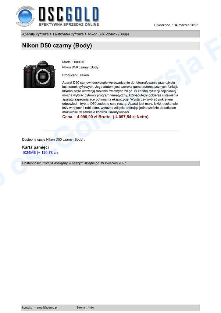 p Utworzono : 04 marzec 2017 Aparaty cyfrowe > Lustrzanki cyfrowe > Nikon D50 czarny (Body) F a Nikon D50 czarny (Body) Model : 000010 Nikon D50 czarny (Body) Producent : Nikon j s r e w Aparat D50 stanowi doskonałe wprowadzenie do fotografowania przy użyciu lustrzanek cyfrowych. Jego atutem jest szeroka gama automatycznych funkcji, które ułatwiają robienie świetnych zdjęć. W każdej sytuacji zdjęciowej można wybrać cyfrowy program tematyczny, który dobierze ustawienia aparatu zapewniające optymalną ekspozycję. Wystarczy wybrać pokrętłem odpowiedni tryb, a D50 zadba o całą resztę. Aparat jest mały, lekki, doskonale leży w rękach i robi ostre, wyraźne zdjęcia, oferując jednocześnie dodatkowe możliwości w zakresie kontroli i kreatywności. d l o Cena : 4.999,00 zł Brutto ( 4.097,54 zł Netto) G c Dostępne opcje Nikon D50 czarny (Body) : s o Karta pamięci 1024MB (+ 120,78 zł). Dostępność: Produkt dostępny w naszym sklepie od 19 kwiecień 2007 kontakt : - [email protected] Strona 1/{nb}
