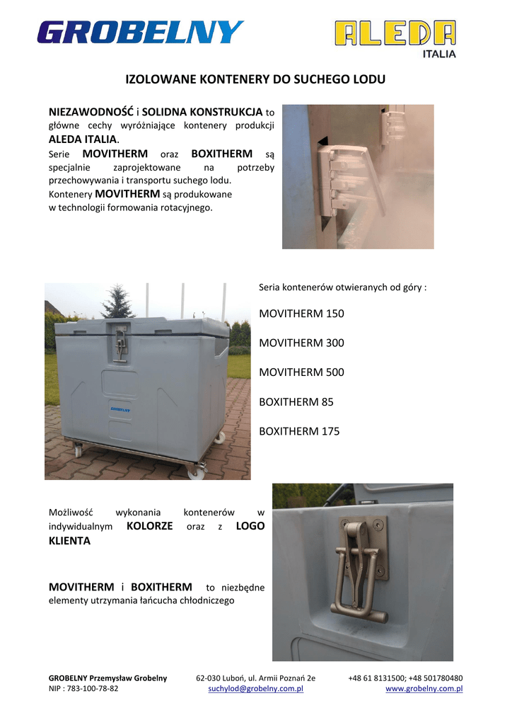 IZOLOWANE KONTENERY DO SUCHEGO LODU NIEZAWODNOŚĆ i SOLIDNA KONSTRUKCJA to główne cechy wyróżniające kontenery produkcji ALEDA ITALIA. Serie MOVITHERM oraz BOXITHERM są specjalnie zaprojektowane na potrzeby przechowywania i transportu suchego lodu. Kontenery MOVITHERM są produkowane w technologii formowania rotacyjnego. Seria kontenerów otwieranych od góry : MOVITHERM 150 MOVITHERM 300 MOVITHERM 500 BOXITHERM 85 BOXITHERM 175 Możliwość wykonania indywidualnym KOLORZE kontenerów w oraz z LOGO KLIENTA MOVITHERM i BOXITHERM to niezbędne elementy utrzymania łańcucha chłodniczego GROBELNY Przemysław Grobelny NIP : 783-100-78-82 62-030 Luboń, ul. Armii Poznań 2e [email protected] +48 61 8131500; +48 501780480 www.grobelny.com.pl KONTENERY MOVITHERM ….DROBNE SZCZEGÓŁY DECYDUJĄCE O CAŁOŚCI….. BRAK ZEWNĘTRZNYCH WZMOCNIEŃ Zewnętrzne stalowe wzmocnienia ulegają korozji oraz zniszczeniu podczas codziennej eksploatacji. Rozwiązanie ALEDA jest dużo pewniejsze! ZAWIASY I ZAMKI ZE STALI NERDZWENEJ Wszystkie elementy stalowe (zawiasy, zamki, śruby, mocowania kół) są wykonane ze stali nierdzewnej Długa żywotność, brak rdzy! WYTRZYMAŁOŚĆ Obudowa kontenera jest wykonana z polietylenu w technologii formowania rotacyjnego. Gładka powierzchnia bez zgrubień na narożnikach i krawędziach. Niezwykła wytrzymałość na uderzenia! ZINTEGROWANE WZMOCNIENIA ŚCIAN Ściany kontenera są wzmocnione wewnętrznie. Brak problemów z mostkami termicznymi! HIGIENA / CZYSZCZENIE / DEZYNFEKCJA Technologia formowania rotacyjnego, wymienna uszczelka sprawiają, że czyszczenie i dezynfekcja są bardzo proste. Łatwość czyszczenia! SPIENIANIE POLIURETANU Innowacyjna technologia wtryskiwania poliuretanu gwarantuje perfekcyjną izolację. Zgodność z regulacjami ATP. Wszystkie kontenery są wzmacniane izotermicznie. Perfekcyjne utrzymanie zimna! ŁATWOŚĆ UTRZYMANIA Standardowe części zamienne łatwo dostępne na rynku, łatwe do wymiany. Wsparcie zawsze blisko Ciebie! DRENAŻ, GŁADKA PODŁOGA Kontenery wyposażone w korek drenażu umożliwiający łatwe czyszczenie i osuszenie kontenera po myciu. Dno kontenera ma gładką powierzchnię ułatwiającą nabieranie lodu. Łatwość użytkowania! GROBELNY Przemysław Grobelny NIP : 783-100-78-82 62-030 Luboń, ul. Armii Poznań 2e [email protected] +48 61 8131500; +48 501780480 www.grobelny.com.pl DANE TECHNICZNE KONTENERÓW : MOVITHERM 150 Wymiary zewnętrzne Wymiary wewnętrzne Pojemność Masa netto Współczynnik K : 800 x 600 x 930 [mm] : 605 x 405 x 610 [mm] : 150 dm3 : 53 kg : 0,290 W/m2 MOVITHERM 300 Wymiary zewnętrzne Wymiary wewnętrzne Pojemność Masa netto Współczynnik K : 1000 x 800 x 930 [mm] : 805 x 605 x 610 [mm] : 300 dm3 : 80 kg : 0,285 W/m2 MOVITHERM 500 Wymiary zewnętrzne Wymiary wewnętrzne Pojemność Masa netto Współczynnik K : 1200 x 1000 x 930 [mm] : 1005 x 805 x 610 [mm] : 500 dm3 : 100 kg : 0,270 W/m2 BOXITHERM 85 Wymiary zewnętrzne Wymiary wewnętrzne Pojemność Masa netto : 800 x 480 x 550 [mm] : 610 x 340 x 410 [mm] : 85 dm3 : 18,5 kg BOXITHERM 175 Wymiary zewnętrzne Wymiary wewnętrzne Pojemność Masa netto : 800 x 600 x 750 [mm] : 630 x 450 x 610 [mm] : 173 dm3 : 28 kg Wymiary : długość / szerokość / wysokość Kontenery mogą być wykonane w następujących wersjach : - NOGI ZE STALI NIERDZEWNEJ - 4 KOŁA fi 100mm (2 stałe + 2 skrętne) - 4 KOŁA fi 100mm (2 stałe + 2 skrętne z hamulcem) - 4 KOŁA fi 100mm (4 skrętne, 2 z hamulcem) – nie dotyczy BOXITHERM GROBELNY Przemysław Grobelny NIP : 783-100-78-82 62-030 Luboń, ul. Armii Poznań 2e [email protected] +48 61 8131500; +48 501780480 www.grobelny.com.pl