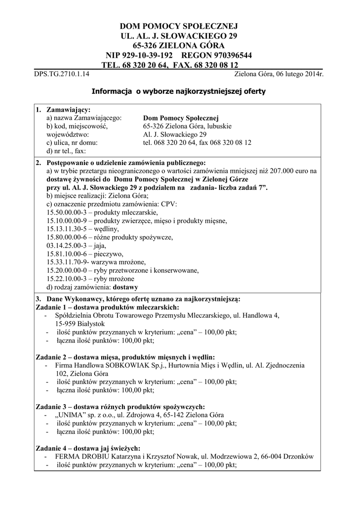 DOM POMOCY SPOŁECZNEJ UL. AL. J. SŁOWACKIEGO 29 65-326 ZIELONA GÓRA NIP 929-10-39-192 REGON 970396544 ________________TEL. 68 320 20 64, FAX. 68 320 08 12____________________ Zielona Góra, 06 lutego 2014r. DPS.TG.2710.1.14 Informacja o wyborze najkorzystniejszej oferty 1. Zamawiający: a) nazwa Zamawiającego: b) kod, miejscowość, województwo: c) ulica, nr domu: d) nr tel., fax: Dom Pomocy Społecznej 65-326 Zielona Góra, lubuskie Al. J. Słowackiego 29 tel. 068 320 20 64, fax 068 320 08 12 2. Postępowanie o udzielenie zamówienia publicznego: a) w trybie przetargu nieograniczonego o wartości zamówienia mniejszej niż 207.000 euro na dostawę żywności do Domu Pomocy Społecznej w Zielonej Górze przy ul. Al. J. Słowackiego 29 z podziałem na zadania- liczba zadań 7”. b) miejsce realizacji: Zielona Góra; c) oznaczenie przedmiotu zamówienia: CPV: 15.50.00.00-3 – produkty mleczarskie, 15.10.00.00-9 – produkty zwierzęce, mięso i produkty mięsne, 15.13.11.30-5 – wędliny, 15.80.00.00-6 – różne produkty spożywcze, 03.14.25.00-3 – jaja, 15.81.10.00-6 – pieczywo, 15.33.11.70-9- warzywa mrożone, 15.20.00.00-0 – ryby przetworzone i konserwowane, 15.22.10.00-3 – ryby mrożone d) rodzaj zamówienia: dostawy 3. Dane Wykonawcy, którego ofertę uznano za najkorzystniejszą: Zadanie 1 – dostawa produktów mleczarskich: - Spółdzielnia Obrotu Towarowego Przemysłu Mleczarskiego, ul. Handlowa 4, 15-959 Białystok - ilość punktów przyznanych w kryterium: „cena” – 100,00 pkt; - łączna ilość punktów: 100,00 pkt; Zadanie 2 – dostawa mięsa, produktów mięsnych i wędlin: - Firma Handlowa SOBKOWIAK Sp.j., Hurtownia Mięs i Wędlin, ul. Al. Zjednoczenia 102, Zielona Góra - ilość punktów przyznanych w kryterium: „cena” – 100,00 pkt; - łączna ilość punktów: 100,00 pkt; Zadanie 3 – dostawa różnych produktów spożywczych: - „UNIMA” sp. z o.o., ul. Zdrojowa 4, 65-142 Zielona Góra - ilość punktów przyznanych w kryterium: „cena” – 100,00 pkt; - łączna ilość punktów: 100,00 pkt; Zadanie 4 – dostawa jaj świeżych: - FERMA DROBIU Katarzyna i Krzysztof Nowak, ul. Modrzewiowa 2, 66-004 Drzonków - ilość punktów przyznanych w kryterium: „cena” – 100,00 pkt; - łączna ilość punktów: 100,00 pkt; Zadanie 5 – dostawa pieczywa: - Przedsiębiorstwo Piekarniczo-Cukiernicze „DANA” S.C., Albert Lebel, Przemysław Lebel, ul. Mieszka I 1a, 66-600 Krosno Odrzańskie - ilość punktów przyznanych w kryterium: „cena” – 100,00 pkt; - łączna ilość punktów: 100,00 pkt; Zadanie 6 – dostawa mrożonek warzywno-owocowych: - IceQB Sp. z o.o., ul. gen. J. Sowińskiego 2/4, 65-419 Zielona Góra - ilość punktów przyznanych w kryterium: „cena” – 100,00 pkt; - łączna ilość punktów: 100,00 pkt; Zadanie 7 – dostawa ryb i przetworów rybnych: - REN sp. z o.o., ul. Trasa Północna 3, 65-001 Zielona Góra - ilość punktów przyznanych w kryterium: „cena” – 100,00 pkt; - łączna ilość punktów: 100,00 pkt; 4. Uzasadnienie wyboru wykonawcy: Wykonawcy spełniają warunki udziału w postępowaniu a ich oferty są zgodne z ustawą z dnia 29 stycznia 2004r. Prawo zamówień publicznych (tekst jednolity Dz. U. z 2013r., poz. 907 ze zmianami) i Specyfikacją Istotnych Warunków Zamówienia oraz są najkorzystniejsze i uzyskały najwyższą liczbę punktów tj. 100 pkt w oparciu o kryteria wyboru i oceny ofert – „cena 100%.” 5. Dane o wykonawcach, którzy złożyli oferty: Zadanie 1 1) Oferta nr 5 złożona przez: - Spółdzielnia Obrotu Towarowego Przemysłu Mleczarskiego, ul. Handlowa 4, 15-959 Białystok; - ilość punktów przyznanych w kryterium: „cena” – 100,00 pkt; - łączna ilość punktów: 100,00 pkt; 2) Oferta nr 15 złożona przez: - Przedsiębiorstwo Handlowe „Vima” sp. z o.o., ul. 22 lipca 86a, 66-015 Przylep; - ilość punktów przyznanych w kryterium: „cena” – 92,79 pkt; - łączna ilość punktów: 92,79 pkt; Zadanie 2 1) Oferta nr 6 złożona przez: - Firma Handlowa SOBKOWIAK Sp.j., Hurtownia Mięs i Wędlin, ul. Al. Zjednoczenia 102, Zielona Góra - ilość punktów przyznanych w kryterium: „cena” – 100,00 pkt; - łączna ilość punktów: 100,00 pkt; 2) Oferta nr 9 złożona przez: - ZAKŁAD MIĘSNY RZEŹNIK Dariusz Feliński, Grzegorz Hutnik sp.j., ul. Tuwima 12, Niedoradz, 67-106 Otyń; - ilość punktów przyznanych w kryterium: „cena” – 92,83 pkt; - łączna ilość punktów: 92,83 pkt; Zadanie 3 1) Oferta nr 4 złożona przez: - Przedsiębiorstwo Produkcyjno – Handlowe „POLARIS” Małgorzata Gruszczyńska, 2 ul. Żołnierska 20a, 62-800 Kalisz; - ilość punktów przyznanych w kryterium: „cena” – 94,46 pkt; - łączna ilość punktów: 94,46 pkt; 2) Oferta nr 10 złożona przez: - „UNIMA” sp. z o.o. w Warszawie, Hurtownia Artykułów Spożywczych, ul. Zdrojowa 4, 65-142 Zielona Góra; - ilość punktów przyznanych w kryterium: „cena” – 100,00 pkt; - łączna ilość punktów: 100,00 pkt; Zadanie 4 1) Oferta nr 1 złożona przez: - FERMA DROBIU Kinga Firlej – Gąsiorowska, ul. Markiewiczowej 11, 67-106 Niedoradz; - ilość punktów przyznanych w kryterium: „cena” – 92,44 pkt; - łączna ilość punktów: 92,44 pkt; 2) Oferta nr 4 złożona przez: - Przedsiębiorstwo Produkcyjno – Handlowe „POLARIS” Małgorzata Gruszczyńska, ul. Żołnierska 20a, 62-800 Kalisz; - ilość punktów przyznanych w kryterium: „cena” – 71,74 pkt; łączna ilość punktów: 71,74 pkt; 3) Oferta nr 10 złożona przez: - „UNIMA” sp. z o.o. w Warszawie, Hurtownia Artykułów Spożywczych, ul. Zdrojowa 4, 65-142 Zielona Góra; - ilość punktów przyznanych w kryterium: „cena” – 78,57 pkt; - łączna ilość punktów: 78,57 pkt; 4) Oferta nr 16 złożona przez: - Ferma Drobiu Katarzyna i Krzysztof Nowak, ul. Modrzewiowa 2, 66-004 Drzonków; - ilość punktów przyznanych w kryterium: „cena” – 100,00 pkt; - łączna