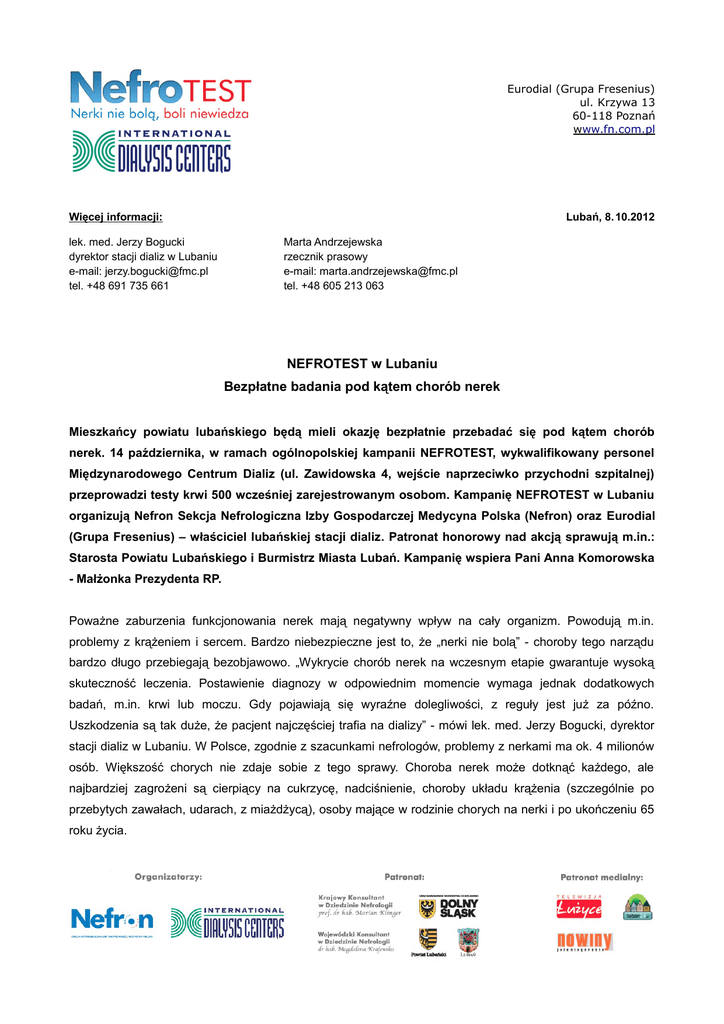 Eurodial (Grupa Fresenius) ul. Krzywa 13 60-118 Poznań www.fn.com.pl Więcej informacji: lek. med. Jerzy Bogucki dyrektor stacji dializ w Lubaniu e-mail: [email protected] tel. +48 691 735 661 Lubań, 8. 10.2012 Marta Andrzejewska rzecznik prasowy e-mail: [email protected] tel. +48 605 213 063 NEFROTEST w Lubaniu Bezpłatne badania pod kątem chorób nerek Mieszkańcy powiatu lubańskiego będą mieli okazję bezpłatnie przebadać się pod kątem chorób nerek. 14 października, w ramach ogólnopolskiej kampanii NEFROTEST, wykwalifikowany personel Międzynarodowego Centrum Dializ (ul. Zawidowska 4, wejście naprzeciwko przychodni szpitalnej) przeprowadzi testy krwi 500 wcześniej zarejestrowanym osobom. Kampanię NEFROTEST w Lubaniu organizują Nefron Sekcja Nefrologiczna Izby Gospodarczej Medycyna Polska (Nefron) oraz Eurodial (Grupa Fresenius) – właściciel lubańskiej stacji dializ. Patronat honorowy nad akcją sprawują m.in.: Starosta Powiatu Lubańskiego i Burmistrz Miasta Lubań. Kampanię wspiera Pani Anna Komorowska - Małżonka Prezydenta RP. Poważne zaburzenia funkcjonowania nerek mają negatywny wpływ na cały organizm. Powodują m.in. problemy z krążeniem i sercem. Bardzo niebezpieczne jest to, że „nerki nie bolą” - choroby tego narządu bardzo długo przebiegają bezobjawowo. „Wykrycie chorób nerek na wczesnym etapie gwarantuje wysoką skuteczność leczenia. Postawienie diagnozy w odpowiednim momencie wymaga jednak dodatkowych badań, m.in. krwi lub moczu. Gdy pojawiają się wyraźne dolegliwości, z reguły jest już za późno. Uszkodzenia są tak duże, że pacjent najczęściej trafia na dializy” - mówi lek. med. Jerzy Bogucki, dyrektor stacji dializ w Lubaniu. W Polsce, zgodnie z szacunkami nefrologów, problemy z nerkami ma ok. 4 milionów osób. Większość chorych nie zdaje sobie z tego sprawy. Choroba nerek może dotknąć każdego, ale najbardziej zagrożeni są cierpiący na cukrzycę, nadciśnienie, choroby układu krążenia (szczególnie po przebytych zawałach, udarach, z miażdżycą), osoby mające w rodzinie chorych na nerki i po ukończeniu 65 roku życia. Eurodial (Grupa Fresenius) ul. Krzywa 13 60-118 Poznań www.fn.com.pl Celem kampanii NEFROTEST jest uświadomienie Polakom, jak ważne są regularne badania pod kątem chorób nerek. „Bezpłatne testy krwi są kulminacyjnym momentem NEFROTESTU, ale to nie jedyne działanie prowadzone w ramach kampanii. Bardzo ważna jest dla nas akcja informacyjna prowadzona przy pomocy mediów i z wykorzystaniem naszych własnych materiałów. Chcemy docierać do jak największej liczby osób i przypominać, że większość chorób nerek możemy wyleczyć – pod warunkiem, że zostaną wcześnie wykryte” - tłumaczy Dariusz Aksamit, prezes Nefron Sekcji Nefrologicznej Izby Gospodarczej Medycyna Polska. Warunkiem uczestnictwa w bezpłatnych badaniach krwi podczas lubańskiego NEFROTESTU jest wcześniejsza rejestracja. Zapisy prowadzone będą 10 i 11 października w godz. 9:00-15:00 pod dwoma numerami telefonów: 515 656 848 i 515 656 858 (wymagany będzie numer PESEL). "Badaniami obejmujemy wyłącznie osoby pełnoletnie. Każdego chętnego zarejestrujemy na konkretną godzinę. Przypomnę też, że testu nie trzeba wykonywać na czczo" – mówi mgr Elżbieta Cepuchowicz, pielęgniarka oddziałowa stacji dializ w Lubaniu. Lubań jest dziewiątym miastem, w którym organizowany jest NEFROTEST. W poprzednich akcjach (w Świebodzinie, Zgierzu, Wodzisławiu Śląskim, Ostródzie, Legnicy, Białymstoku, Pszczynie i Płońsku) krew zbadało niemal 6 tys. osób. W każdym z miast wyniki około 10 proc. badanych były niezgodne z normami. Wszyscy, którzy wymagali szczegółowych konsultacji, zostali skierowani na dalszą diagnostykę. Kampanię NEFROTEST w Lubaniu organizują Nefron Sekcja Nefrologiczna Izby Gospodarczej Medycyna Polska oraz Międzynarodowe Centrum Dializ w Lubaniu. NEFROTEST w powiecie objęli patronatem naukowym prof. Marian Klinger - Krajowy Konsultant w Dziedzinie Nefrologii oraz prof. Magdalena Krajewska – Wojewódzki Konsultant w Dziedzinie Nefrologii dla woj. dolnośląskiego. Patronat honorowy nad akcją sprawują: Starosta Powiatu Lubańskiego i Burmistrz Miasta Lubań. * Nefron Sekcja Nefrologiczna Izby Gospodarczej Medycyna Polska powstała w czerwcu 2008 roku. Dziś zrzesza operatorów niemal 160 publicznych i niepublicznych stacji dializ w Polsce. Przy Sekcji powołano Komitet Naukowy, składający się z wybitnych przedstawicieli środowiska nefrologicznego w kraju.