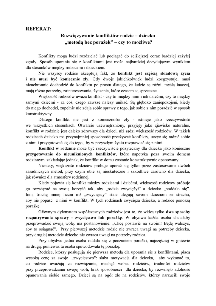 REFERAT: Rozwiązywanie konfliktów rodzic – dziecko „metodą bez porażek” – czy to możliwe? Konflikty mogą ludzi rozdzielać lub pociągać do ściślejszej coraz bardziej zażyłej zgody. Sposób uporania się z konfliktami jest może najbardziej decydującym wynikiem dla stosunków między rodzicami i dzieckiem. Nie wszyscy rodzice akceptują fakt, że konflikt jest częścią składową życia i nie musi być koniecznie zły. Gdy dwoje jakichkolwiek ludzi koegzystuje, musi nieuchronnie dochodzić do konfliktu po prostu dlatego, że ludzie są różni, myślą inaczej, mają różne potrzeby, zainteresowania, życzenia, które czasem są sprzeczne. Większość rodziców uważa konflikt - czy to między nimi i ich dziećmi, czy to między samymi dziećmi - za coś, czego zawsze należy unikać. Są głęboko zaniepokojeni, kiedy do niego dochodzi, zupełnie nie zdają sobie sprawy z tego, jak sobie z nim poradzić w sposób konstruktywny. Dlatego konflikt nie jest z konieczności zły - istnieje jako rzeczywistość we wszystkich stosunkach. Otwarcie uzewnętrzniony, przyjęty jako zjawisko naturalne, konflikt w rodzinie jest daleko zdrowszy dla dzieci, niż sądzi większość rodziców. W takich rodzinach dziecko ma przynajmniej sposobność przeżywać konflikty, uczyć się radzić sobie z nimi i przygotować się do tego, by w przyszłym życiu rozprawiać się z nimi. Konflikt w rodzinie może być rzeczywiście pożyteczny dla dziecka jako konieczne przygotowanie do nieuniknionych konfliktów, które napotyka poza swoim domem rodzinnym, zakładając jednak, że konflikt w domu zostanie konstruktywnie opanowany. Niestety, większość rodziców próbuje uporać się tylko przez zastosowanie dwóch zasadniczych metod, przy czym obie są nieskuteczne i szkodliwe zarówno dla dziecka, jak również dla atmosfery rodzinnej. Kiedy pojawia się konflikt między rodzicami i dziećmi, większość rodziców próbuje go rozwiązać na swoją korzyść tak, aby „rodzic zwyciężył” a dziecko „poddało się”. Inni, trochę mniej liczni niż „zwycięzcy” stale ulegają swoim dzieciom ze strachu, aby nie popaść z nimi w konflikt. W tych rodzinach zwycięża dziecko, a rodzice ponoszą porażkę. Głównym dylematem współczesnych rodziców jest to, że widzą tylko dwa sposoby rozpatrywania sprawy - zwycięstwo lub porażkę. W obydwu każda osoba chciałaby przeprowadzić swoją wolę, ma postanowienie: „Chcę postawić na swoim! Będę walczyć, aby to osiągnąć". Przy pierwszej metodzie rodzic nie zwraca uwagi na potrzeby dziecka, przy drugiej metodzie dziecko nie zwraca uwagi na potrzeby rodzica. Przy obydwu jedna osoba oddala się z poczuciem porażki, najczęściej w gniewie na drugą, ponieważ ta osoba spowodowała tę porażkę. Rodzice, którzy posługują się pierwszą metodą dla uporania się z konfliktami, płacą wysoką cenę za swoje „zwycięstwo": słaba motywacja dla dziecka, aby wykonać to, co rodzice uważają za rozwiązanie, niechęć wobec rodziców, trudności rodziców przy przeprowadzaniu swojej woli, brak sposobności dla dziecka, by rozwinęło zdolność opanowania siebie samego. Dzieci są na ogół złe na rodziców, którzy narzucili swoje rozwiązanie. Mają poczucie niesprawiedliwości i ich złość oraz niechęć kieruje się naturalnie przeciw rodzicom. Dzieci, którym wolno postawić na swoim, nie są tak uparte, agresywne, uległe i podlizujące się. Nie były zmuszone do tego, by zmierzyć się z władzą własnych rodziców. Druga metoda zachęca dziecko do tego, aby posłużyło się własną władzą nad rodzicami, aby zwyciężyć ich kosztem. Uczą się, jak dostać napadów wściekłości, aby dominować nad rodzicami, jak wywołać u któregoś z rodziców poczucie winy, jak mówić rodzicom brzydkie, lekceważące słowa. Są często nieopanowane, niesforne, impulsywne. Nauczyły się, że ich potrzeby są ważniejsze niż kogoś drugiego. Często brak im wewnętrznej kontroli nad swoim zachowaniem, są samolubne i pełne pretensji. Często nie biorą pod uwagę uczuć innych ludzi. „Ja” stoi na pierwszym miejscu. Rzadko współpracują w domu i rzadko są gotowe do pomocy, w stosunkach z rówieśnikami mają często trudności. Niewielu rodziców posługuje się wyłącznie pierwszą albo drugą metodą. W wielu rodzinach jedno z rodziców zdaje się w wysokim stopniu na pierwszą metodę, podczas gdy druga osoba skłania się ku drugiej metodzie. Istnieje kilka oznak tego, że dzieci wychowane w tego rodzaju rodzinie mają jeszcze większą szansę, aby nabawić się trudności emocjonalnych. Niekonsekwencja jest może bardziej szkodliwa niż skrajność jednego lub drugiego nastawienia. Dla rodziców, zniewolonych tradycją stosowania władzy wychowawczej w metodach zwycięstwa i porażki, uzyskanie innej możliwości wydaje się nieomal objawieniem. Z ogromną ulgą dowiadują się o istnieniu trzeciej możliwości. To trzecie wyjście stanowi rozwiązanie konfliktów „metodą bez porażek”, której twórcą i propagatorem jest Tomas Gordon. Metoda ta nie wymaga ani od rodziców, ani ze strony dziecka stosowania siły. Rodzice i dzieci nie walczą przeciwko sobie, zamiast tego współpracują ze sobą nad wykonaniem wspólnego zadania. Metoda wychowania „bez porażek” opiera się na sześciu krokach: Krok 1. Rozpoznać konflikt i nazwać go. Jest to faza decydująca, jeśli rodzice chcą wciągnąć dziecko w rozwiązywanie problemów. Dziecko musi wiedzieć, że powstał konflikt, który trzeba rozwiązać. Należy wypowiedzieć się w pierwszej osobie, unikać zdań, które upokarzają dziecko. Dzieci muszą wiedzieć, że dewizą tej gry jest zasada: „bez porażek i pokonanych, a nie zwycięzca – pokonany w nowym przebraniu”. Krok 2. Rozwinąć możliwości rozwiązań. Najpierw należy od dzieci wydobyć różne rozwiązania. Własne propozycje dodają rodzice później. Nie należy